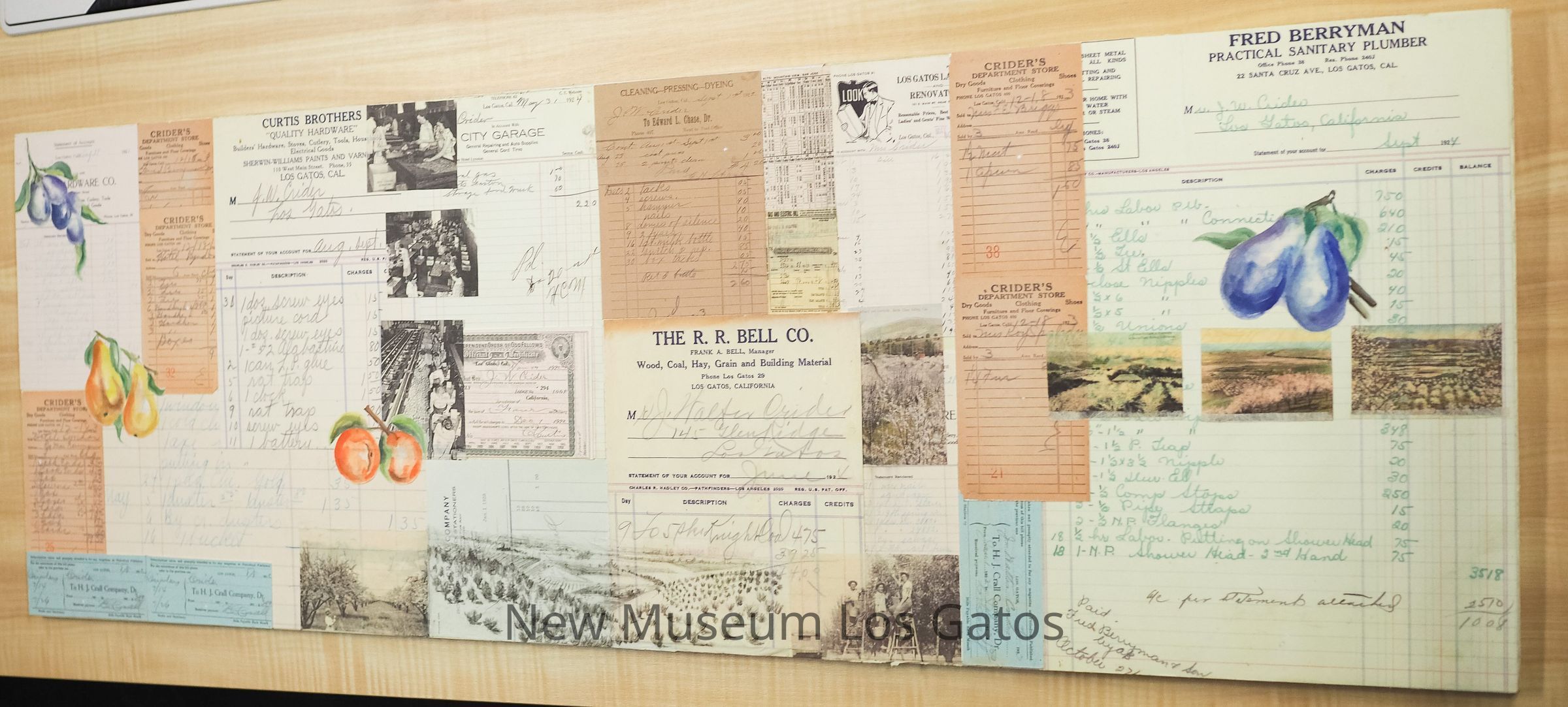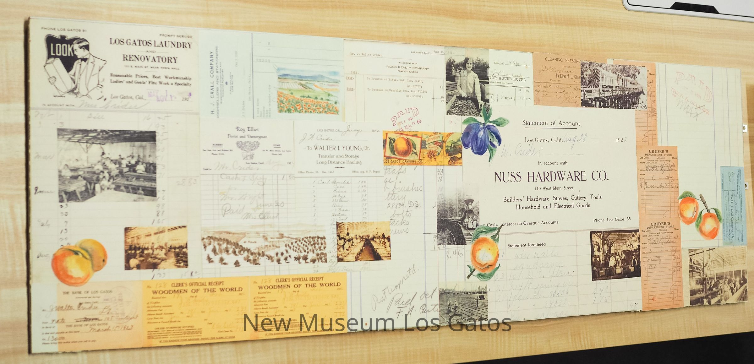 A mixed media art piece, on wood panel. A timeline depicting historic industries of Los Gatos such as agriculture, lumber, and hauling through a collage of watercolor, photographs, and ephemera.Artwork Details