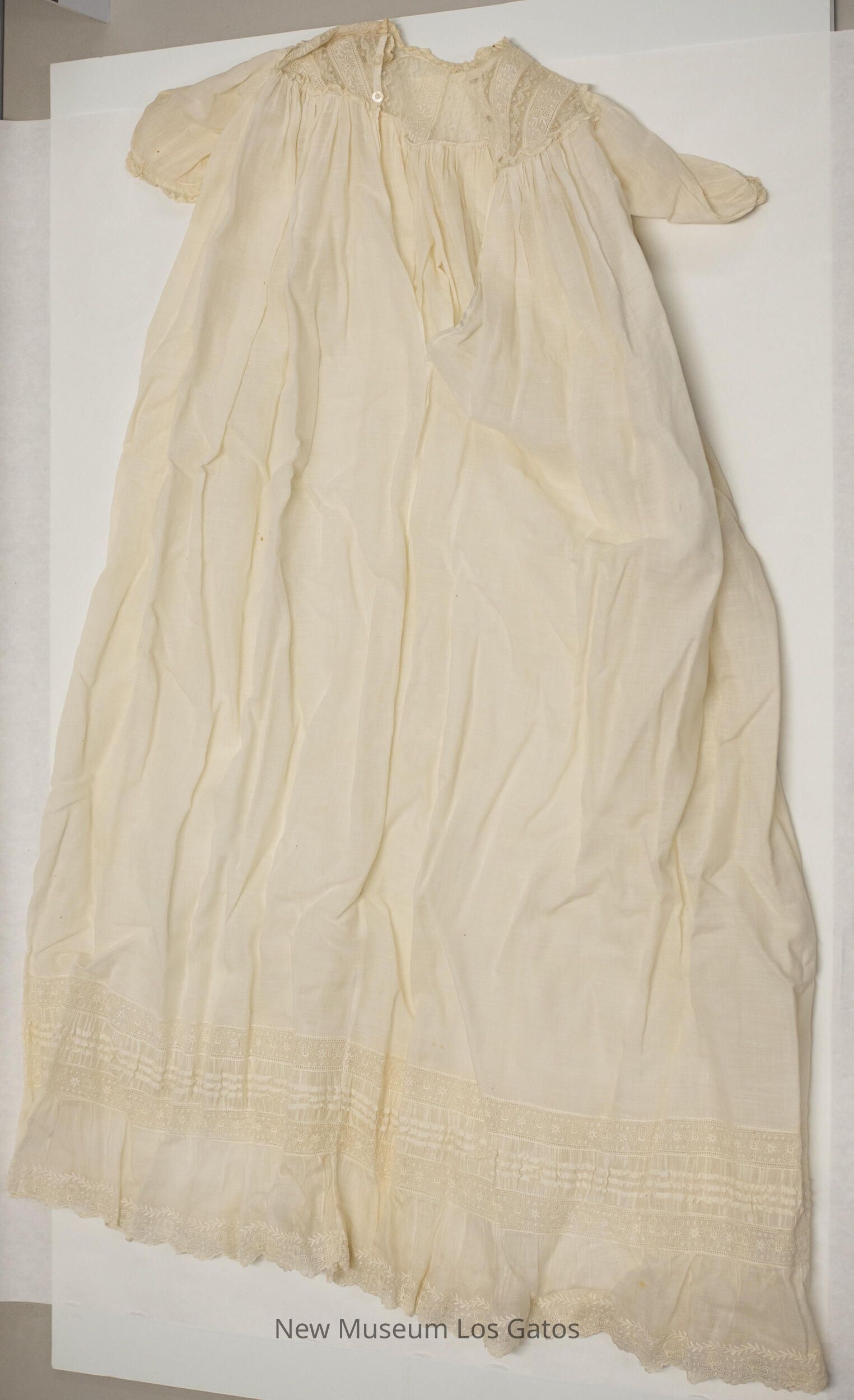 A small, white, long linen dress. There is an embroidered leaf and eyelet bow decorative pattern along the hem of the dress, as well as in two horizontal bands towards the bottom of the skirt. In between those two bands are three small horizontal ruffles. The chest area consists of sheer lace with vertical stripes of the embroidered leaf and eyelet bow pattern. The dress opens in the back, and closes with three small white, iridescent buttons.Collection