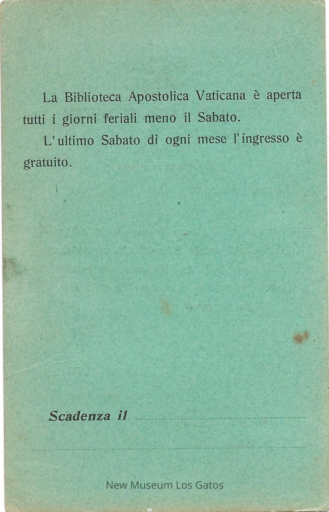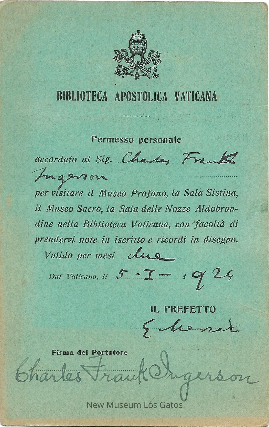 Access card for Frank Ingerson to the Vatican Apostolic Library.