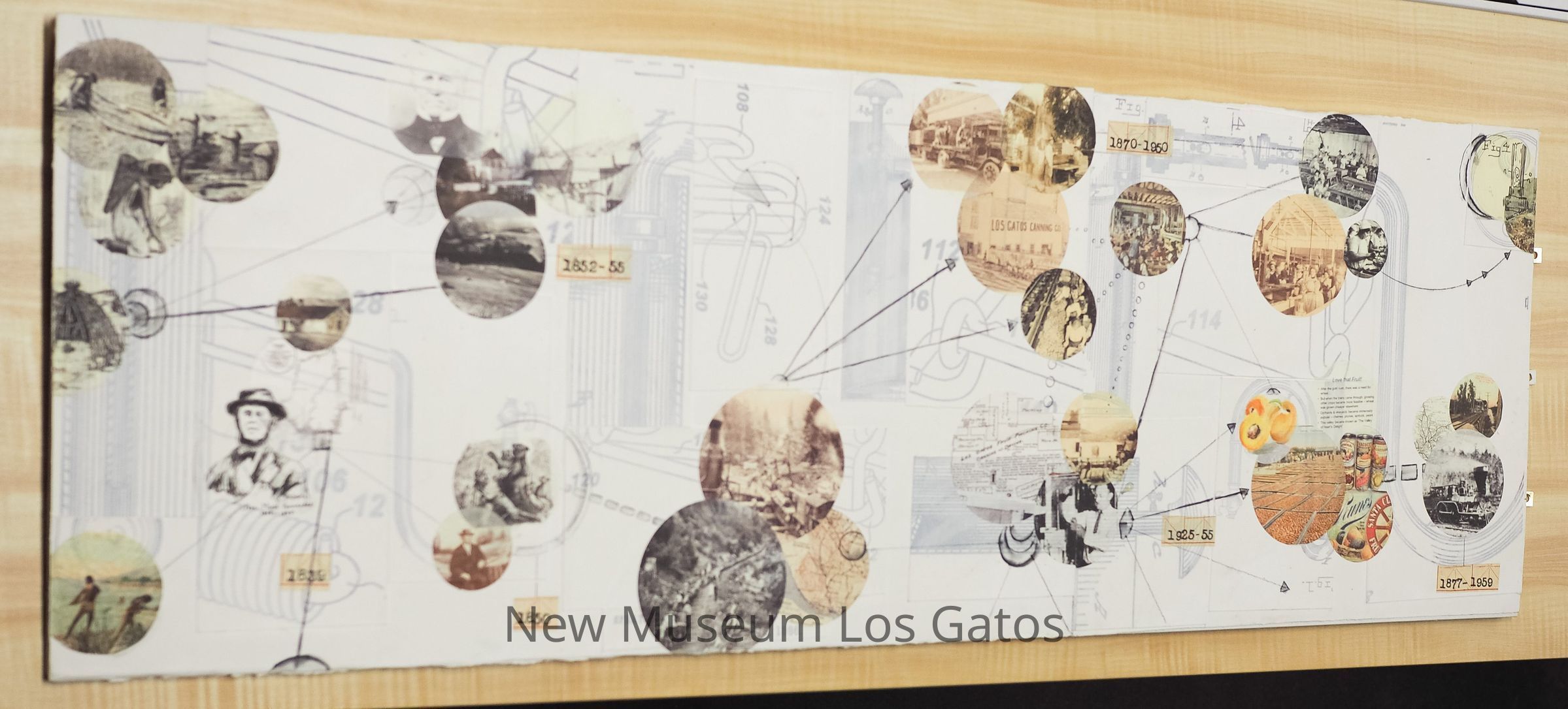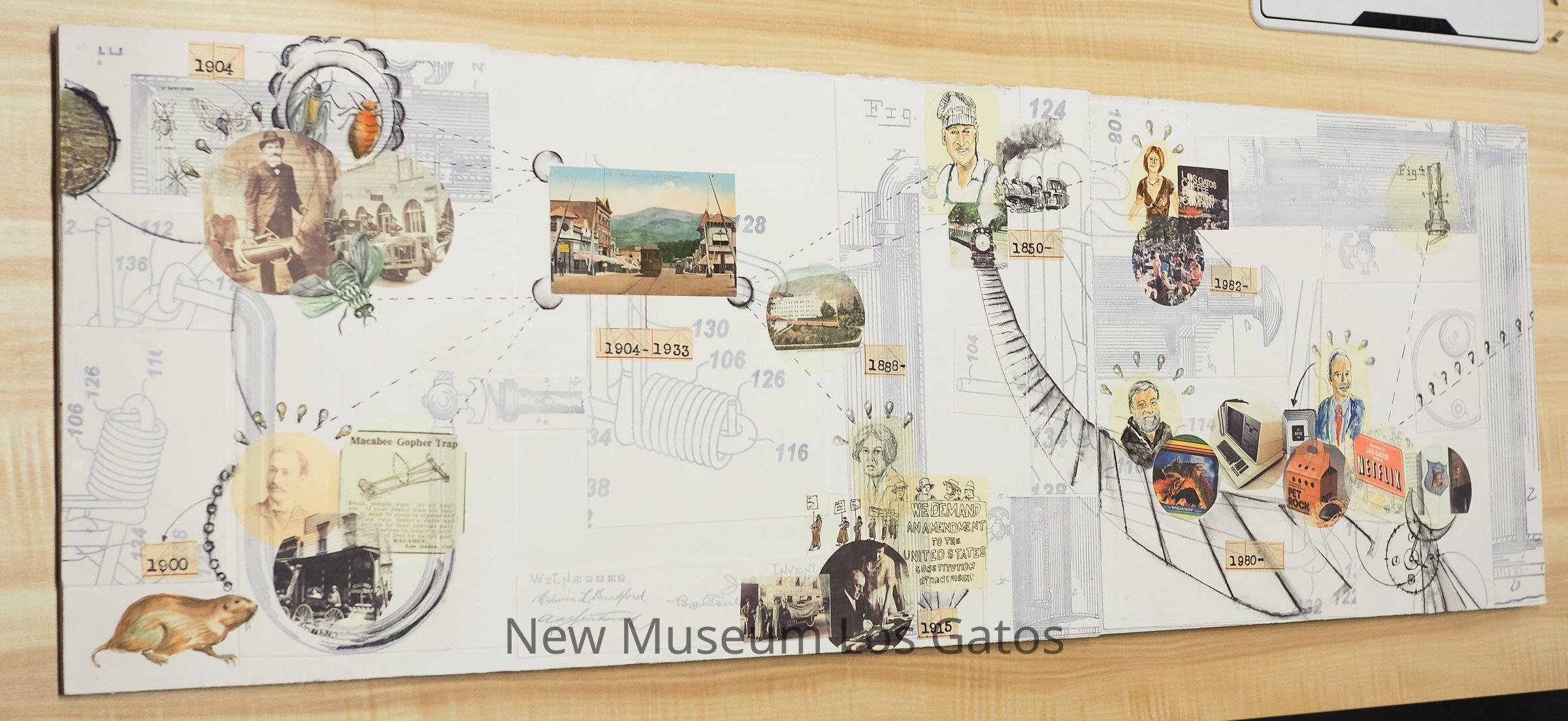 A mixed media art piece, on wood panel. A timeline depicting the history and significant innovators of Los Gatos through a collage of portraits, photos, and dates.Artwork Details