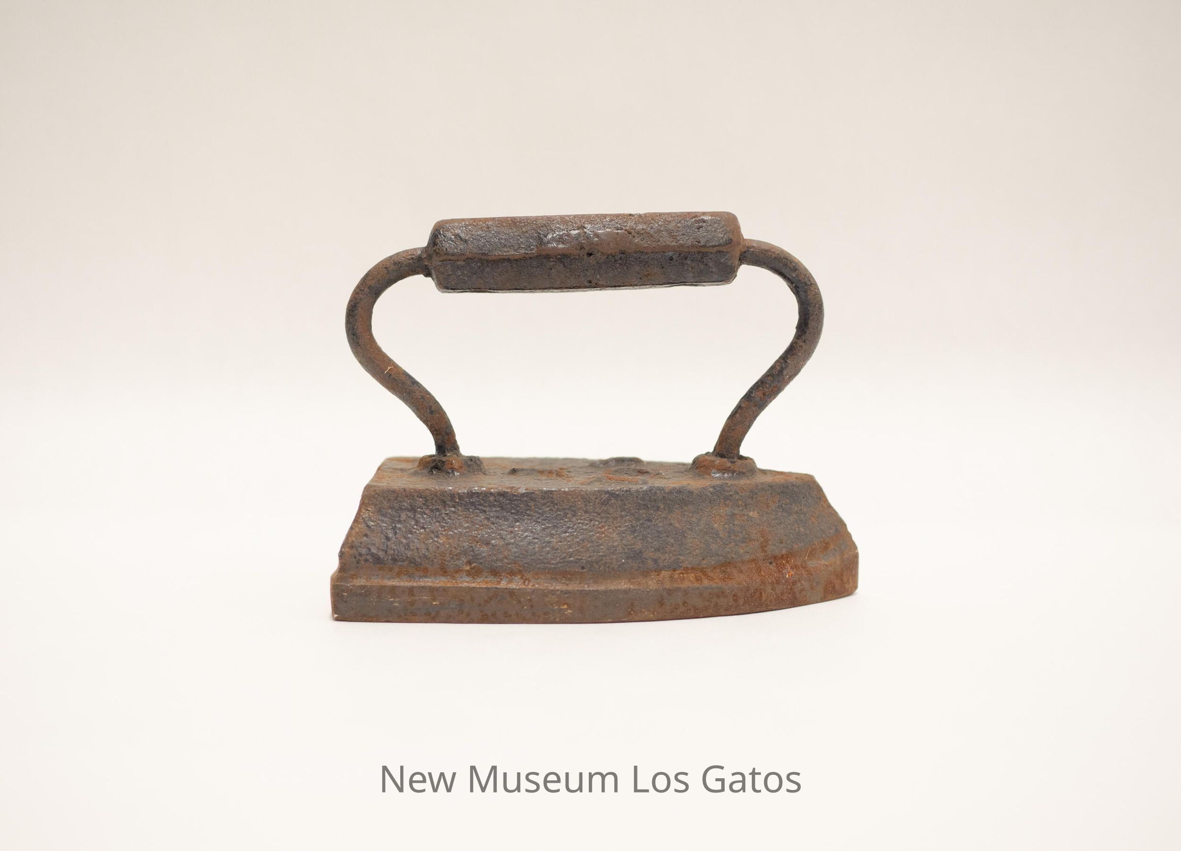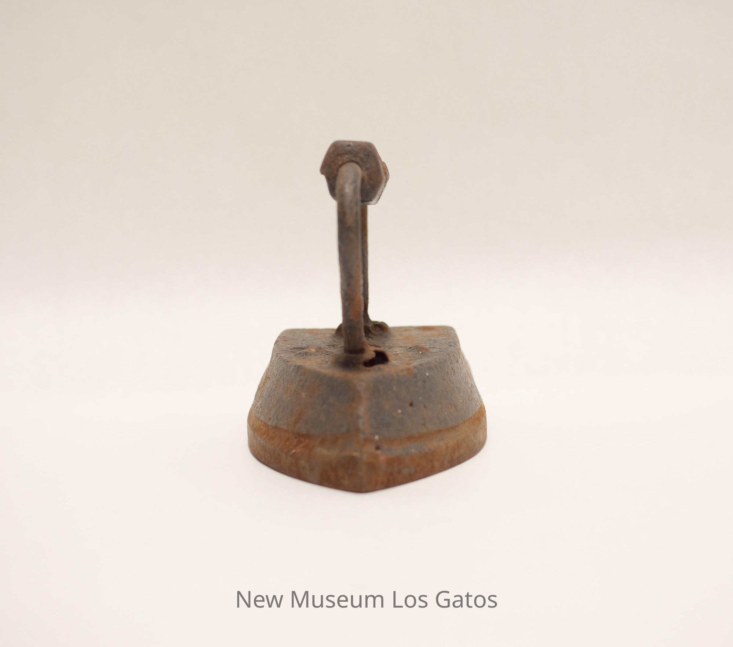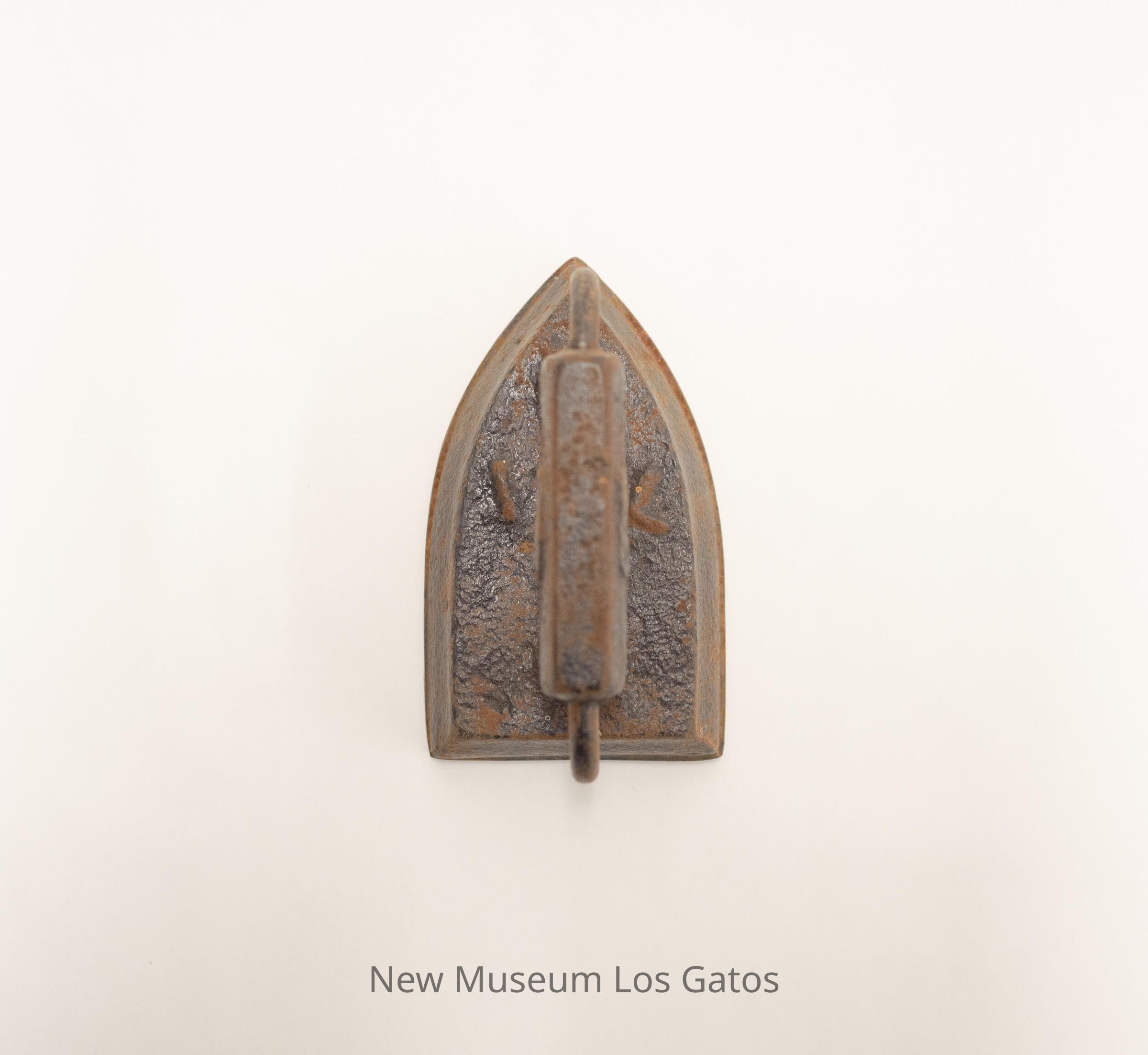 A heavy iron with an attached handle. Both iron and handle are made from metal, most likely cast iron.
