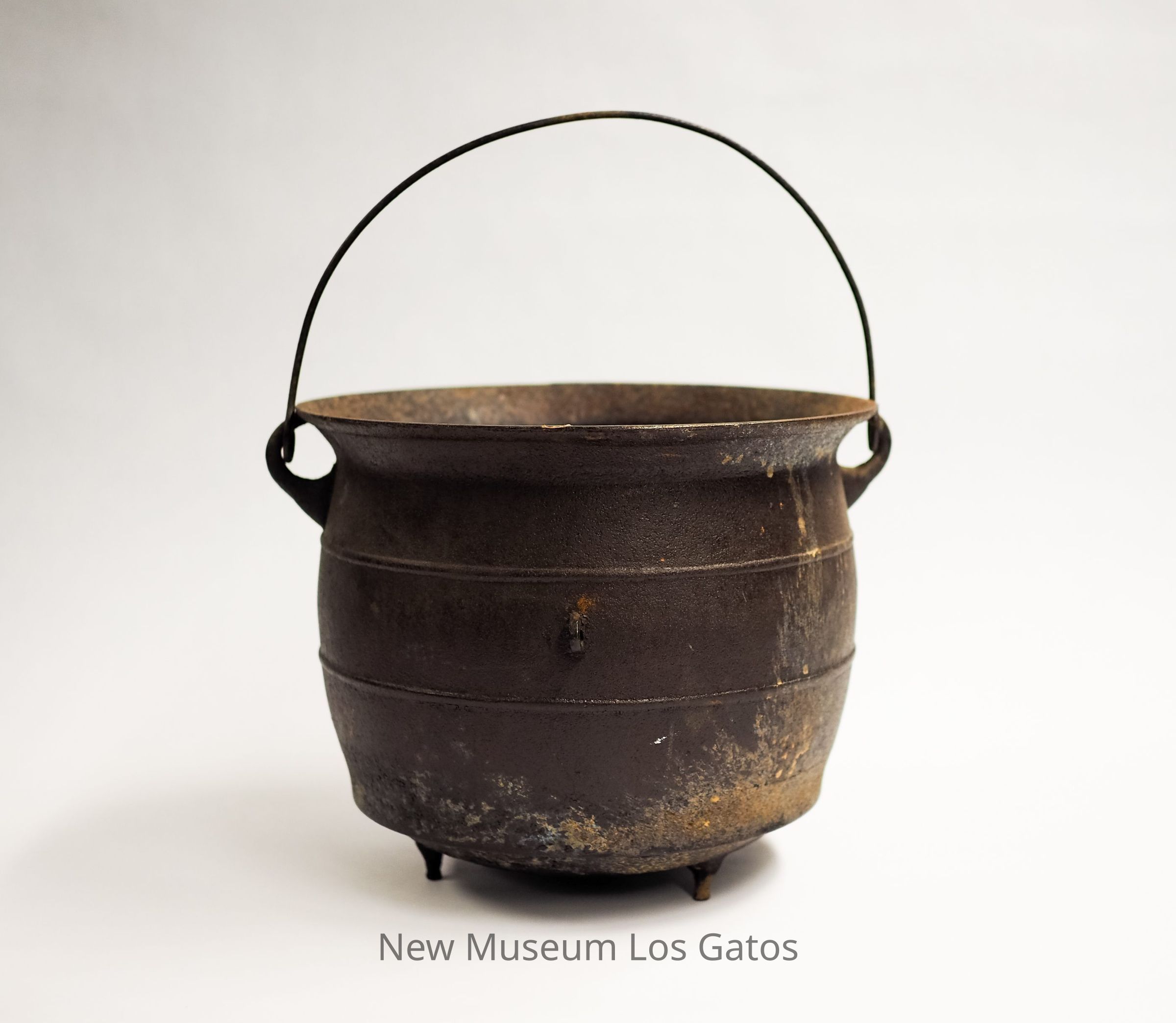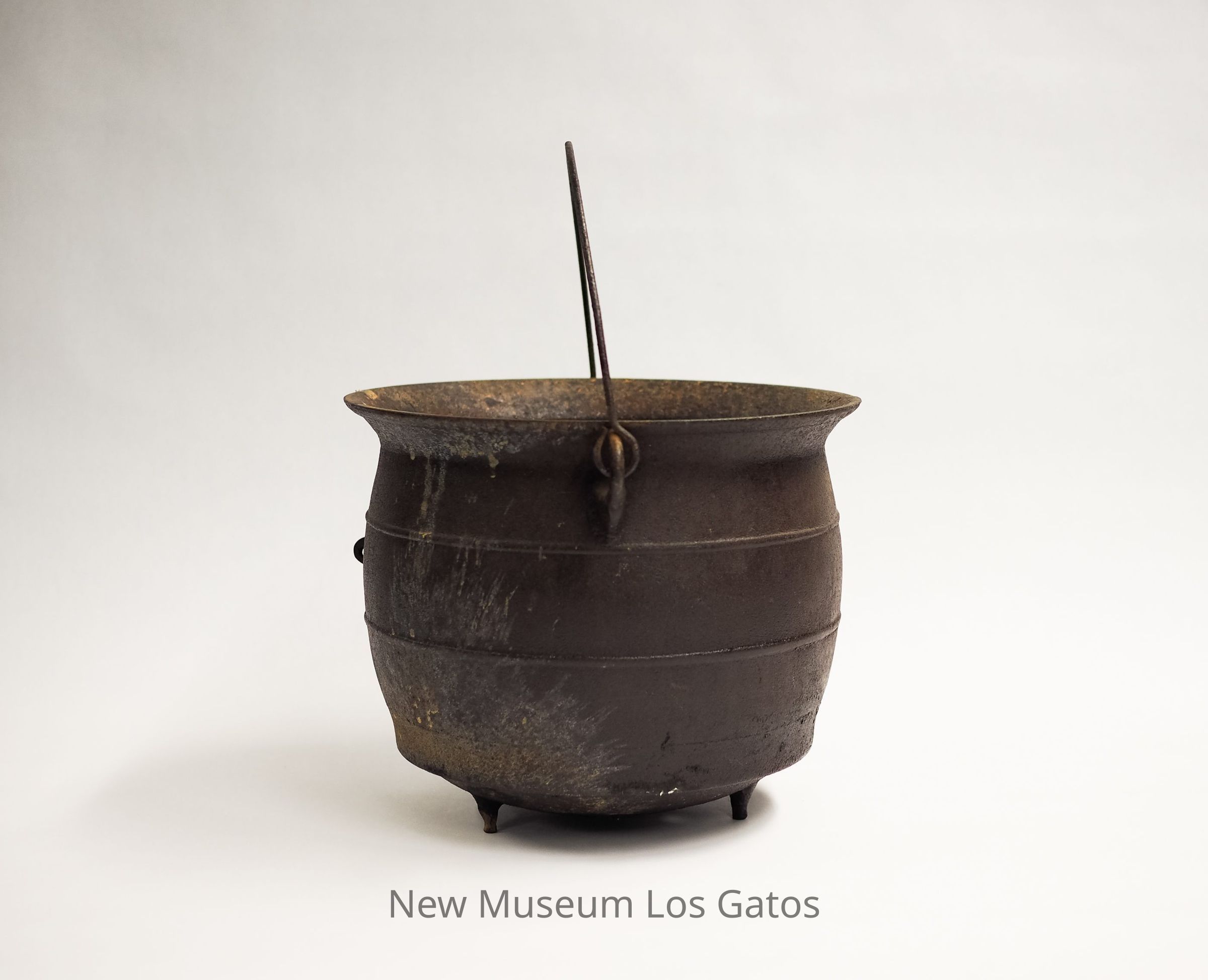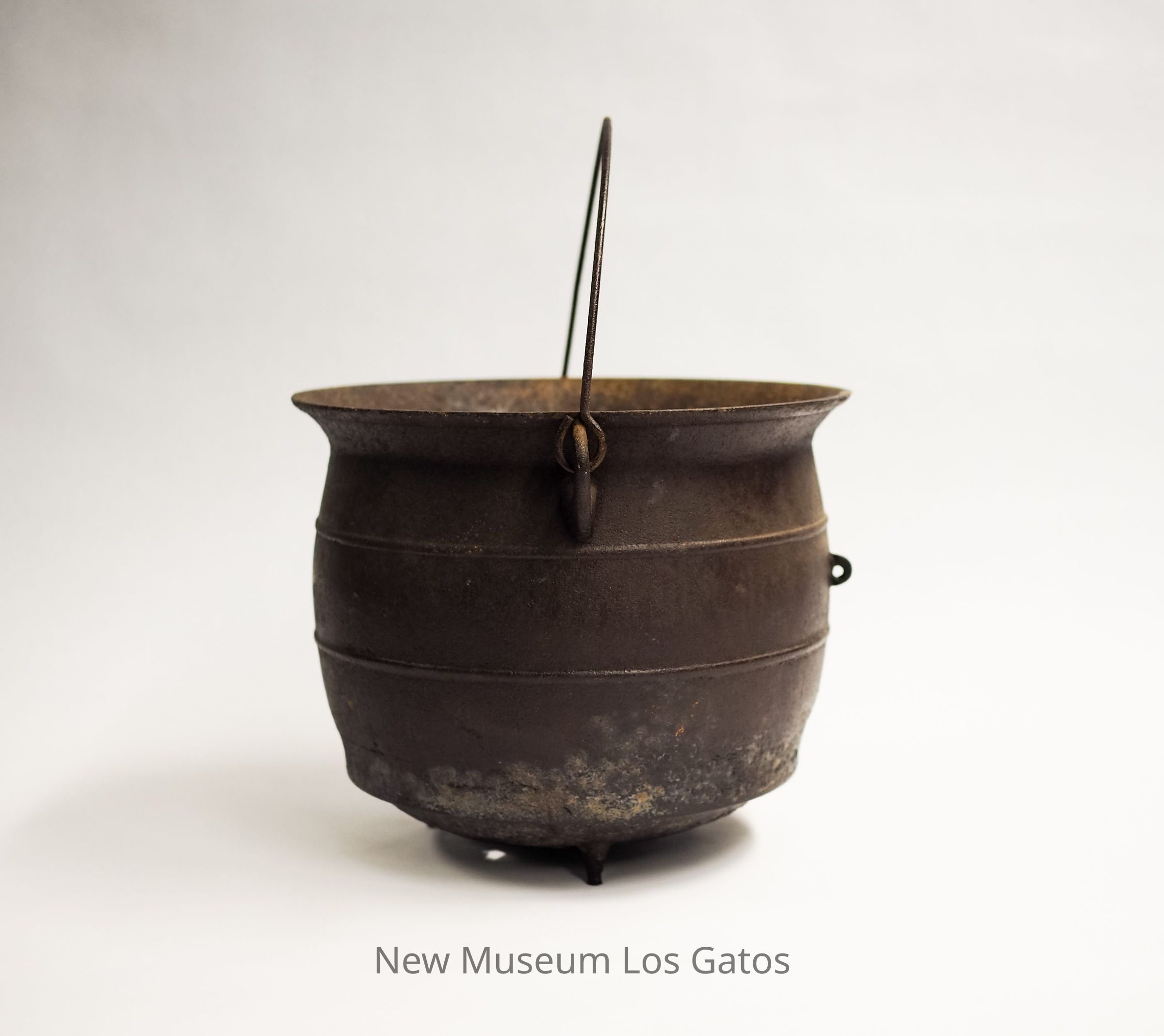 A large, three-legged iron kettle. The legs are short, and there are two circular bands around the circumference of the pot. There is also a thin iron handle attached to both sides of the potCollection