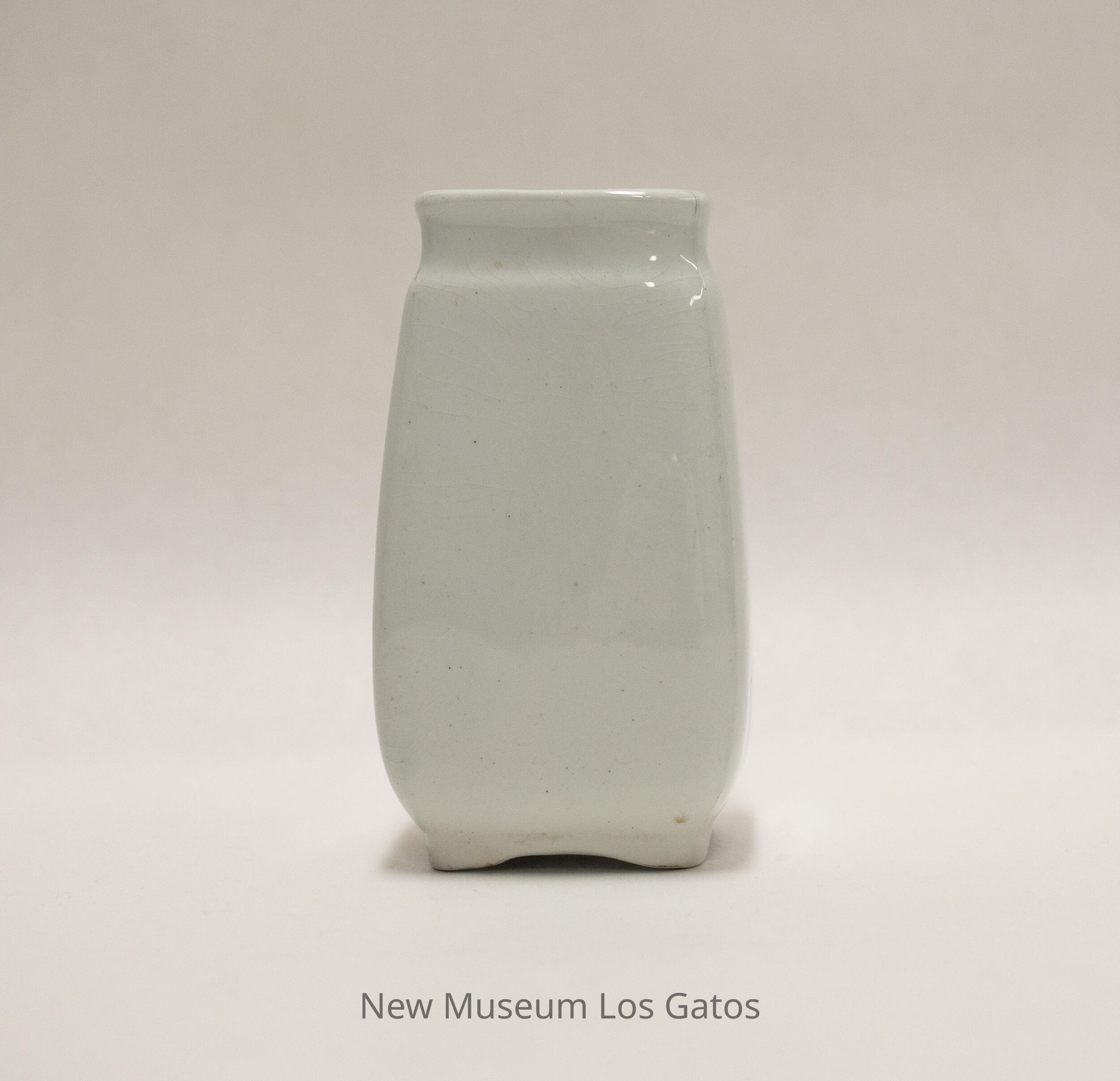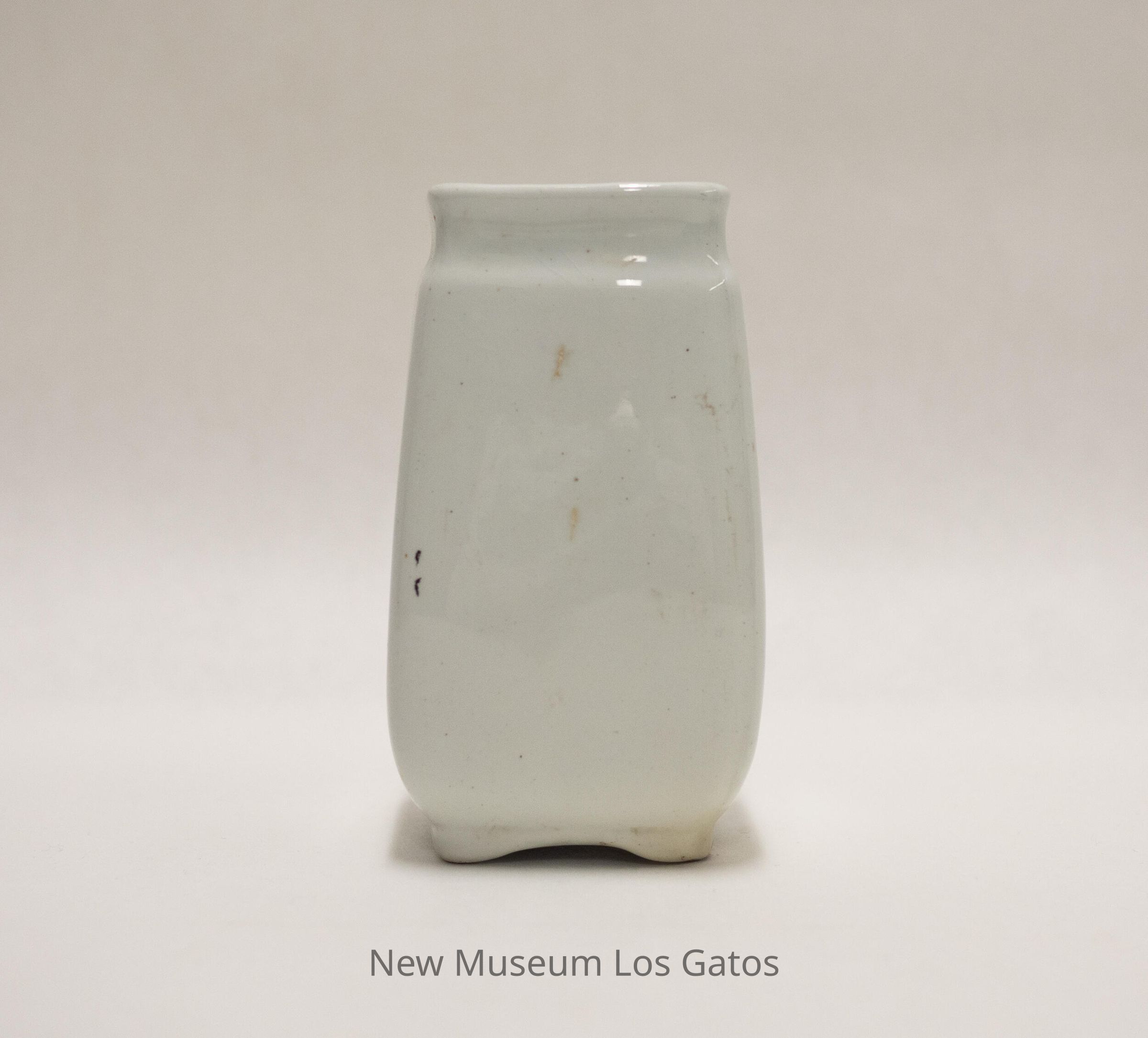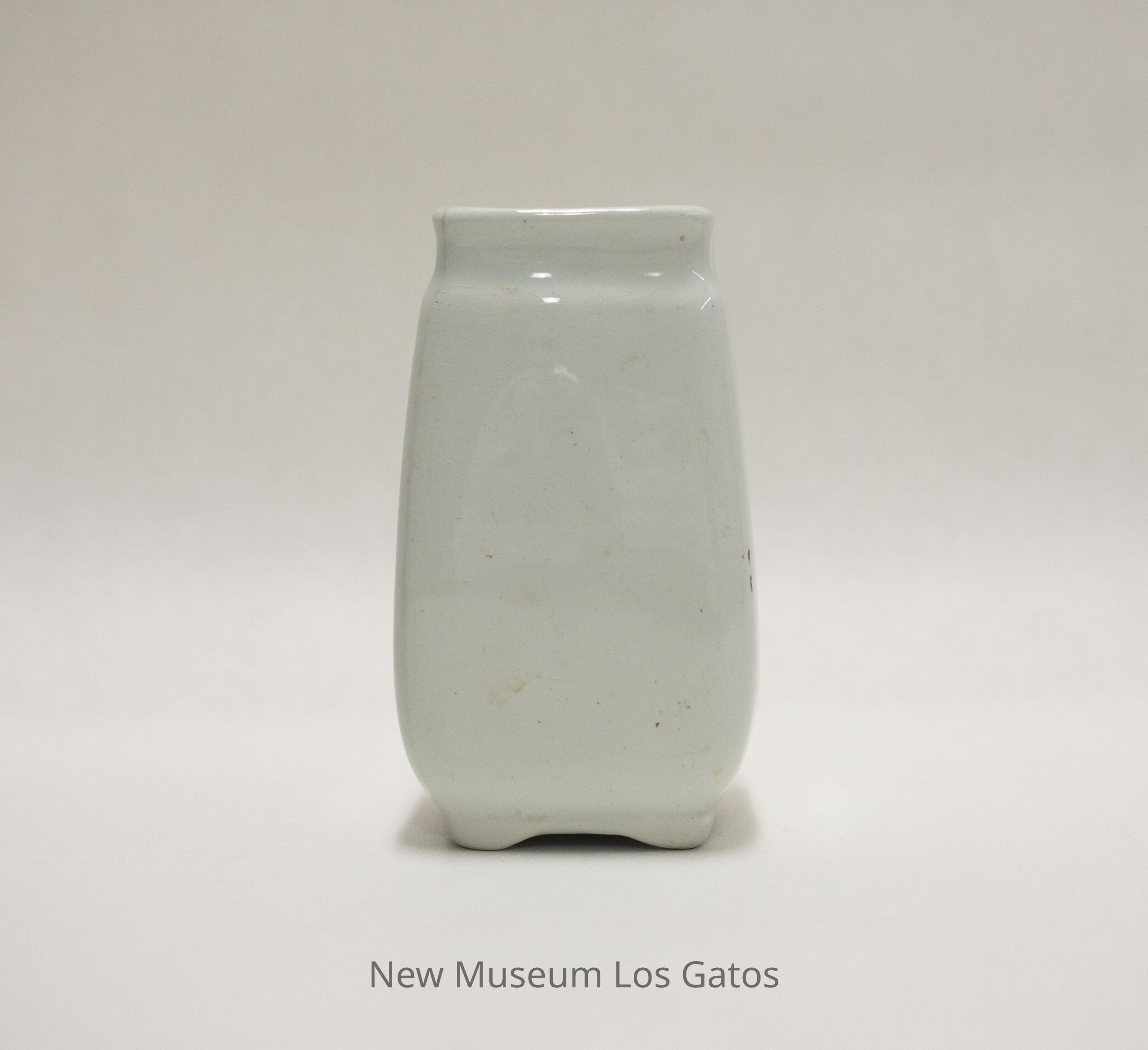 A white, ceramic toothbrush holder. The top of the holder is square, and corners bump out a bit down the sides, giving the body a more rounded appearance. There is a bevel around the top, and small feet at the bottom.Collection