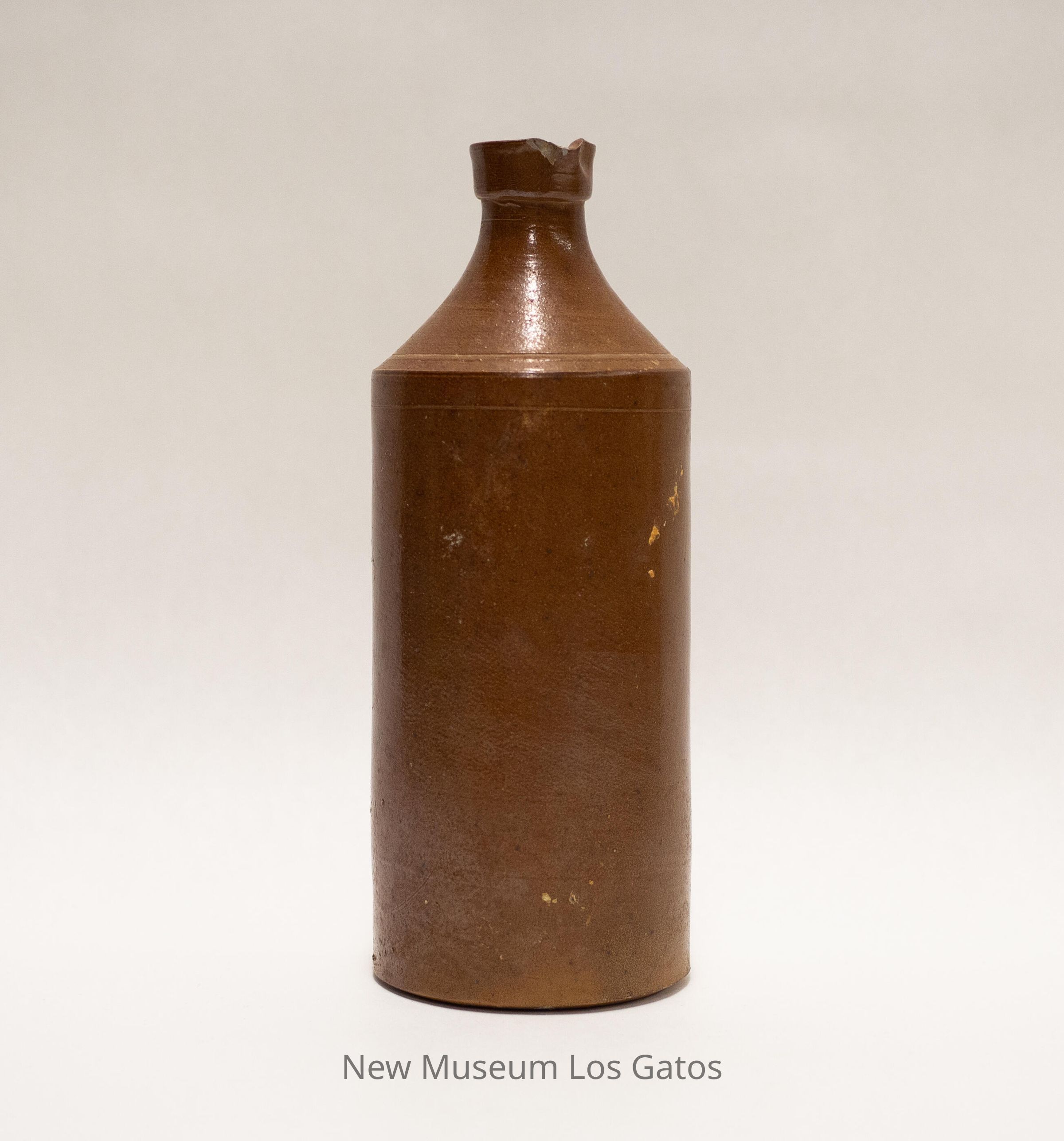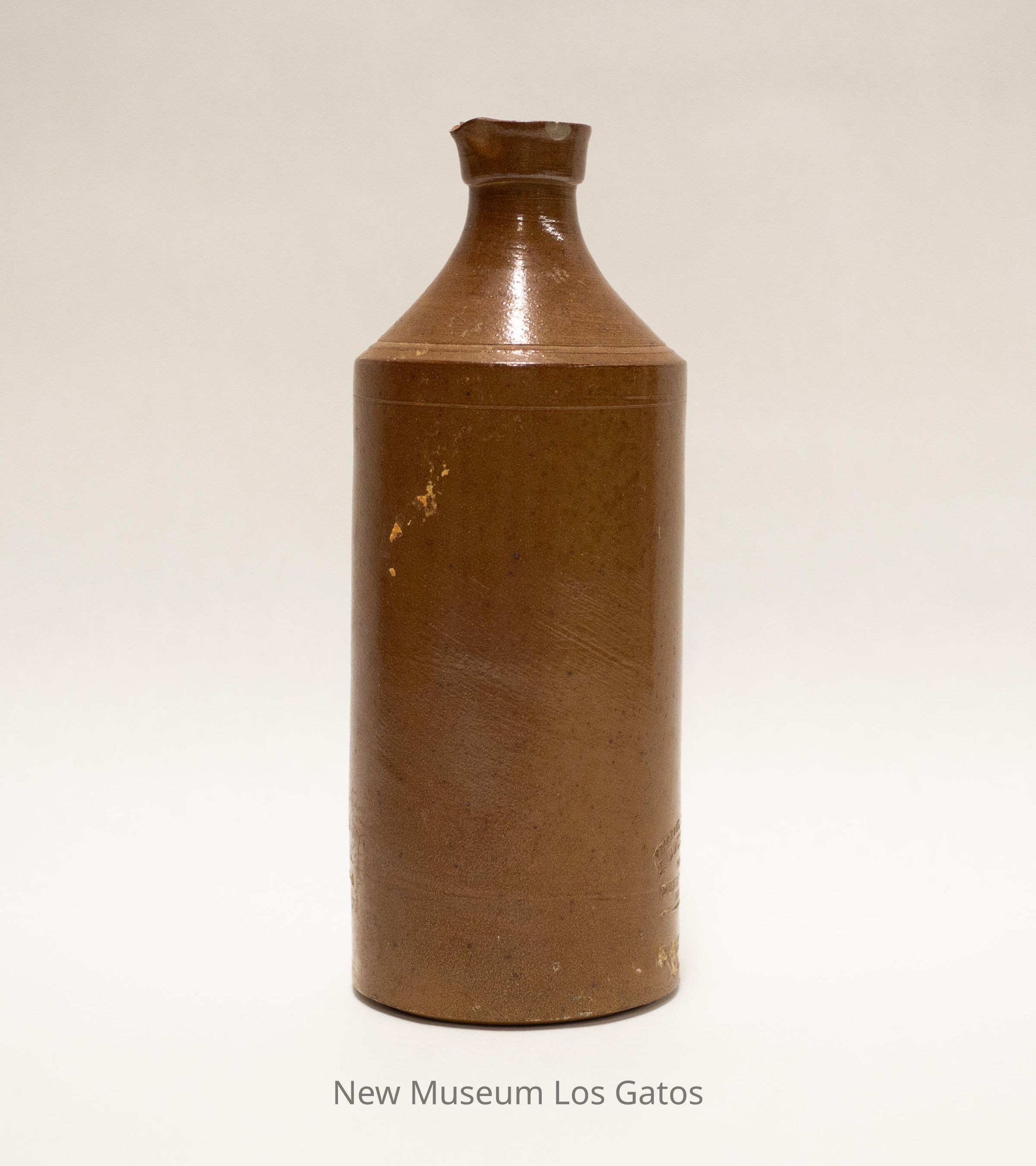 A large, brown cylindrical stoneware bottle. There is a pour spout at the rim.
