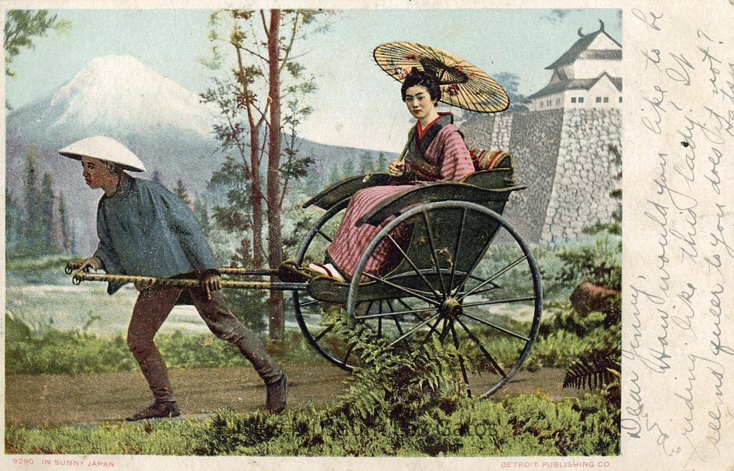 A postcard featuring an illustration of a man pulling a women in a wagon; the woman is wearing a pink kimono.Subject