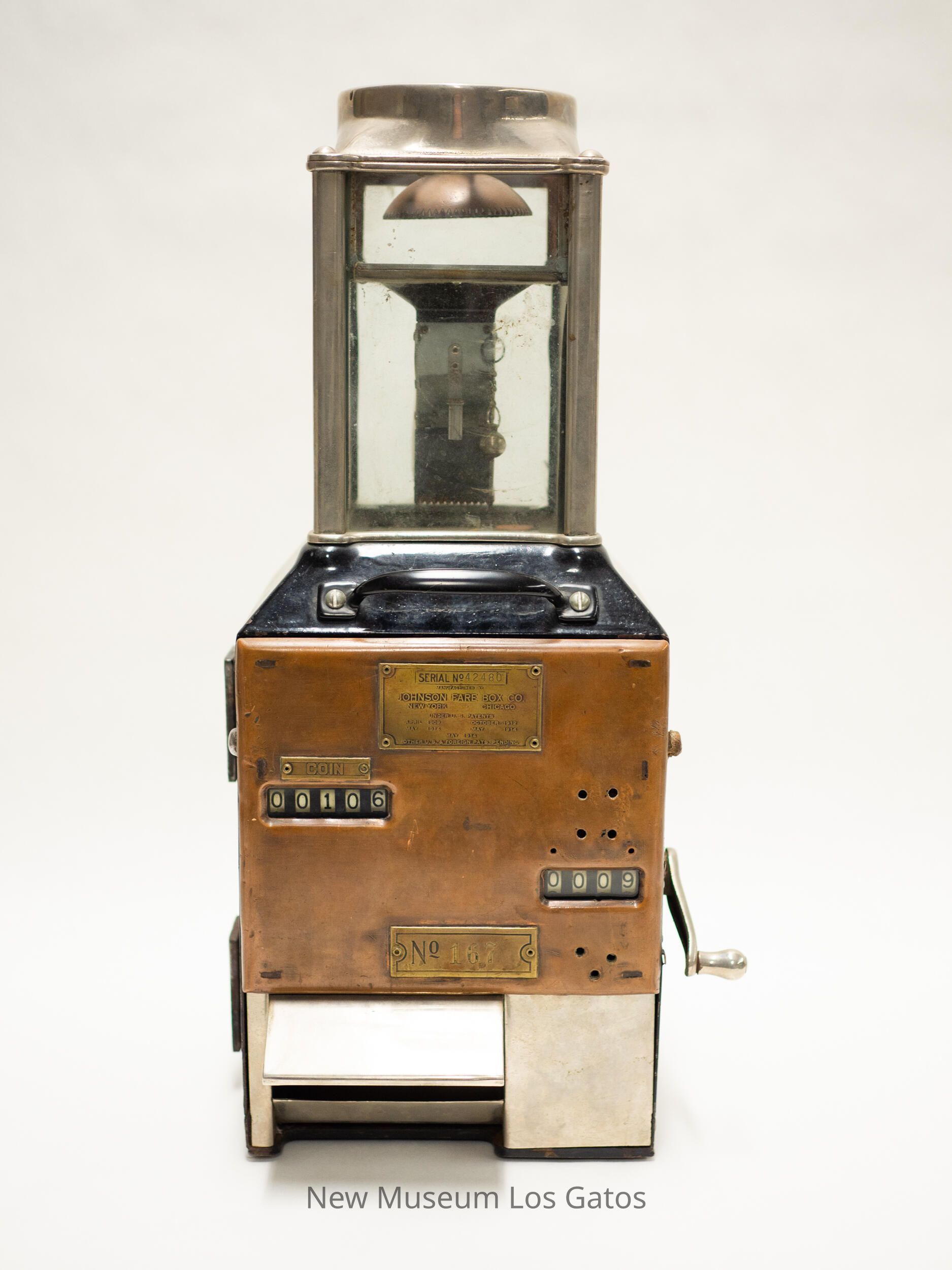 SERIAL No 42480 / MANUFACTURED BY / JOHNSON FARE BOX CO. / NEW YORK CHICAGO / UNDER U.S. PATENTS / APRIL 1909 / OCTOBER 1912 / MAY 1914 / MAY 1914 / MAY 1914 / OTHER U.S. & FOREIGN PATS. PENDINGLanguage