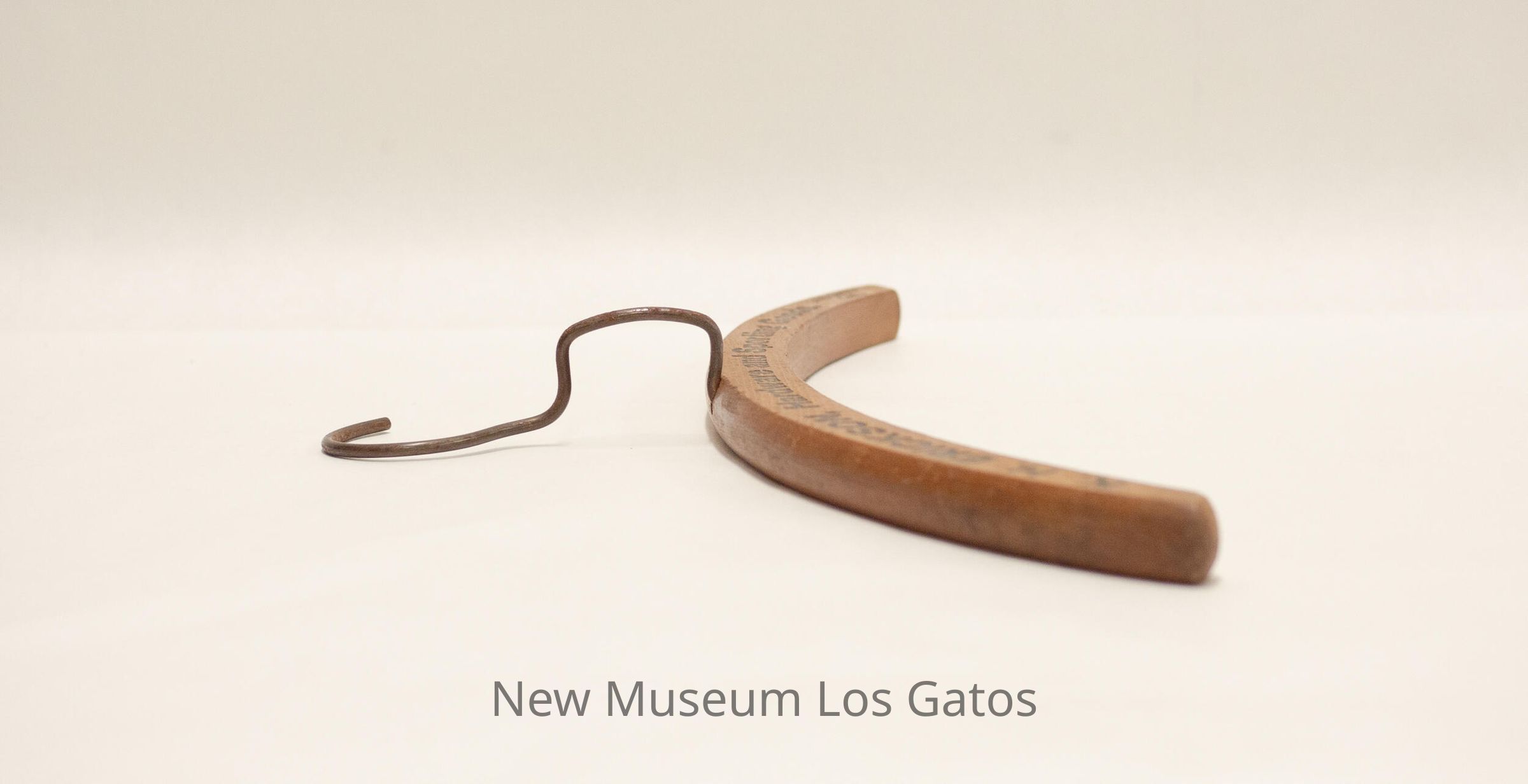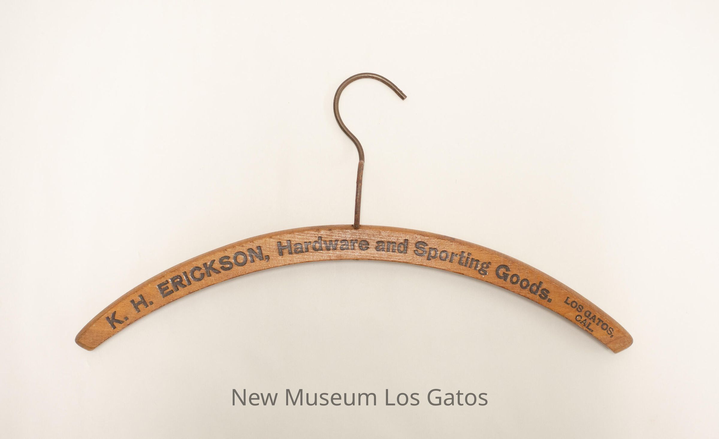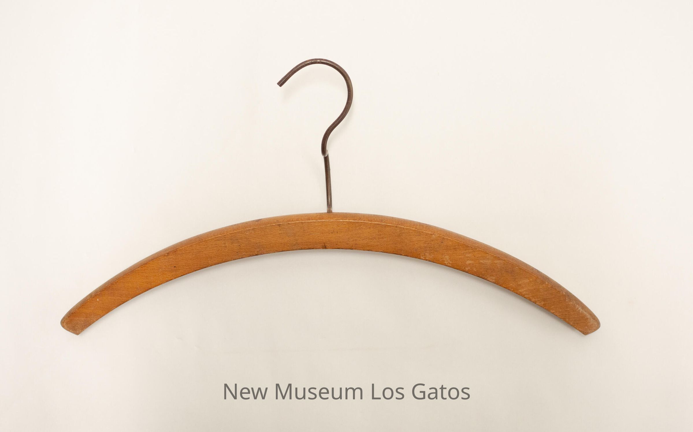 A curved wooden hanger, with a unusually-shaped metal hook attached to the top. The name of the store is inscribed on one side of the hanger.Collection