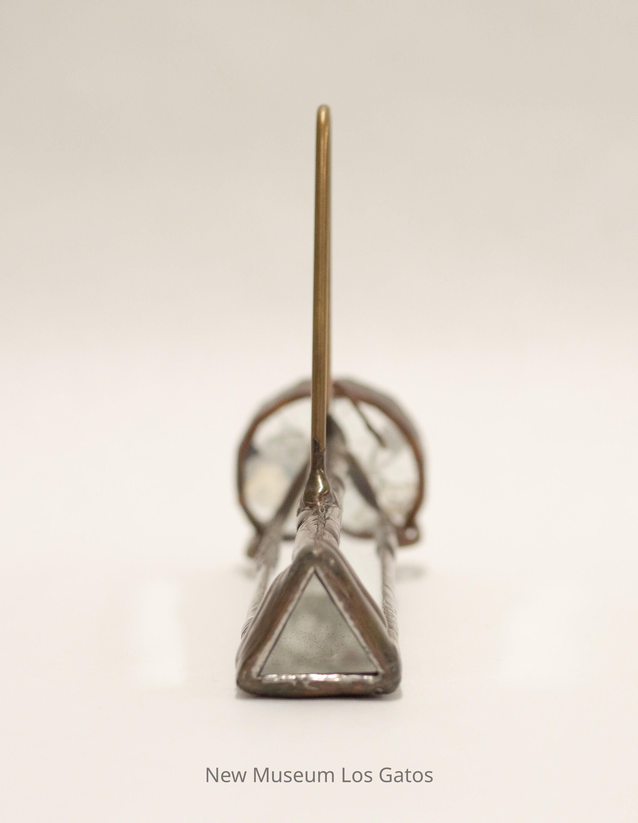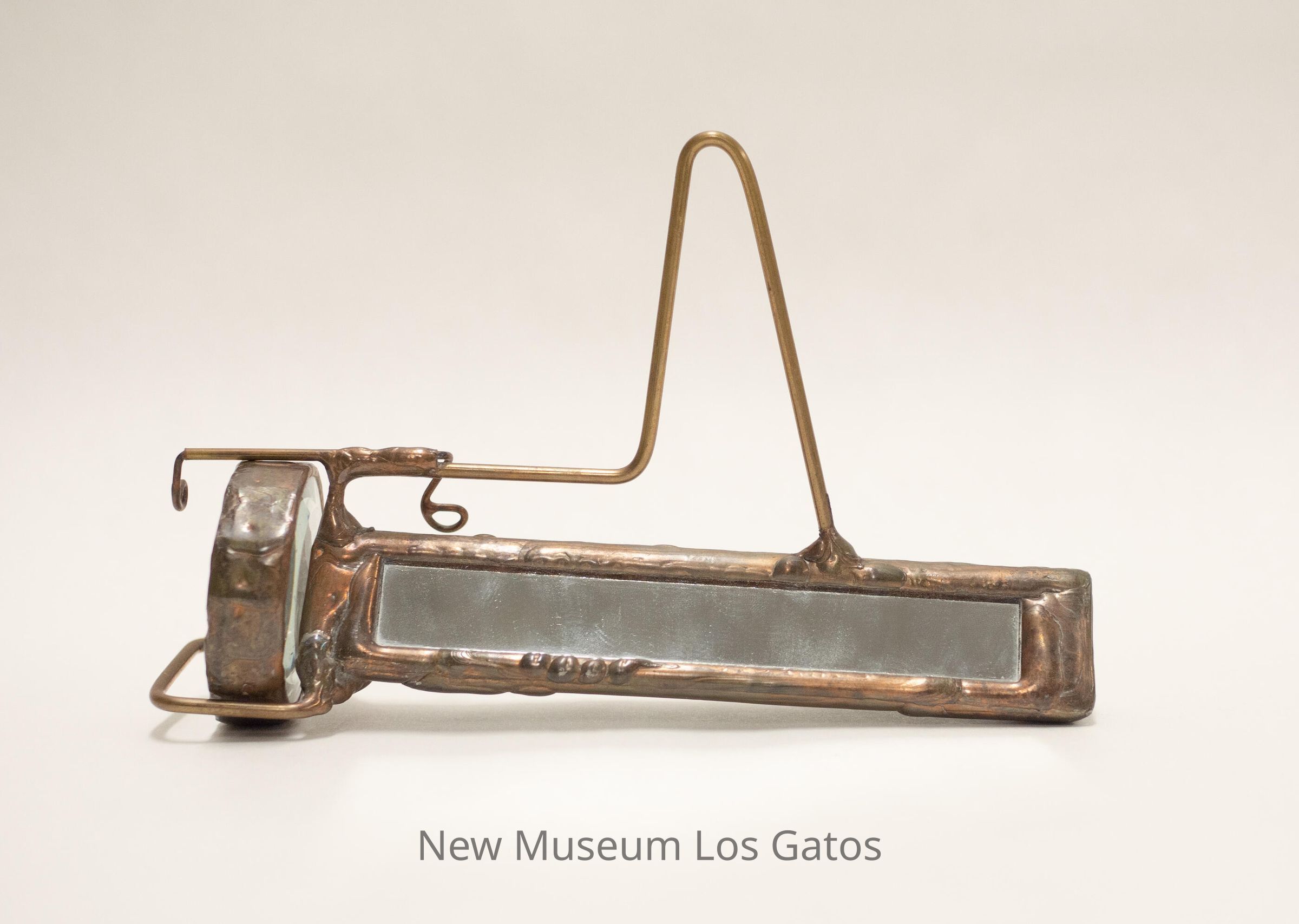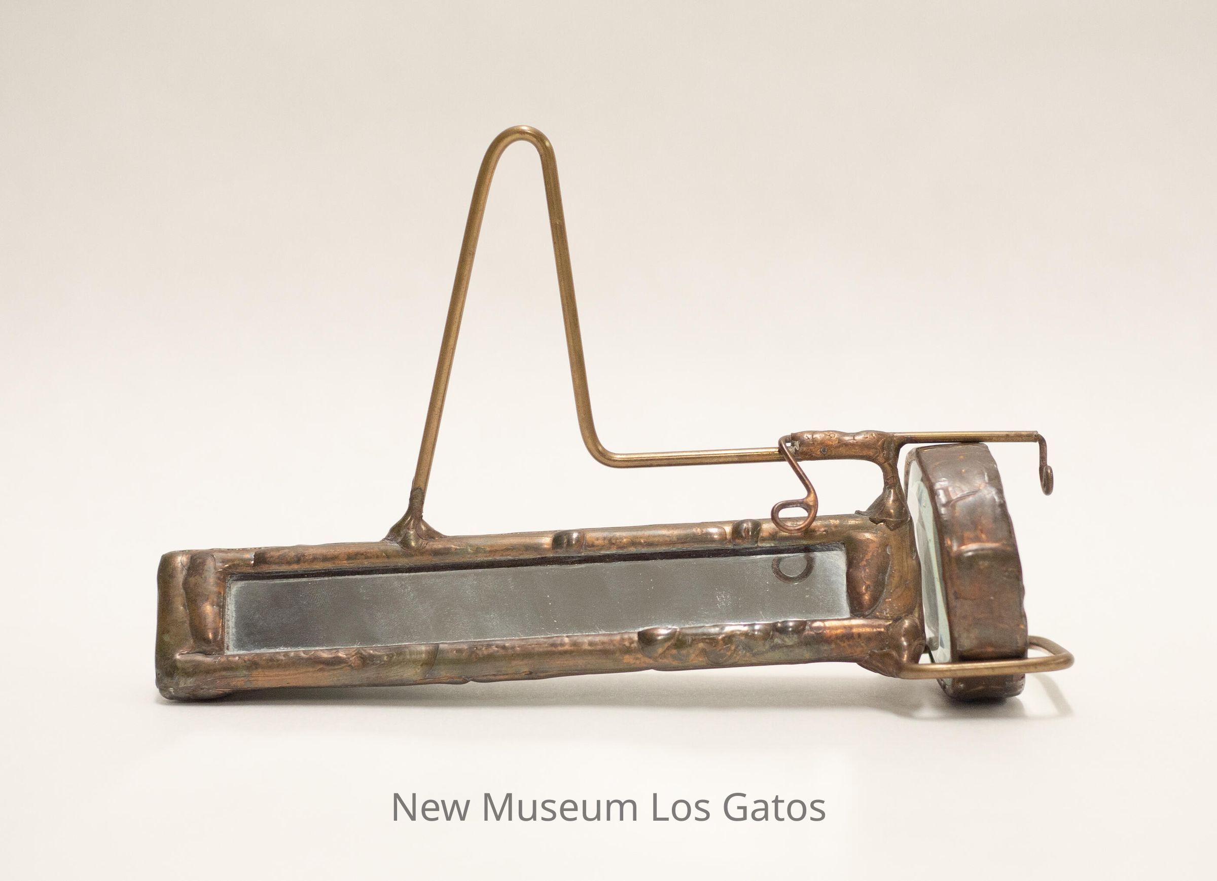 A brass kaleidoscope. The body is triangular in shape, and all three exterior and interior sides are mirrored. There is a brass shaped wire that is attached to one side, that can be used to hold the kaleidoscope. The object mechanism is a hollow, circular pieces of glass inside of brass bars, with mostly clear beads and one pink and two purple beads inside.Collection