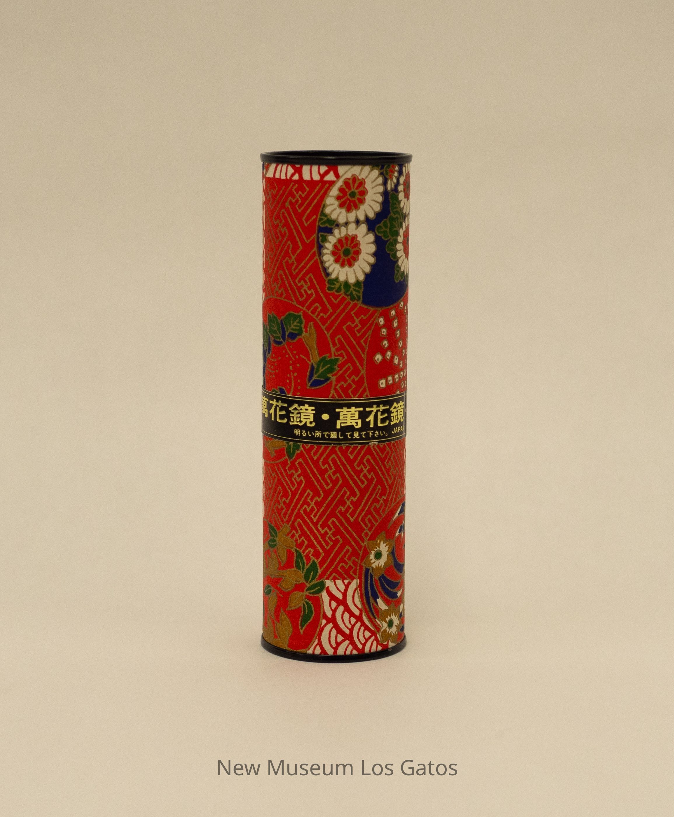 A cylindrical cardboard kaleidoscope. The exterior of the kaleidoscope features a red and white scale-shaped pattern, a red and gold line pattern, and two different floral patterns; there is also a black stripe around the center, with gold writing in Japanese. Both ends of the kaleidoscope are flat. The viewing end has a hole in the center, while the opposite side has a slightly opaque piece of plastic, behind which are beads in a variety of colors and shapes, which are used to create the patterns.