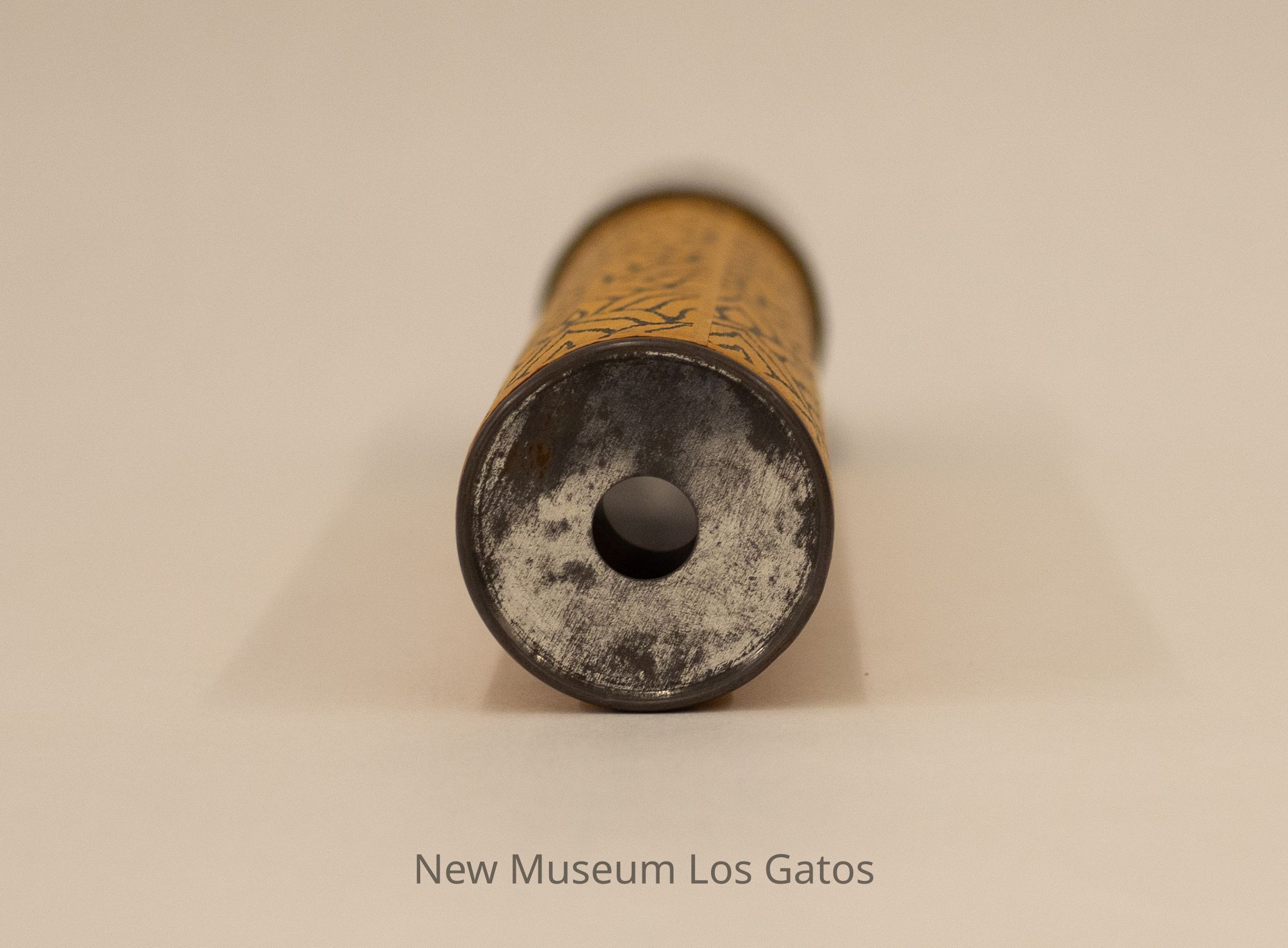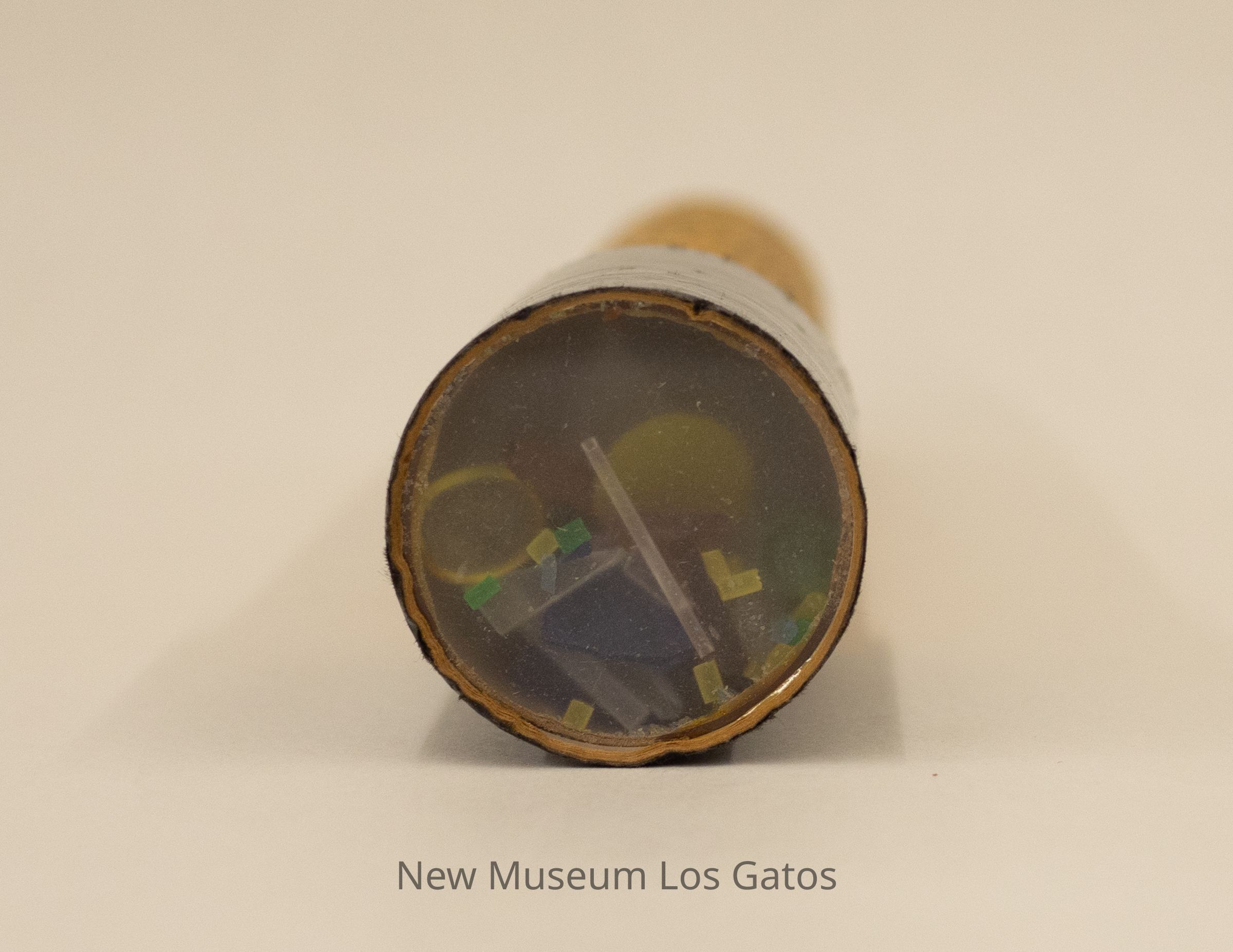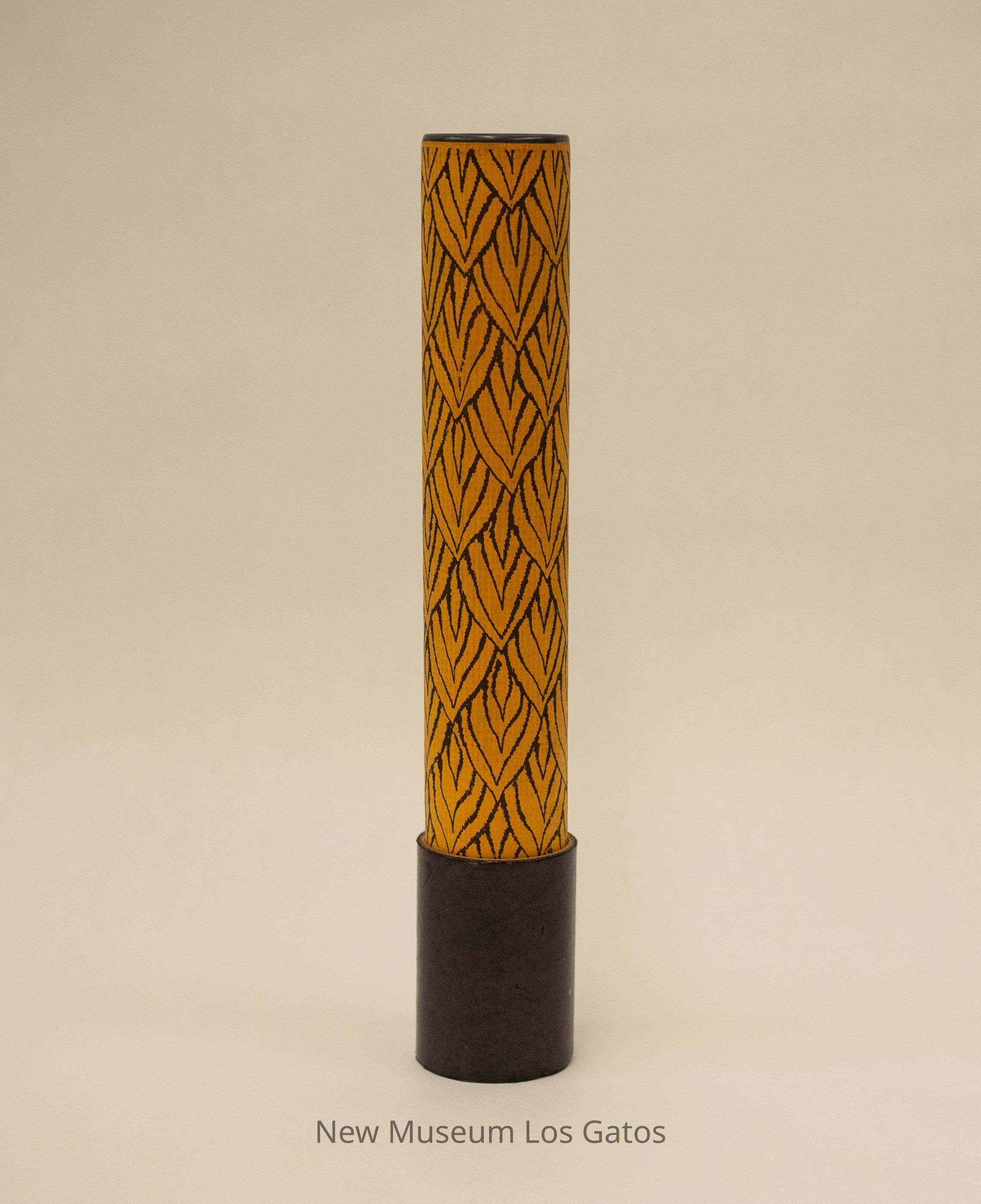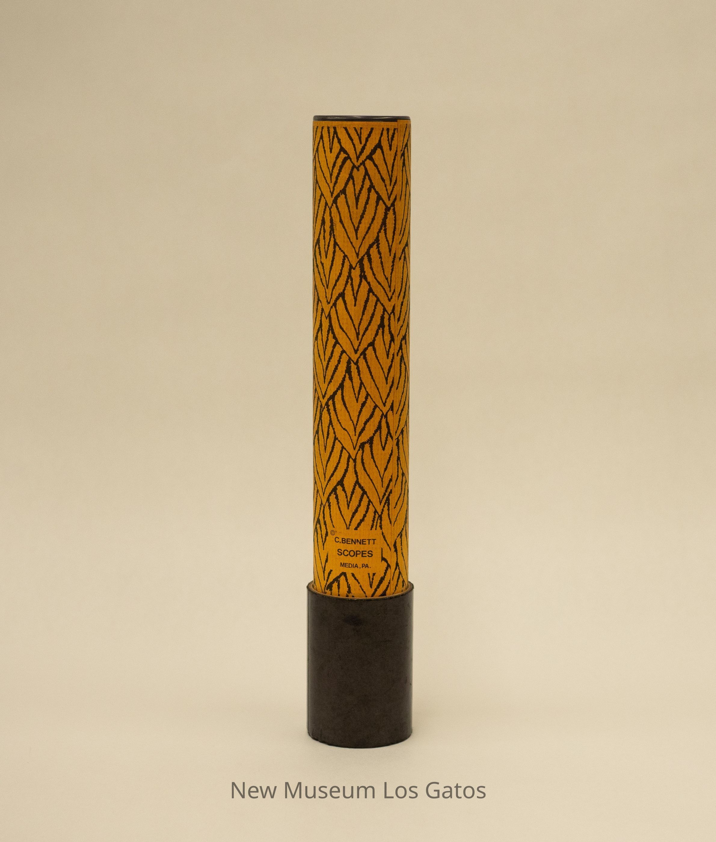 A cylindrical cardboard kaleidoscope. One end of the kaleidoscope features a metal end, with a small hole in the middle, for viewing. The other end has a slightly opaque piece of plastic, behind which are assorted bits of colored plastic in a variety of shapes and sizes. The kaleidoscope body is a tan/orange color, with a black leaf-like print throughout. The end with the object mechanism is solid black, and spins around the body, moving the object mechanism.Collection