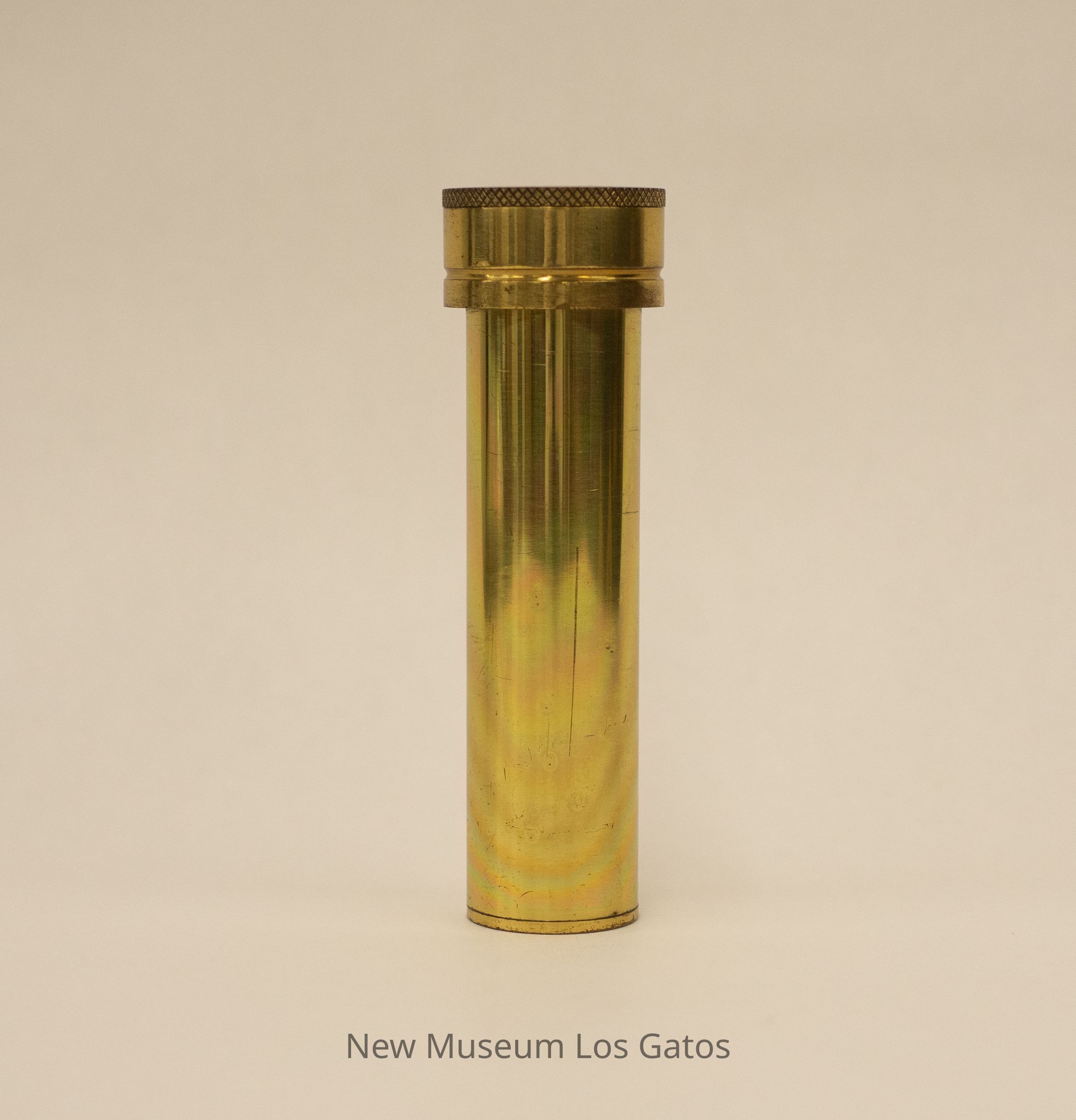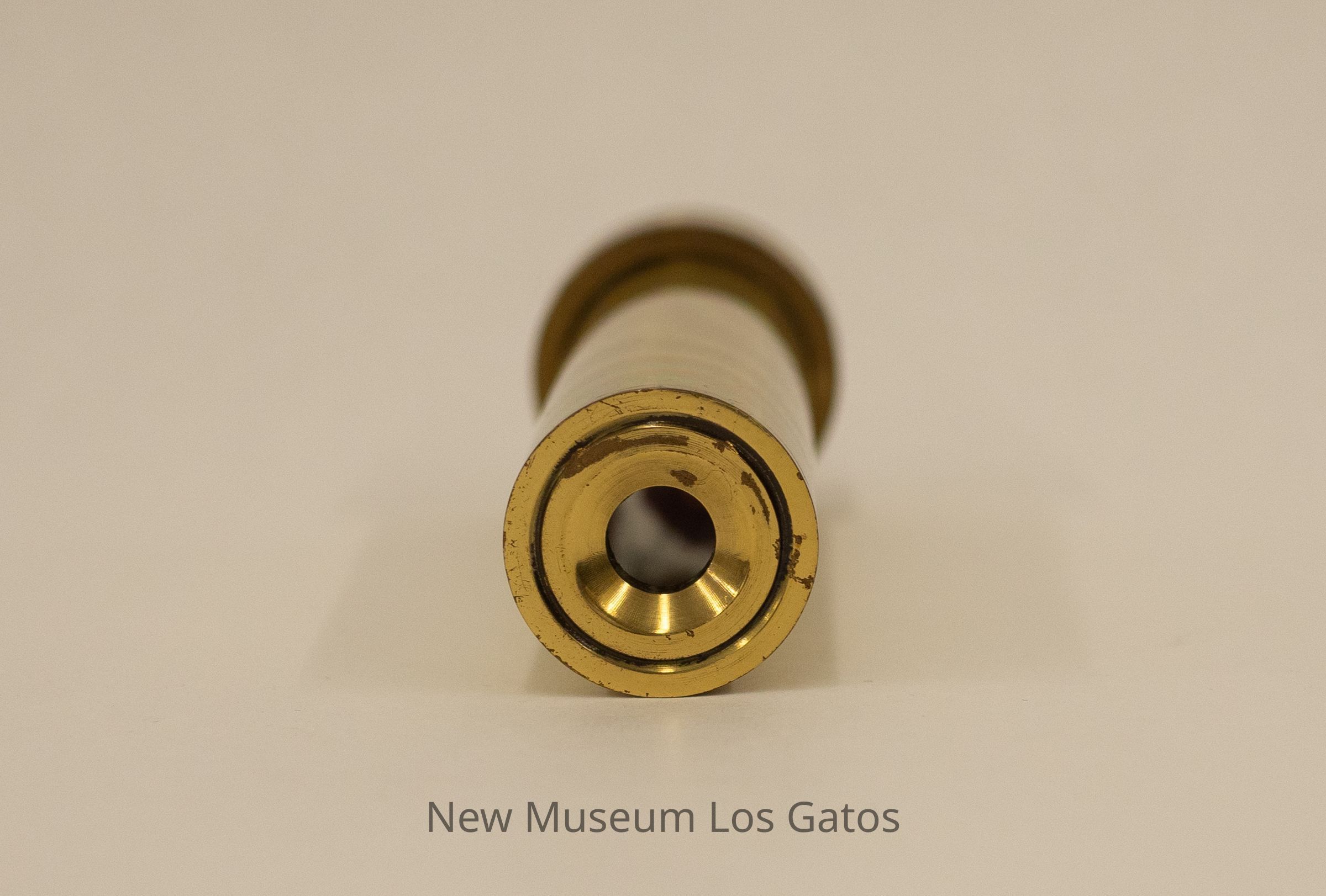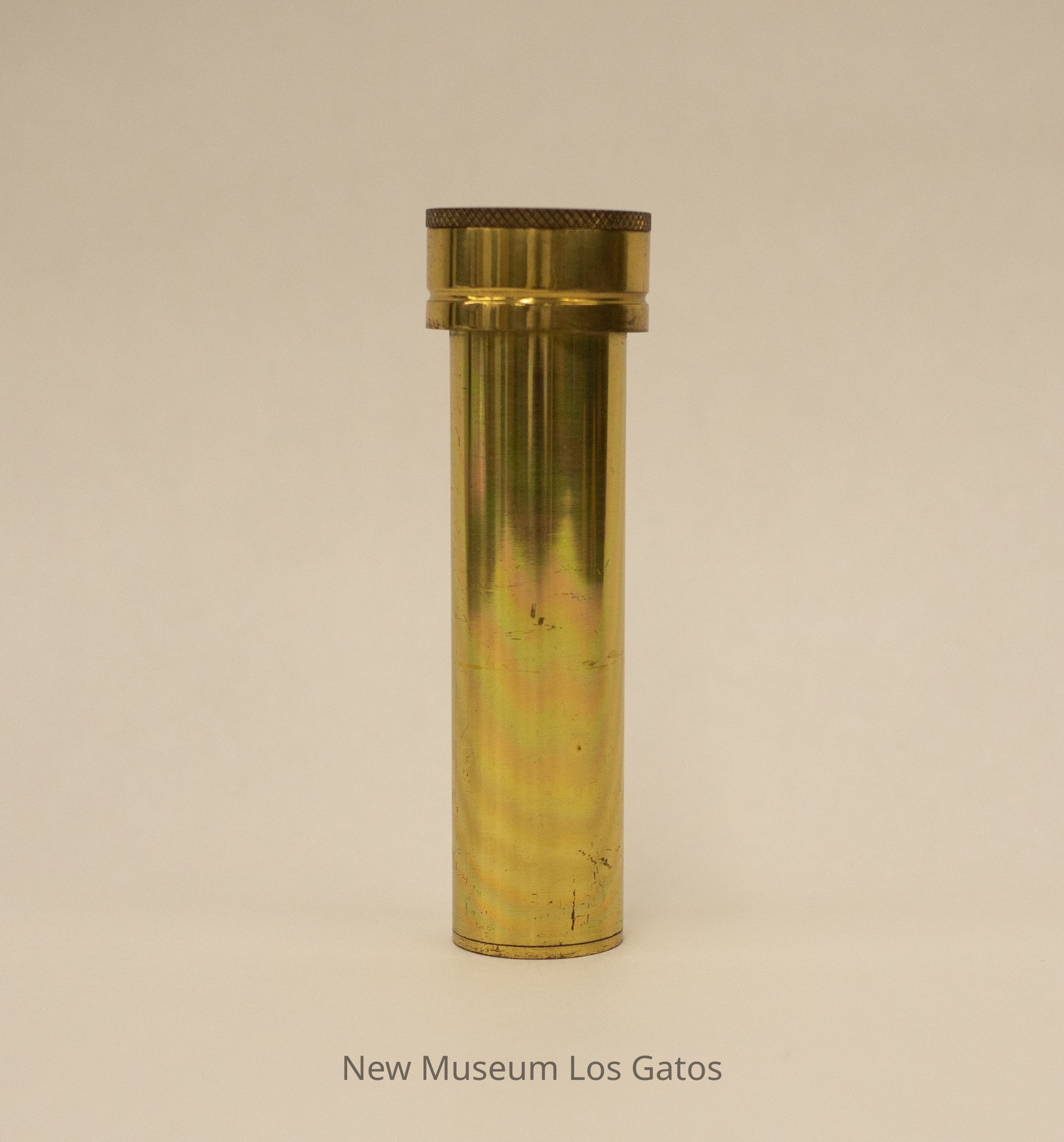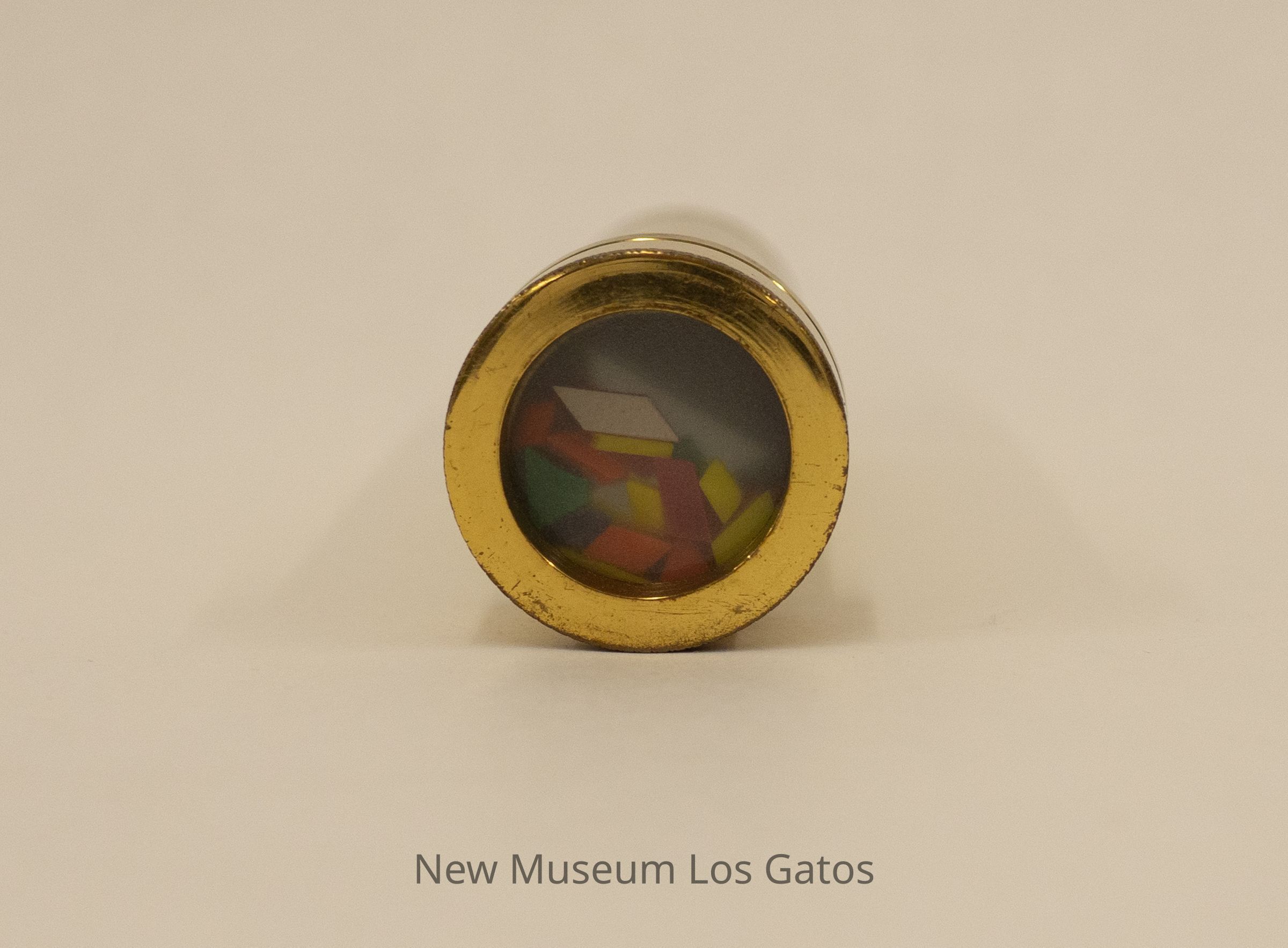 A cylindrical metal kaleidoscope. Both ends of the kaleidoscope are flat. One end features a small hole in the middle, for viewing. The other end has a slightly opaque piece of plastic, behind which are assorted bits of colored plastic in a variety of shapes and sizes. The kaleidoscope body is gold in color, and most likely made out of brass. The end with the object mechanism is wider than the rest of the kaleidoscope, and spins around the body, moving the object mechanism.Collection