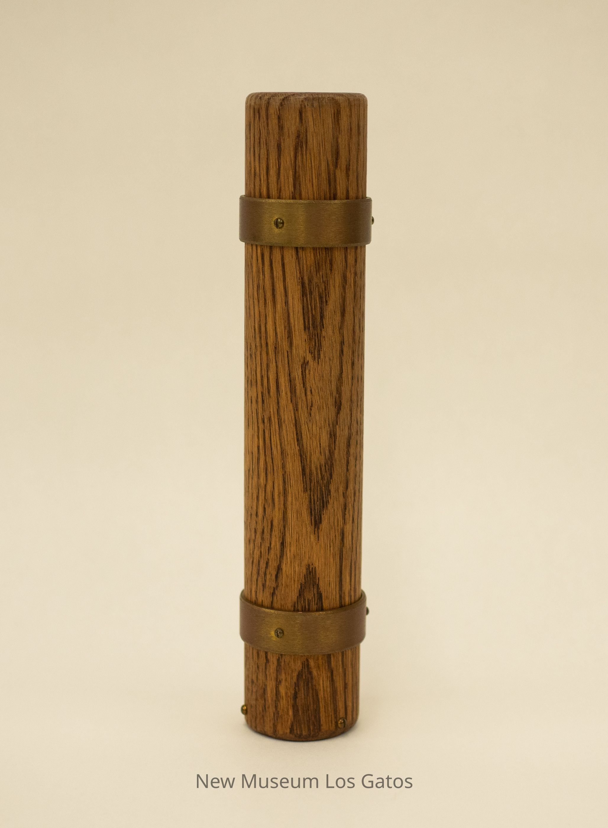 A cylindrical wooden kaleidoscope. The exterior of the kaleidoscope is wooden, with a brass strap near each end. Both ends of the kaleidoscope are flat, with small hollows to reveal the eye piece and the object mechanism, which uses numerous beads in a variety of shapes and colors to create the patterns.Collection