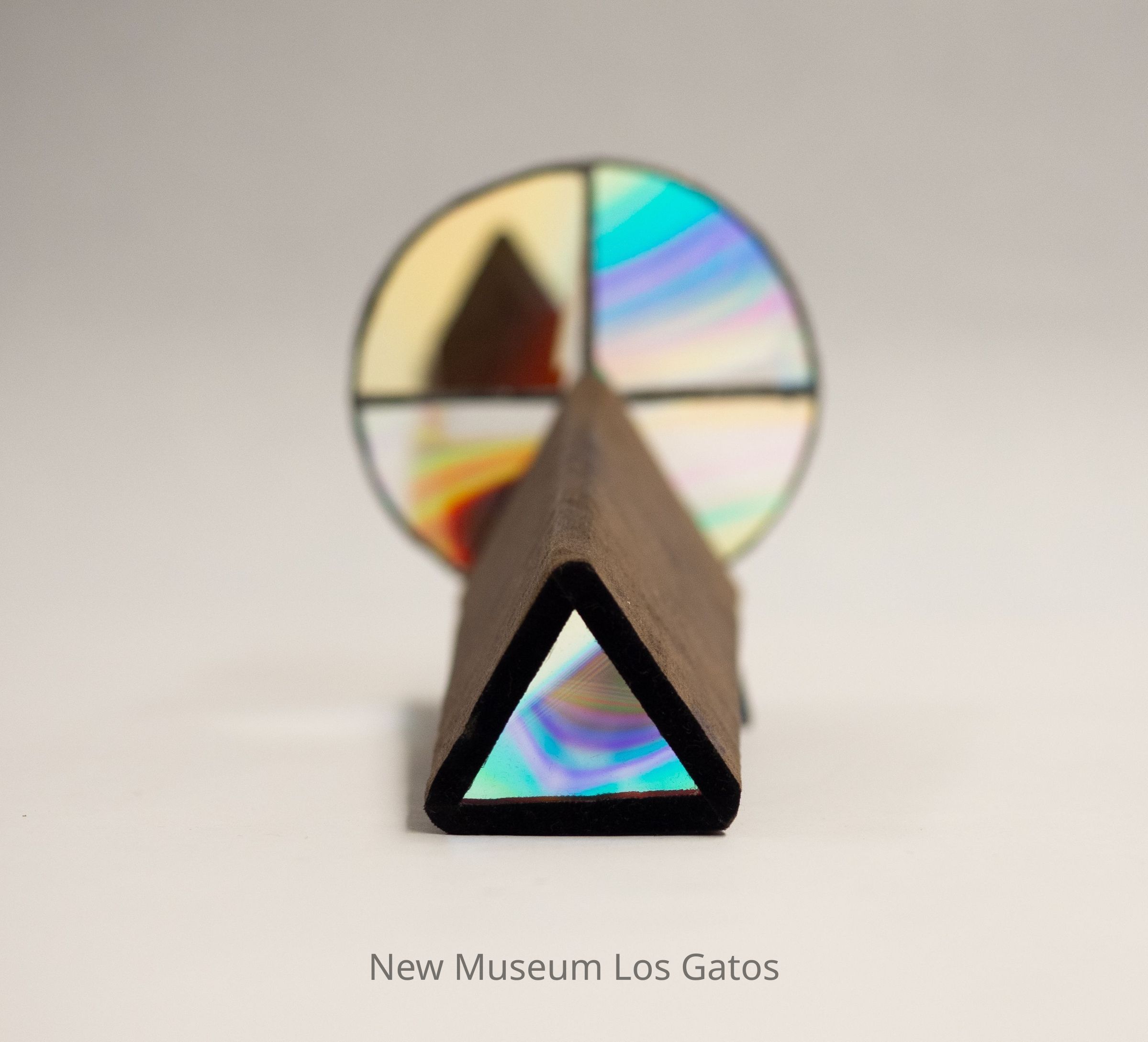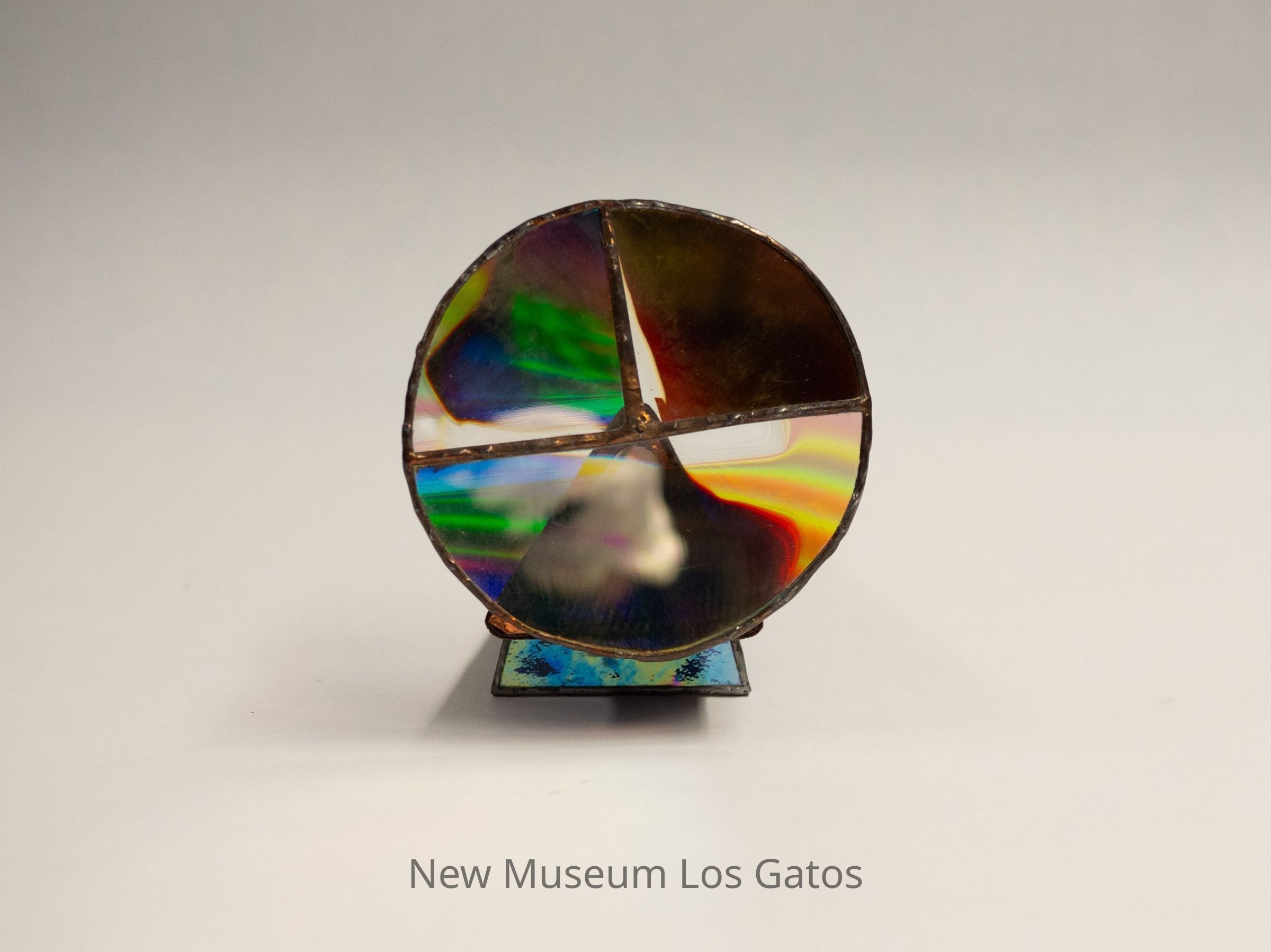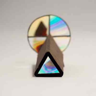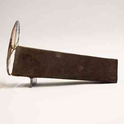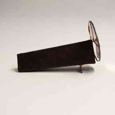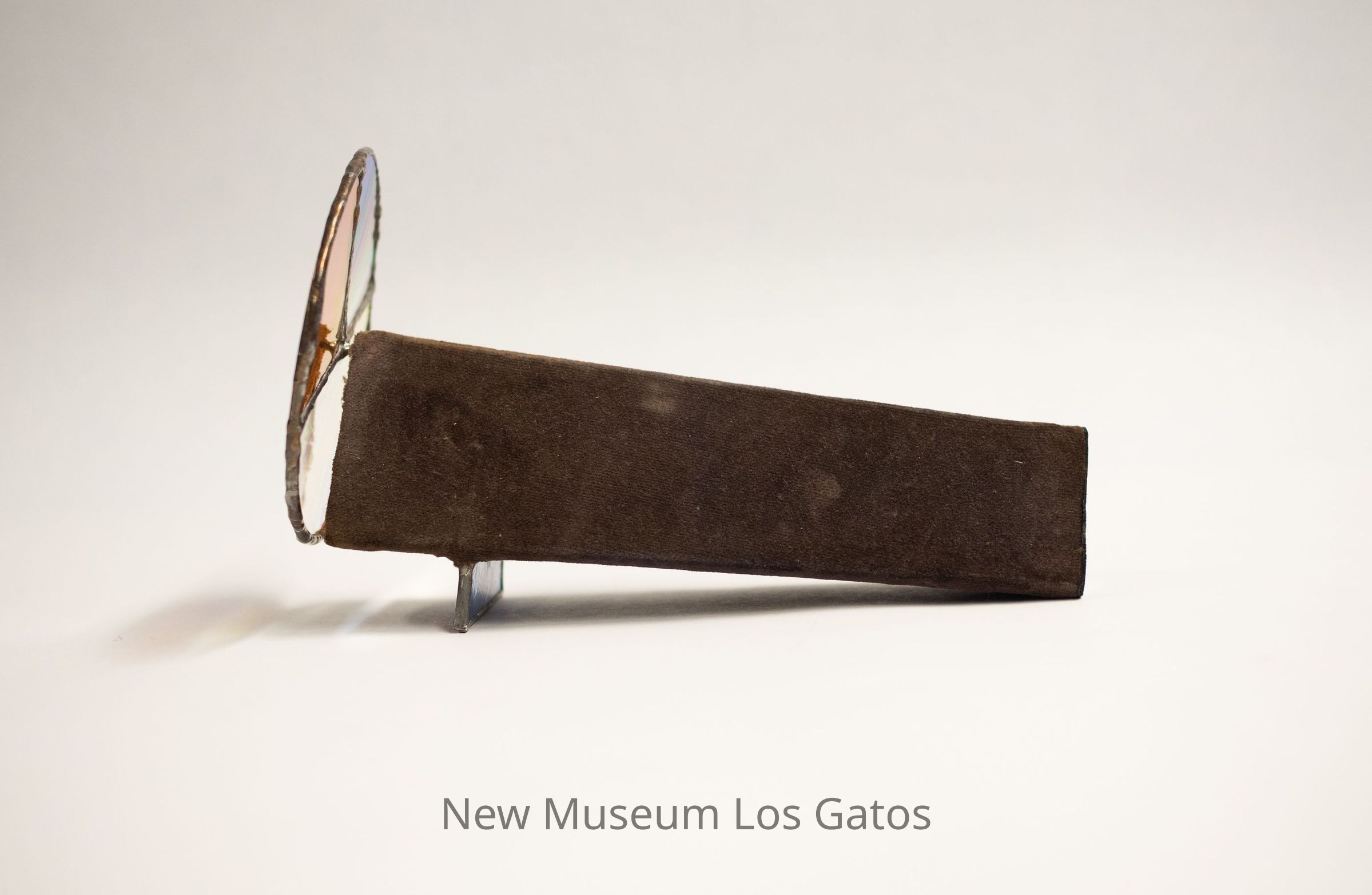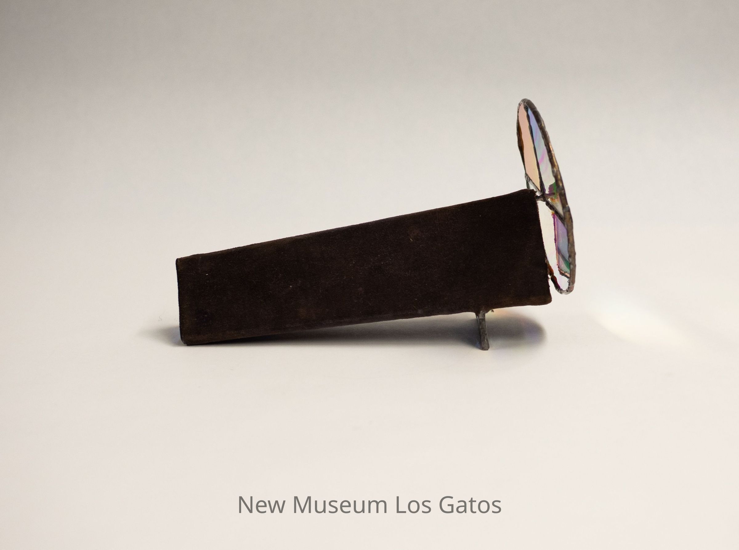 A stained glass kaleidoscope. The body is triangular, and covered in a dark brown fabric, likely felt. The eyepiece consists of a covered triangular opening into the body, which is mirrored inside. There is one circular moveable view piece that has three sections: one half section and two quarter sections. The half section and one of the quarter sections have the same clear/iridescent glass, while the other quarter section has a darker brown color. There is a rectangular/triangular iridescent glass piece on the bottom of the kaleidoscope body, that serves as a stand.Collection