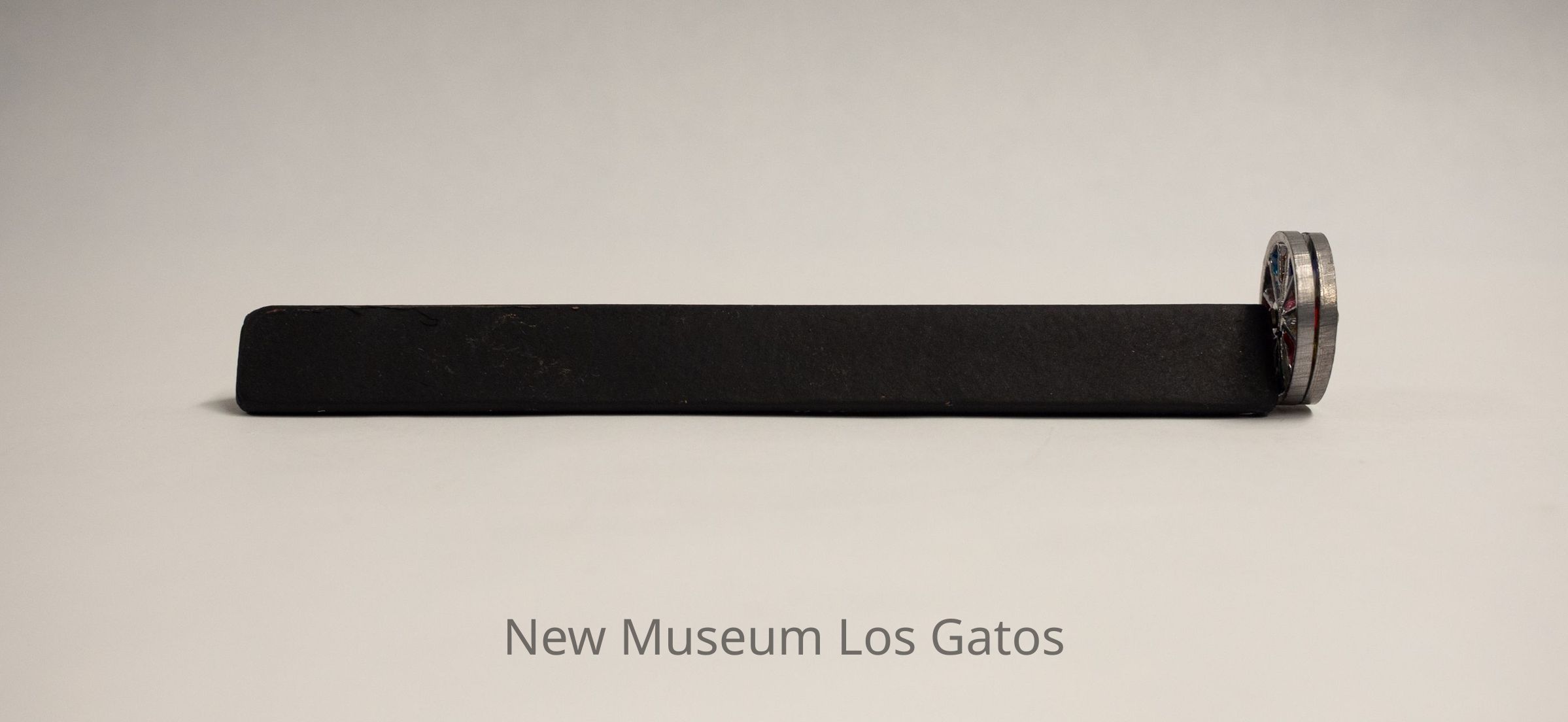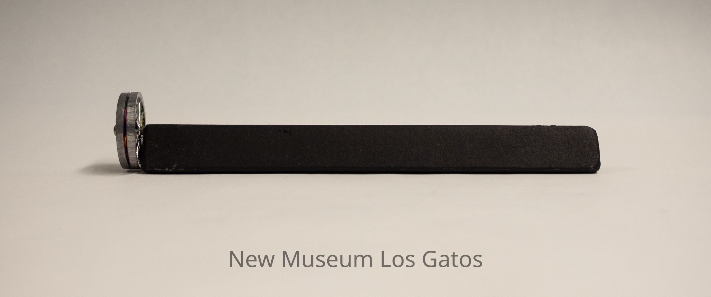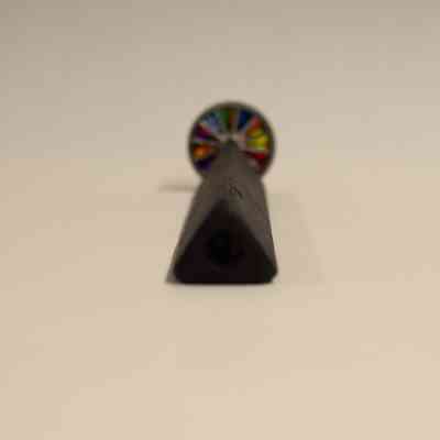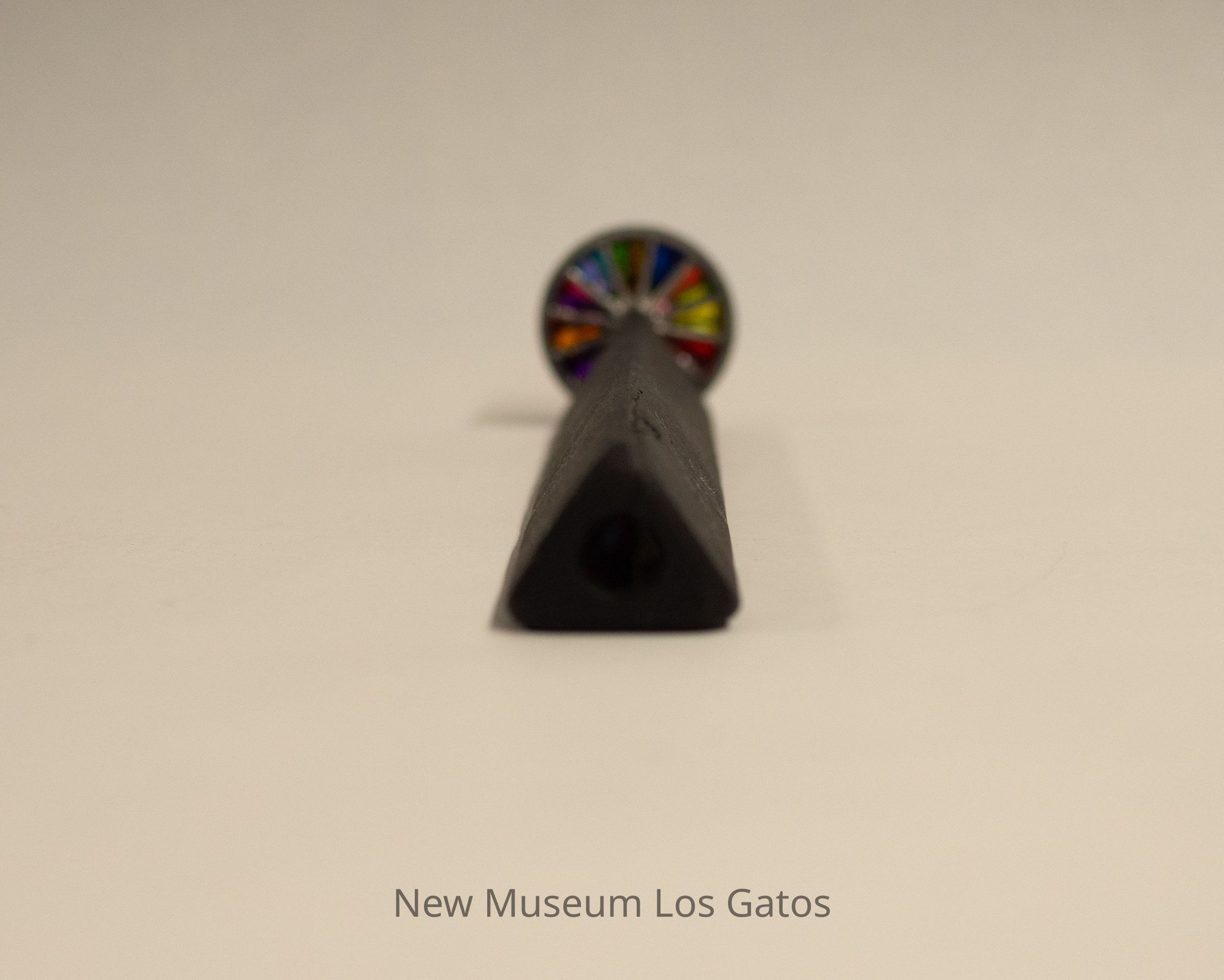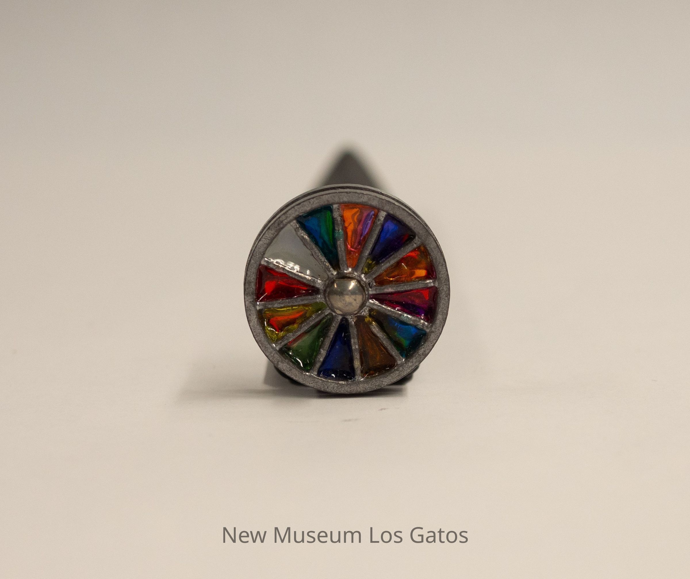 A triangular, stained glass kaleidoscope. The wooden body is triangular, and painted black. The eyepiece consists of a circular hole cut in the wood, through which the mirrored interior is viewable. There are two circular moveable view pieces that have been divided into 12 sections each. Each section contains clear glass in a different color, and each view piece has the same pattern of colors.Collection