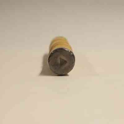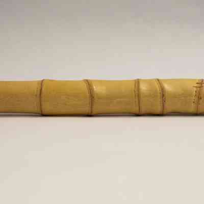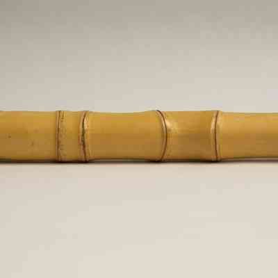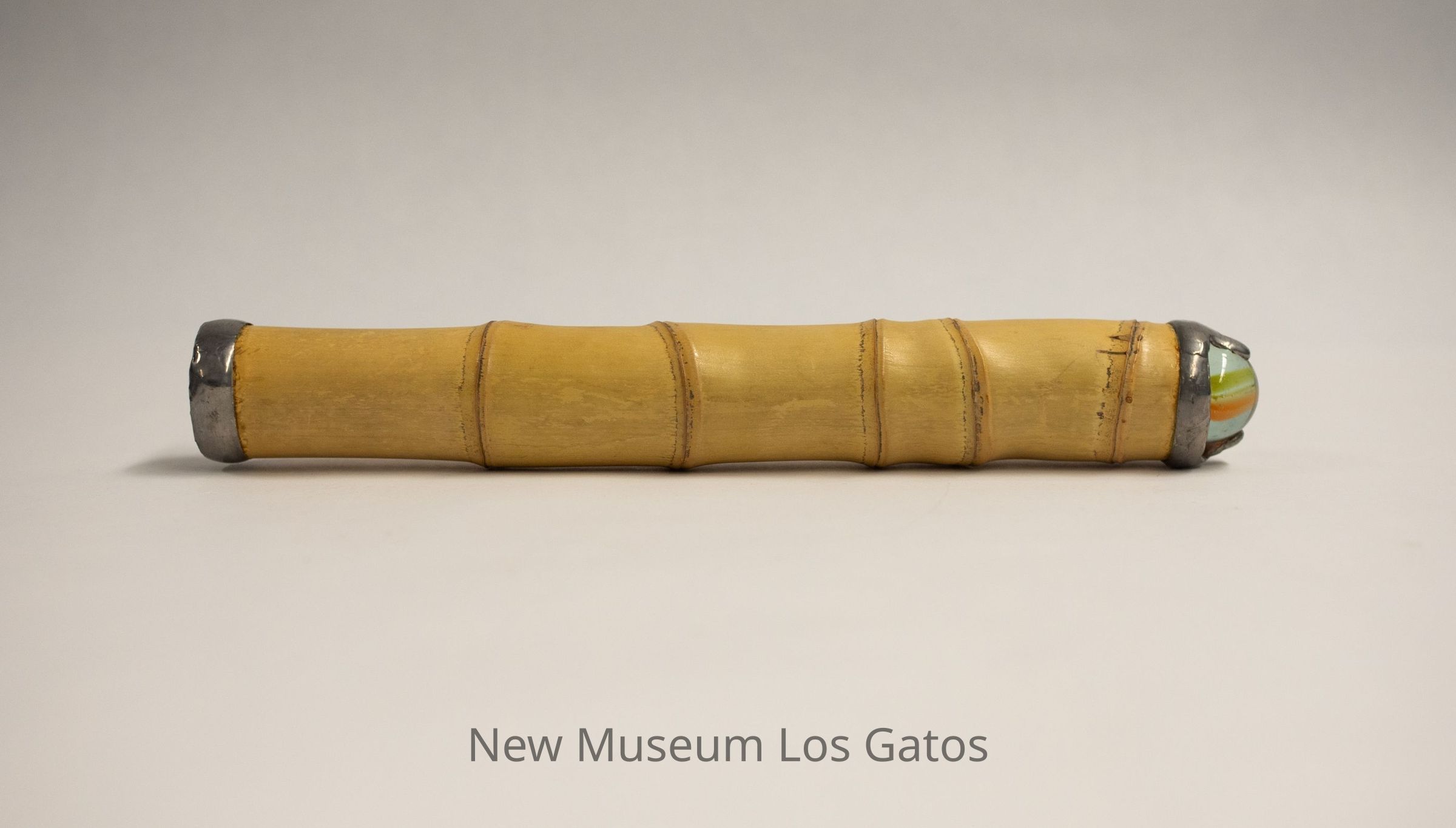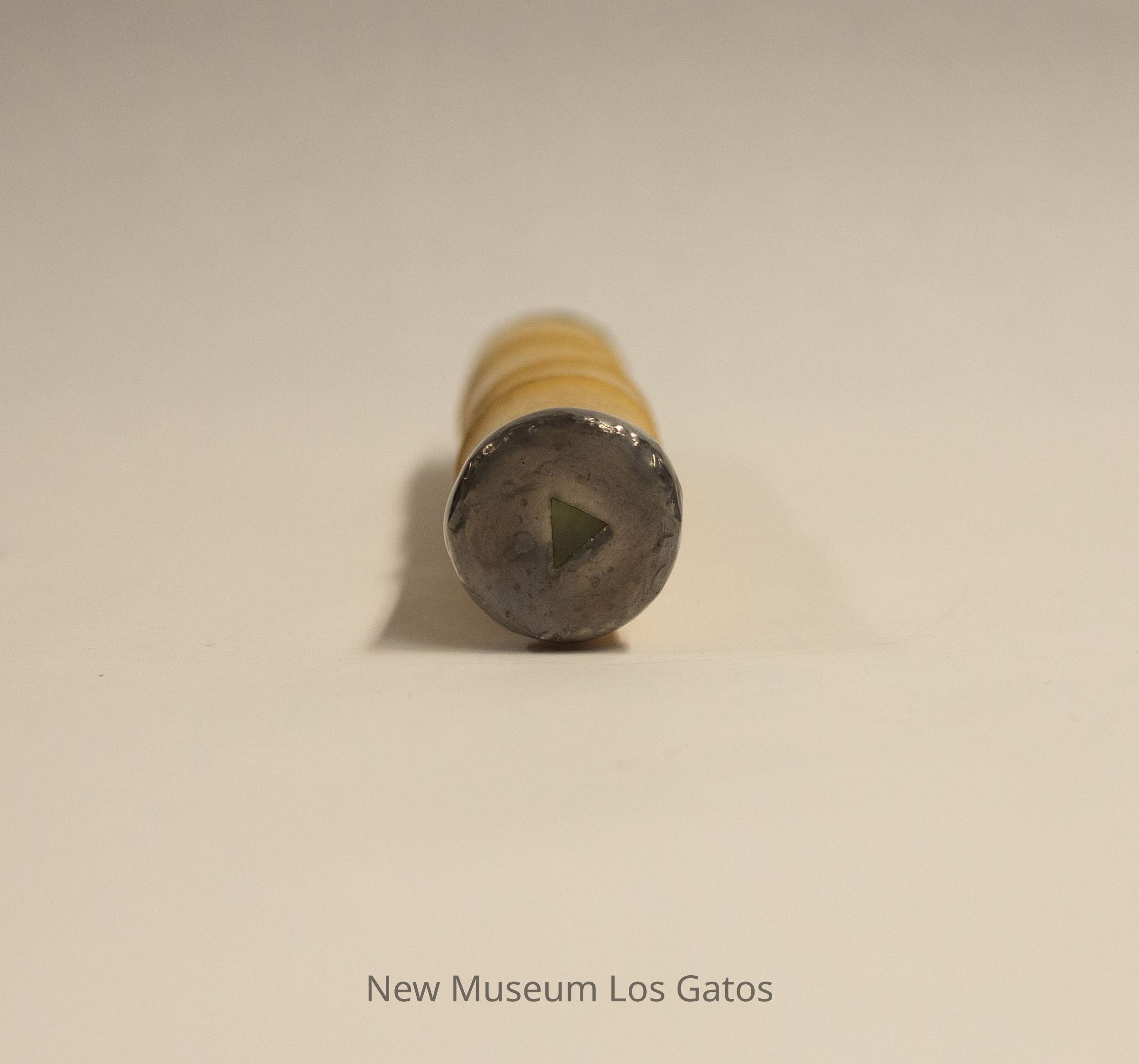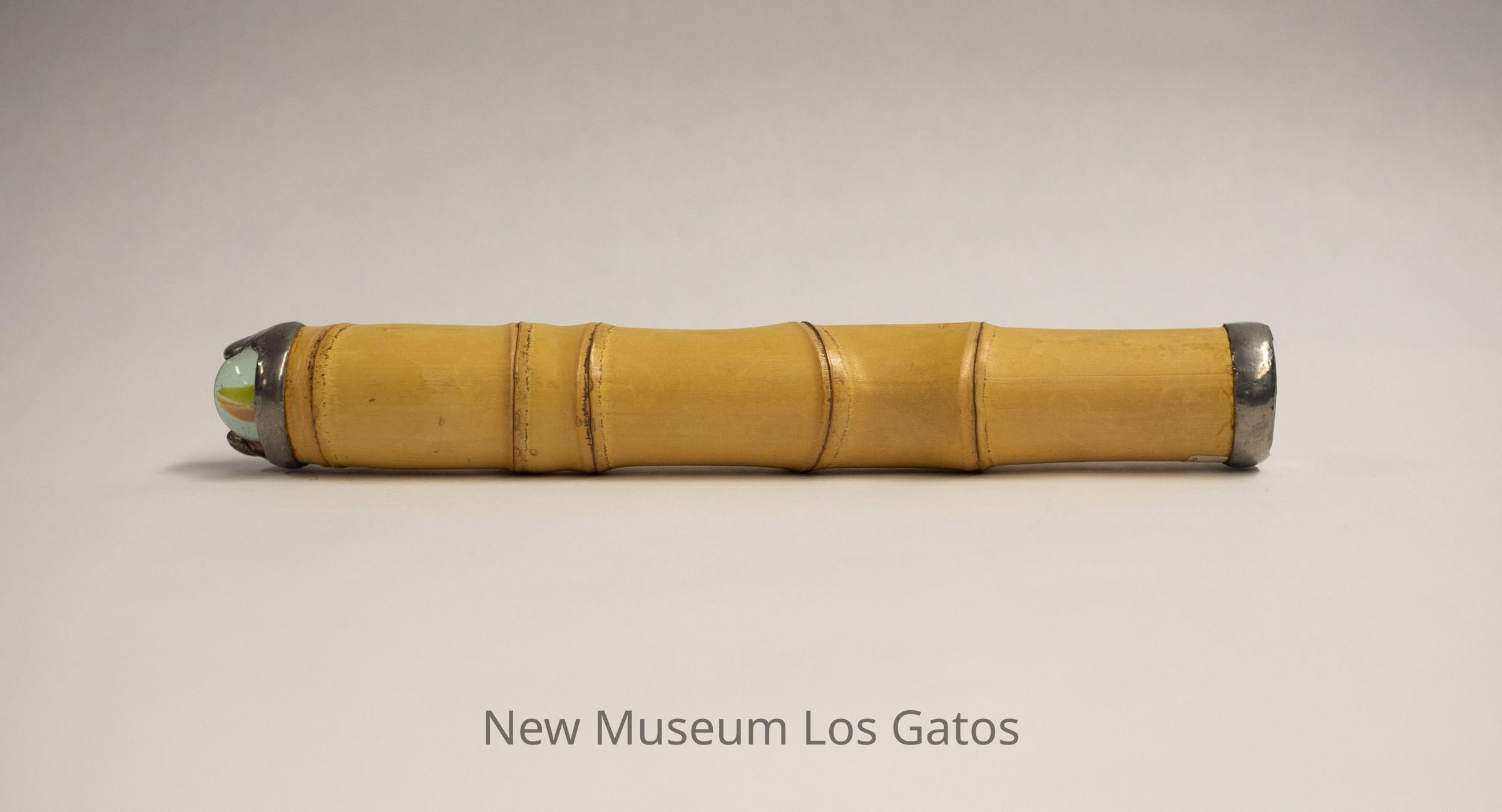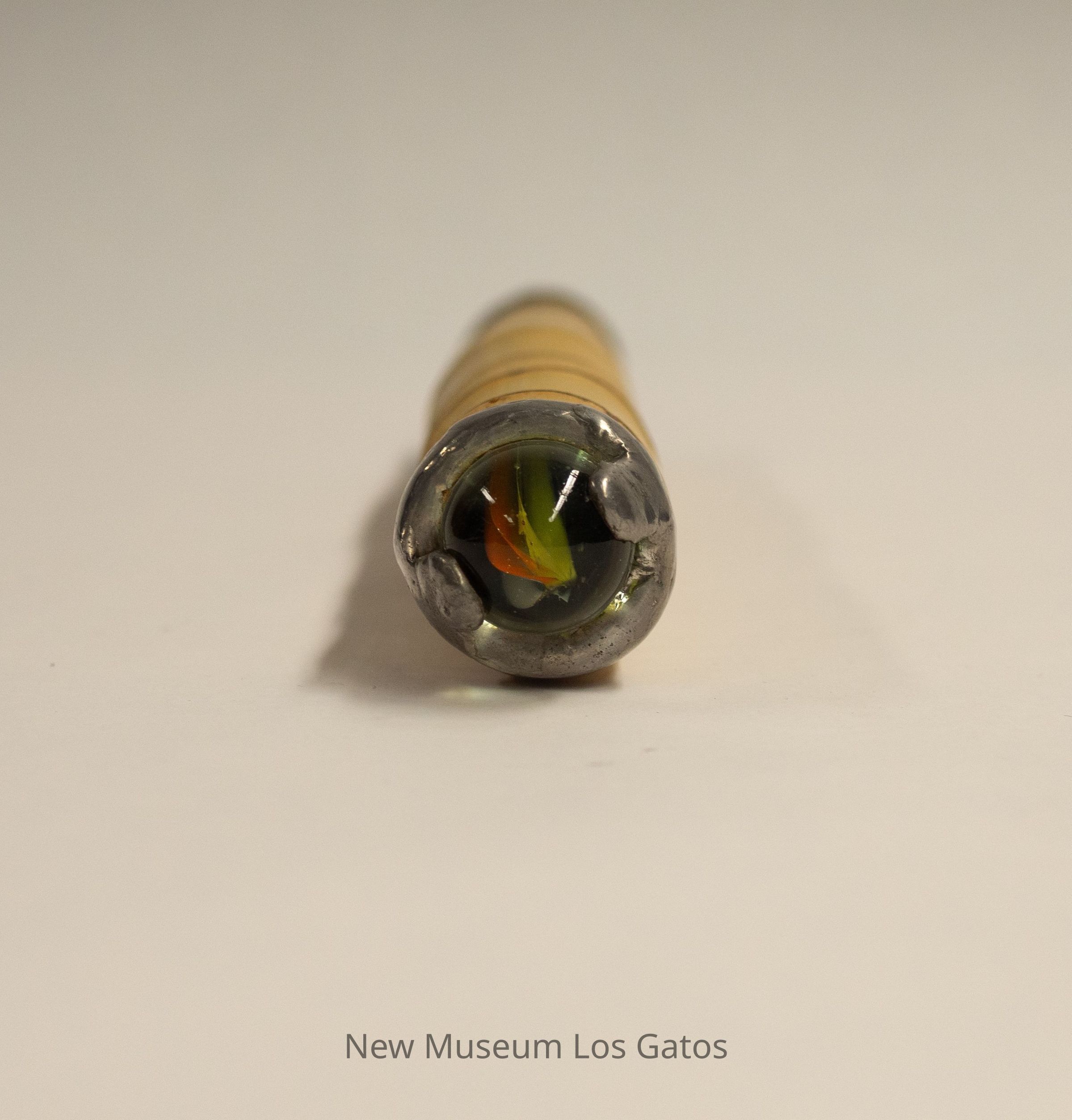 A cylindrical, marble kaleidoscope. The body is made out of a piece of bamboo, with metal end caps. The eyepiece consists of a triangular hole cut in the metal, through which the mirrored interior is viewable. The view piece is a marble that is secure in place by the metal; the marble is clear, with yellow, orange, and blue streaks in the center.Collection