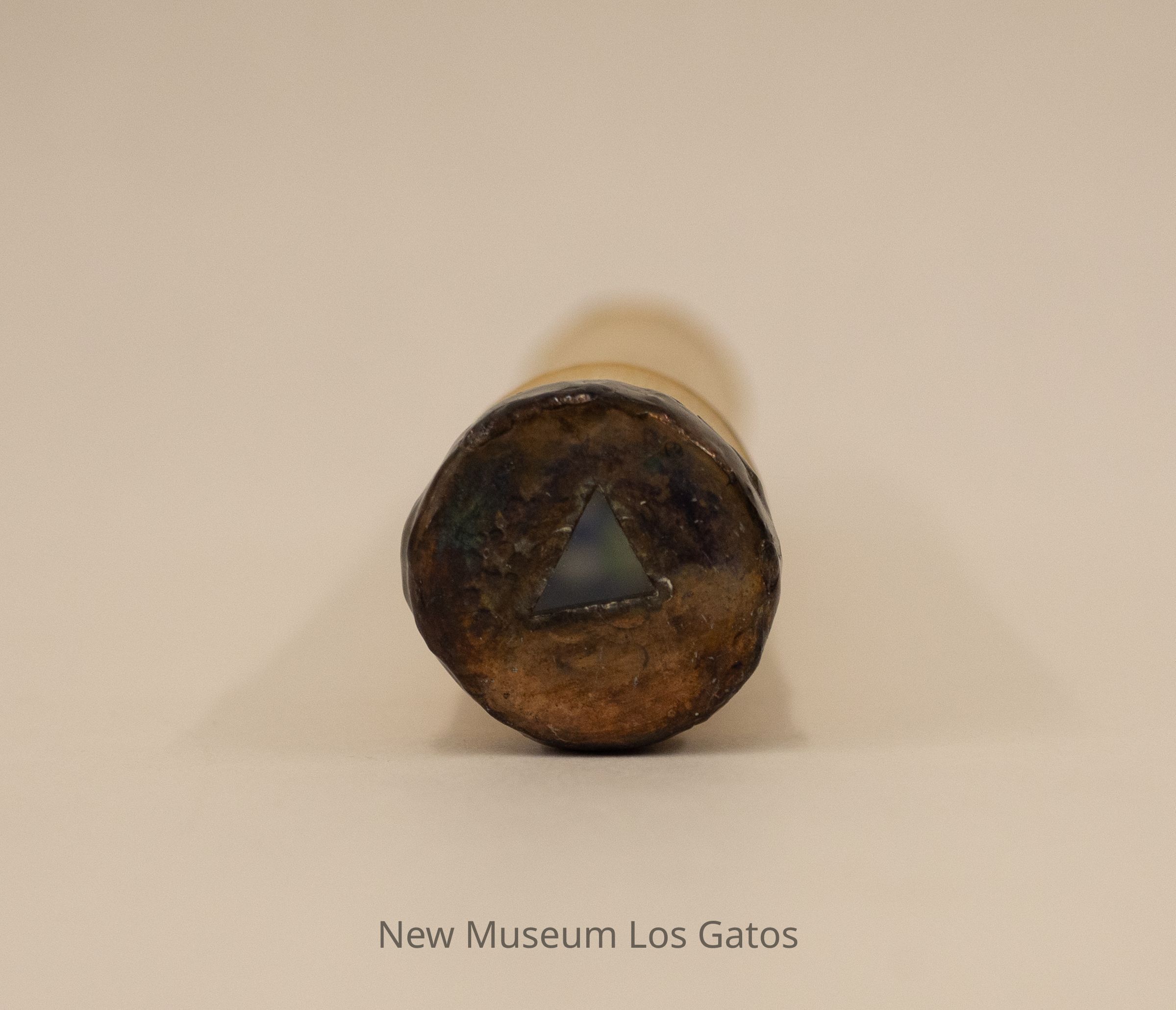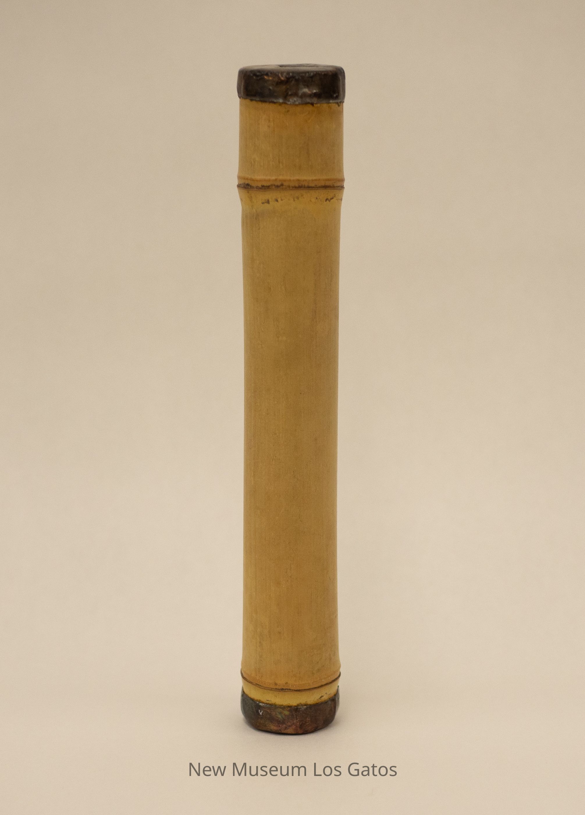 A cylindrical kaleidoscope, that appears to be made out of metal that has been covered to look like bamboo. The exterior of the kaleidoscope is light brown, with raised grooves near each end. Both ends of the kaleidoscope are flat and made out of metal. The viewing side has a small triangle through which to look through, while the other side consists of clear glass with numerous beads in a variety of shapes and colors inside, to create the patterns.Collection