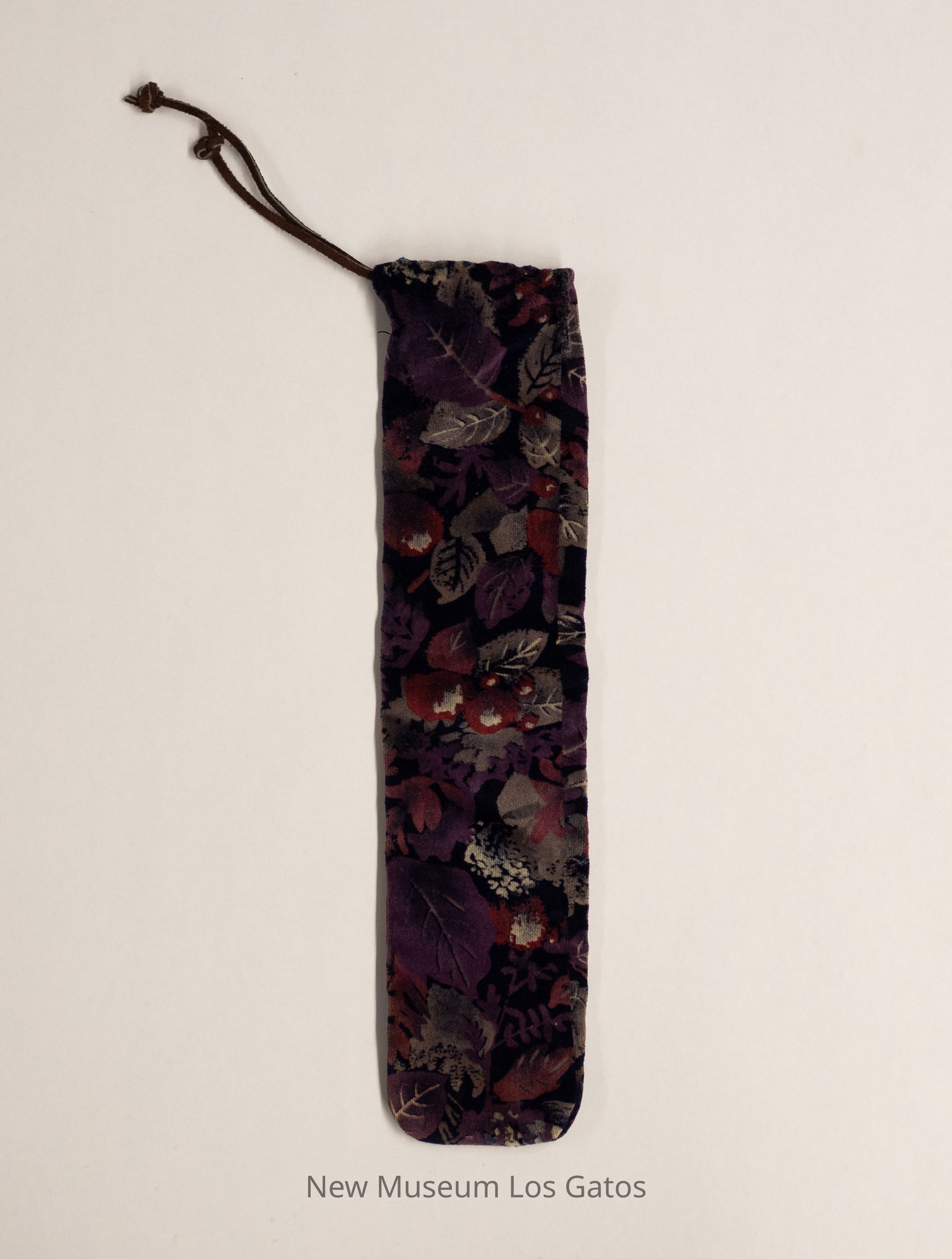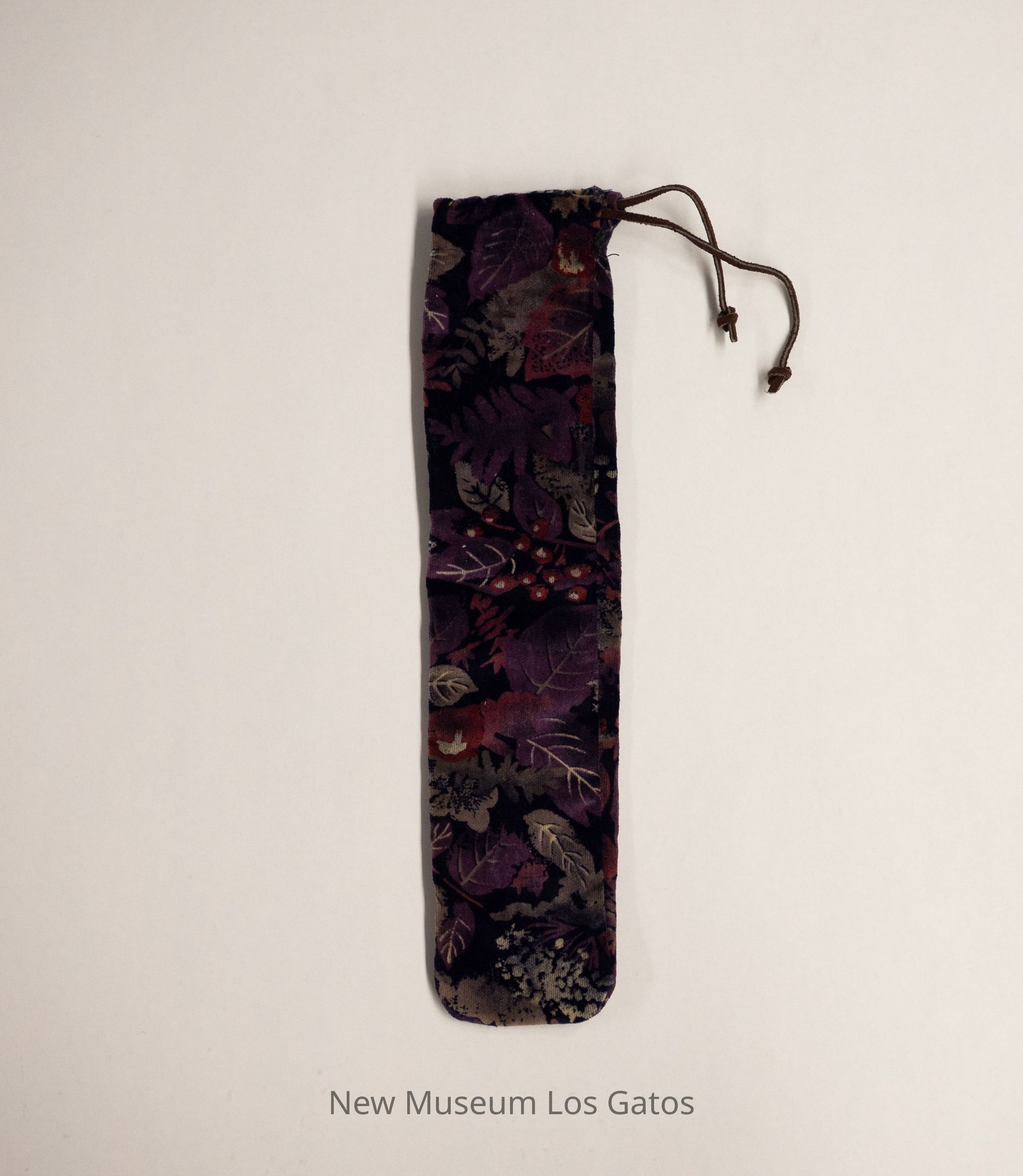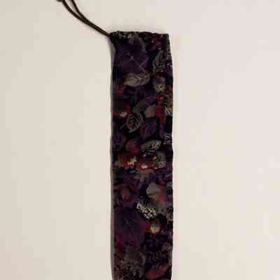 A long, skinny velvet drawstring bag. The bag is black, with a purple, red, and gray/green leaf pattern throughout. The bag closes with dark brown rope, that is knotted at both ends.Collection