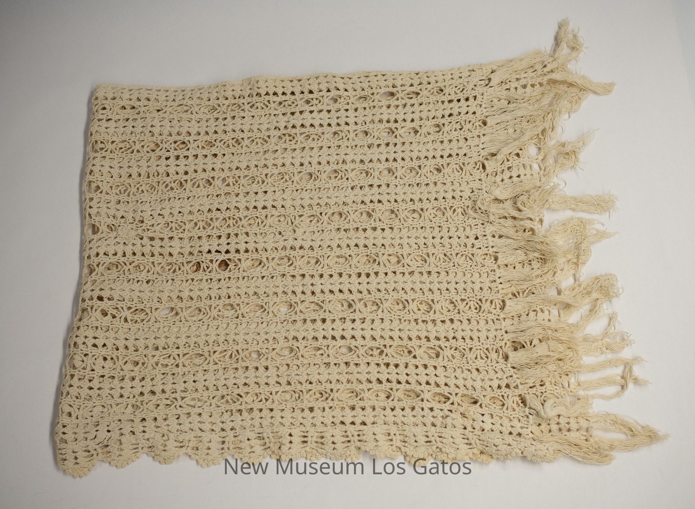 A white, knit table runner. The knit pattern is large-scale, and features rows of larger circles alternated with rows of closer triangles. There is fringe at both short ends.