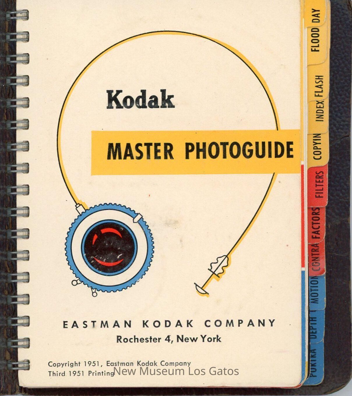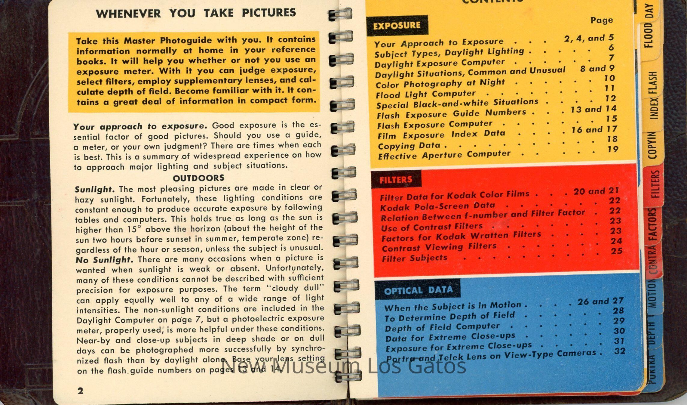 A small, spiral-bound guide to photography. The front and back covers are a black, leather-like material. The guide includes sections on exposure, filters, and optical data.Collection