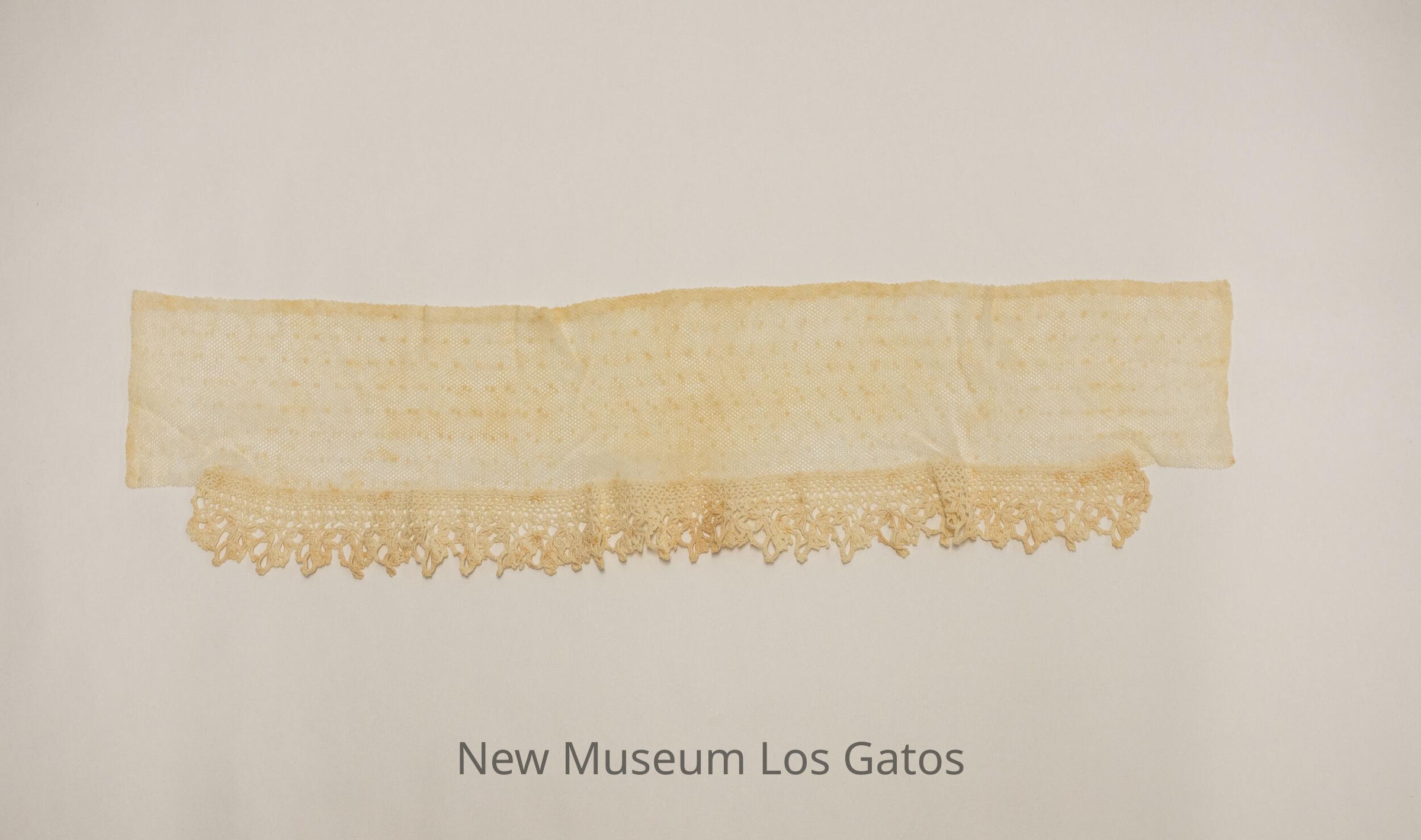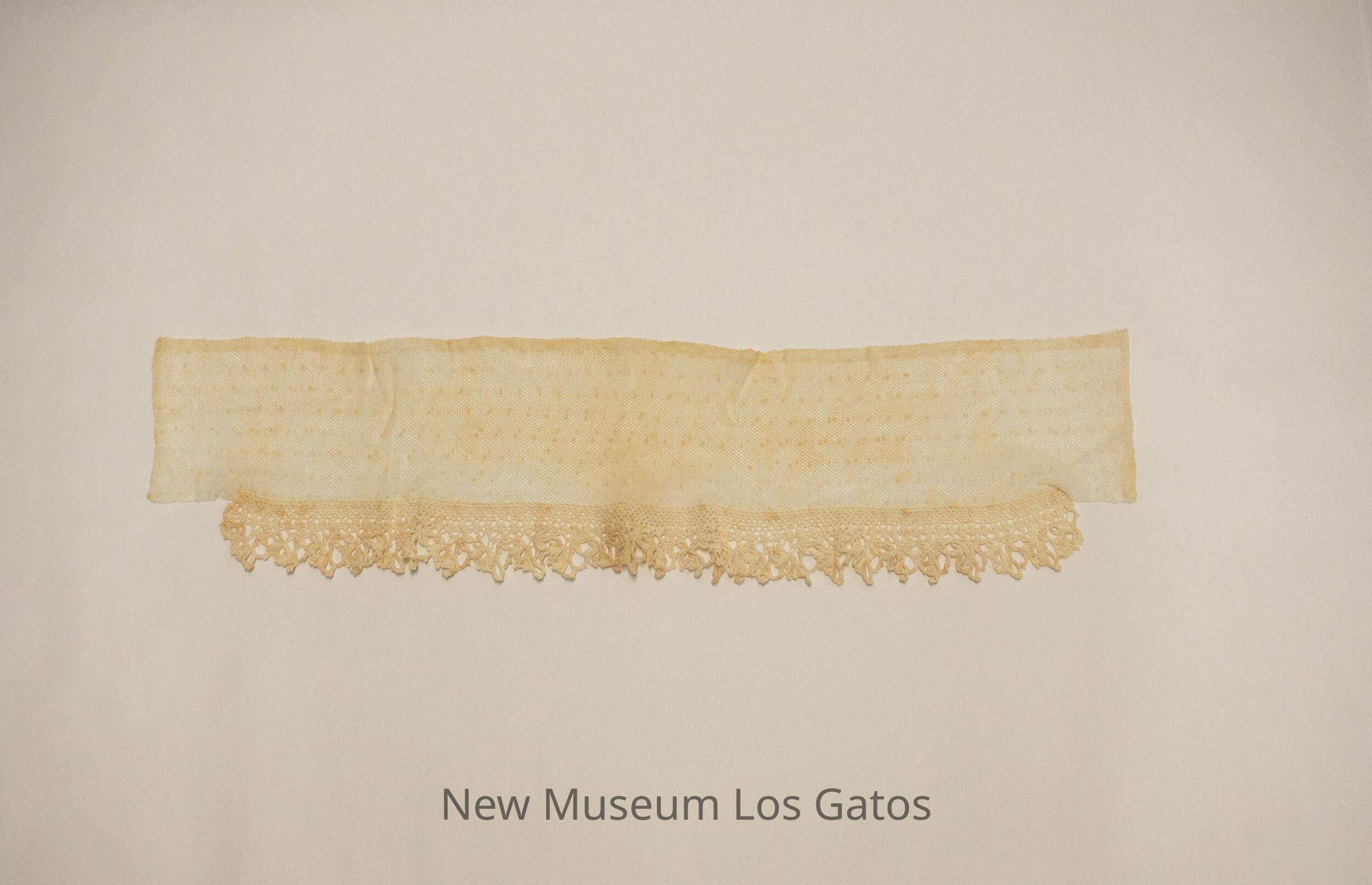 A long, rectangular lace collar, with crocheted netting along the majority of the bottom edge of the collar.Collection