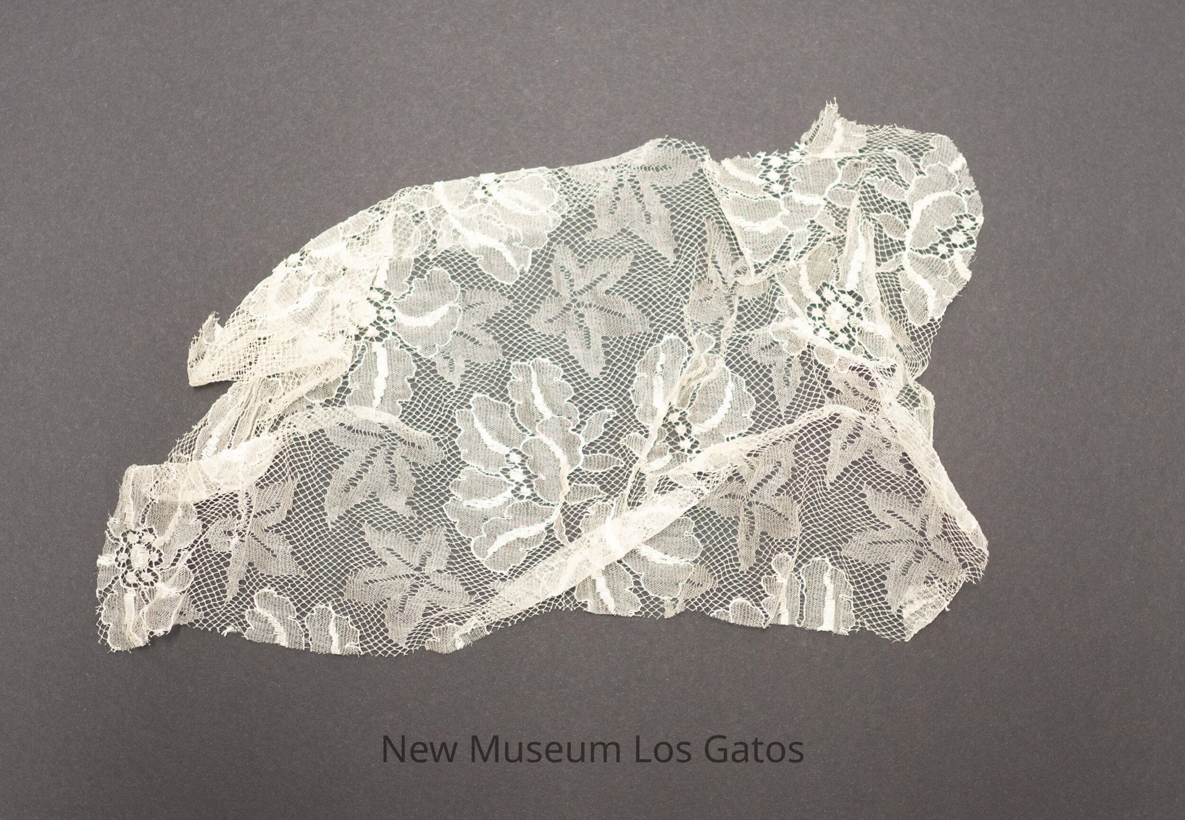 Rectangular piece of lace, with floral patterning throughout. Previous records and tag indicates that there are five pieces of lace edging associated with this number, but there is only one piece currently in this box.