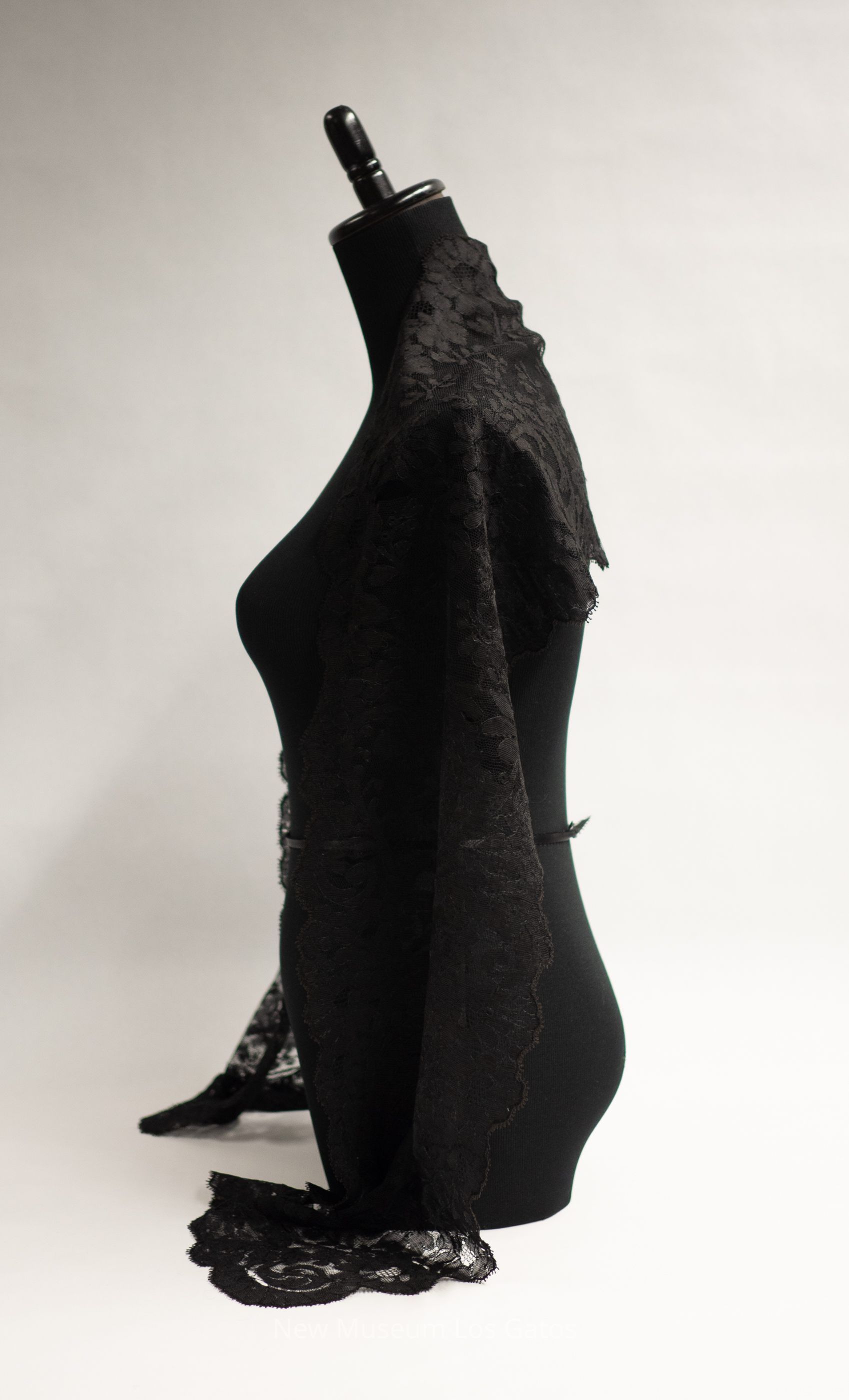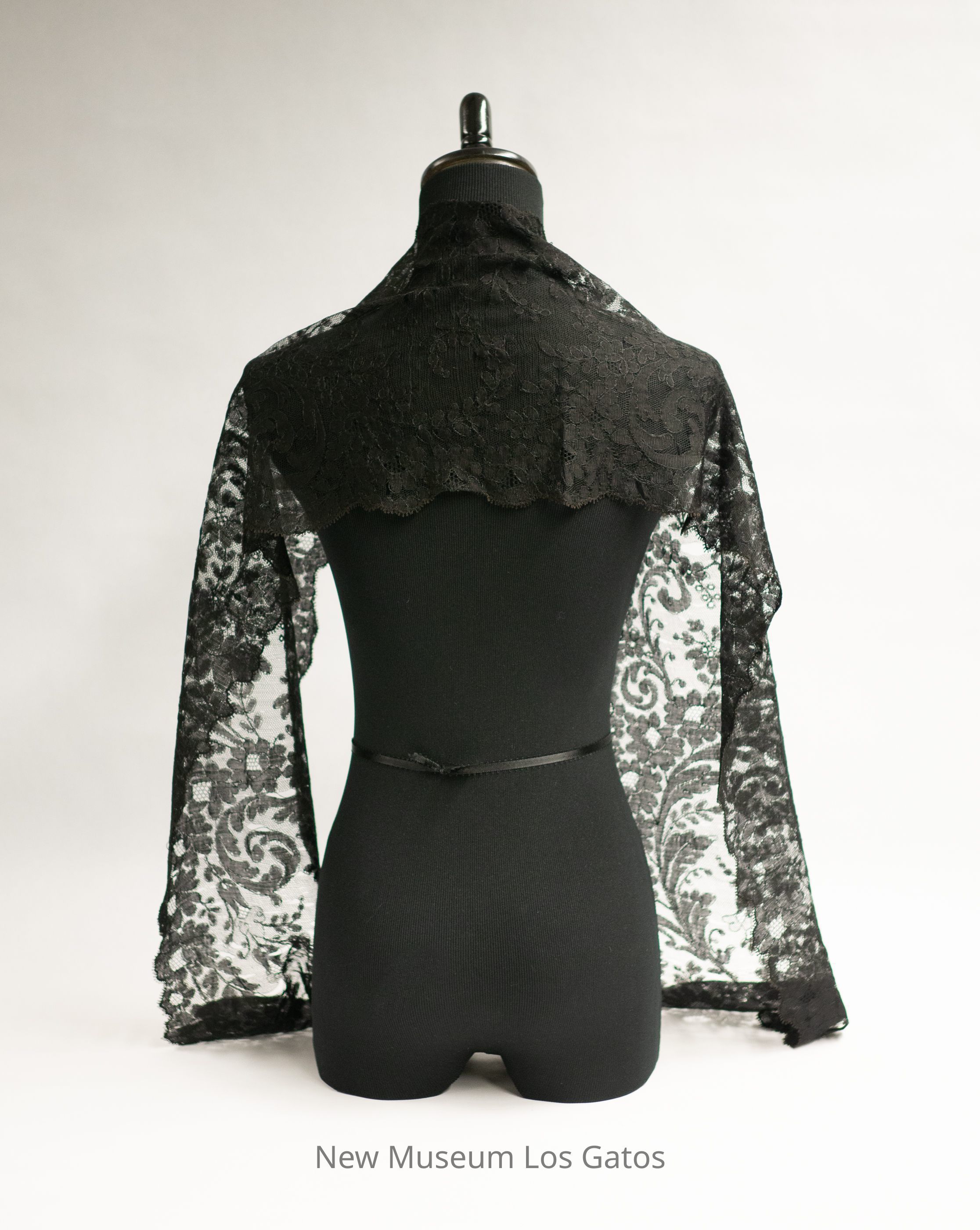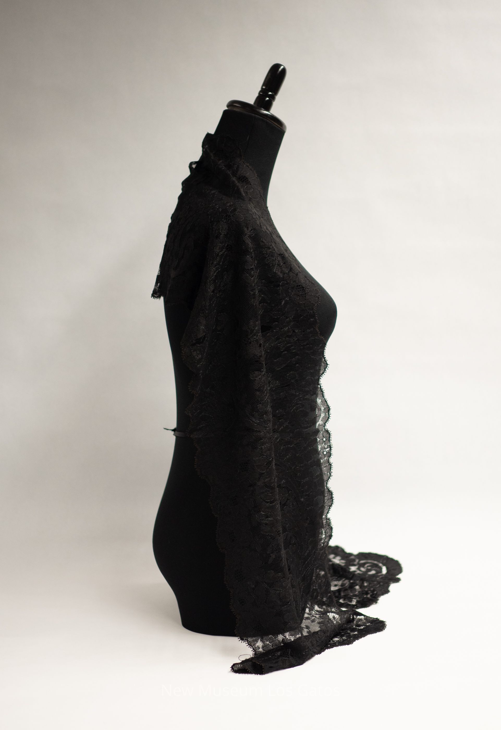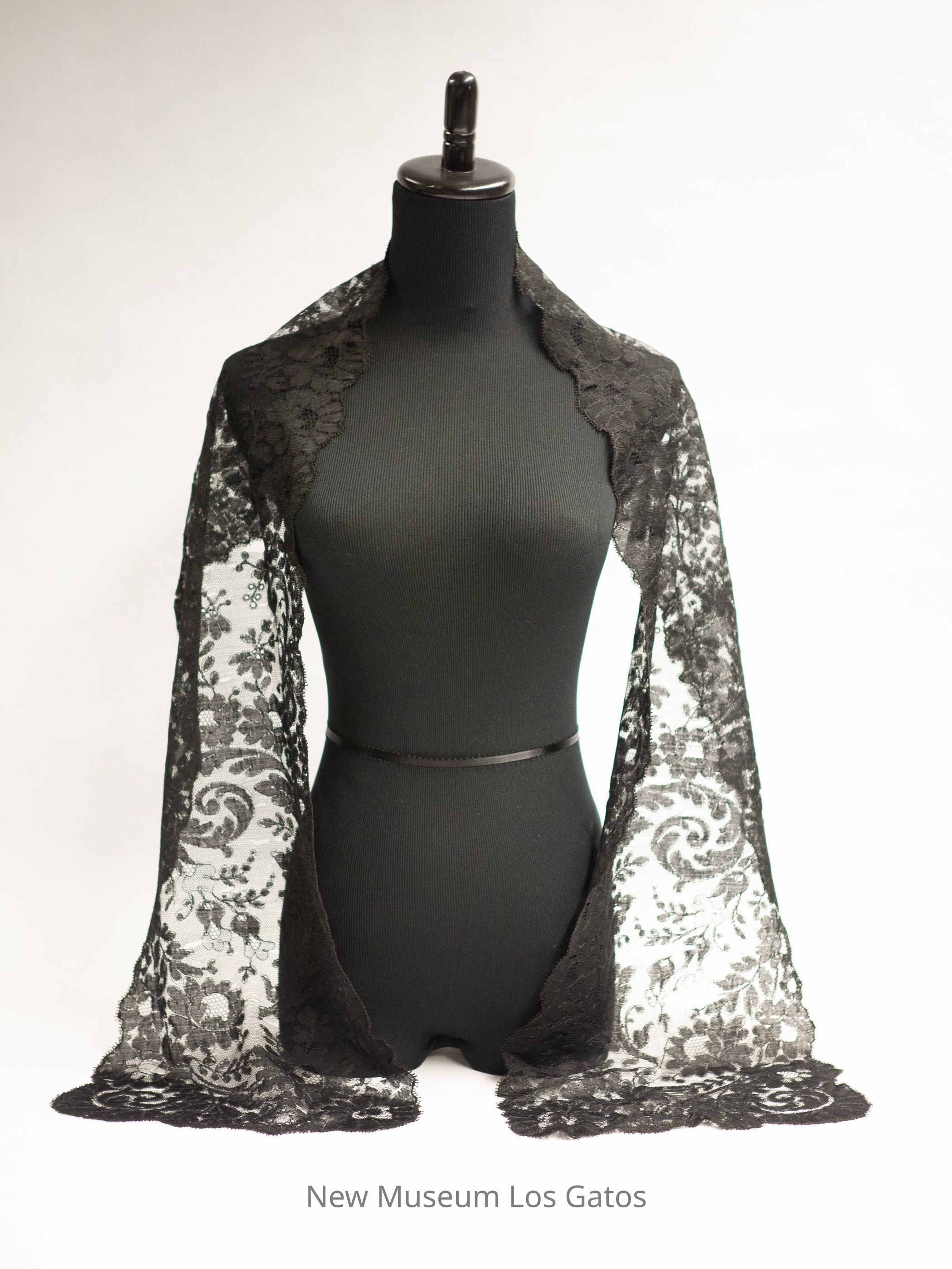 A long, black Chantilly lace shawl featuring a floral pattern. All four edges are scalloped.