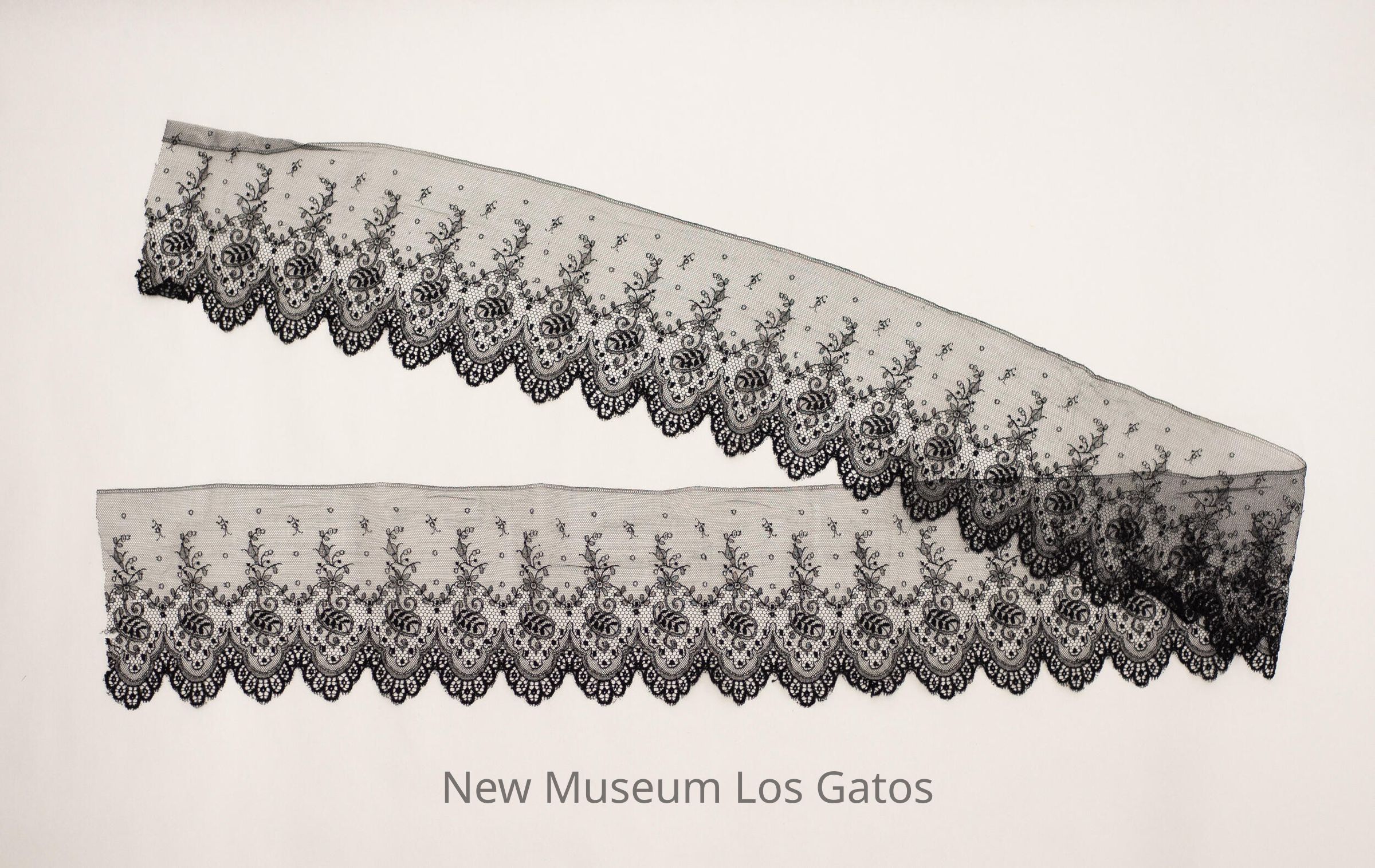 A long piece of black lace that is straight along the top edge and scooped along the bottom edge. The lace pattern is more intricate near the bottom and middle section of the strip, and features polka dots closer to the top.Collection