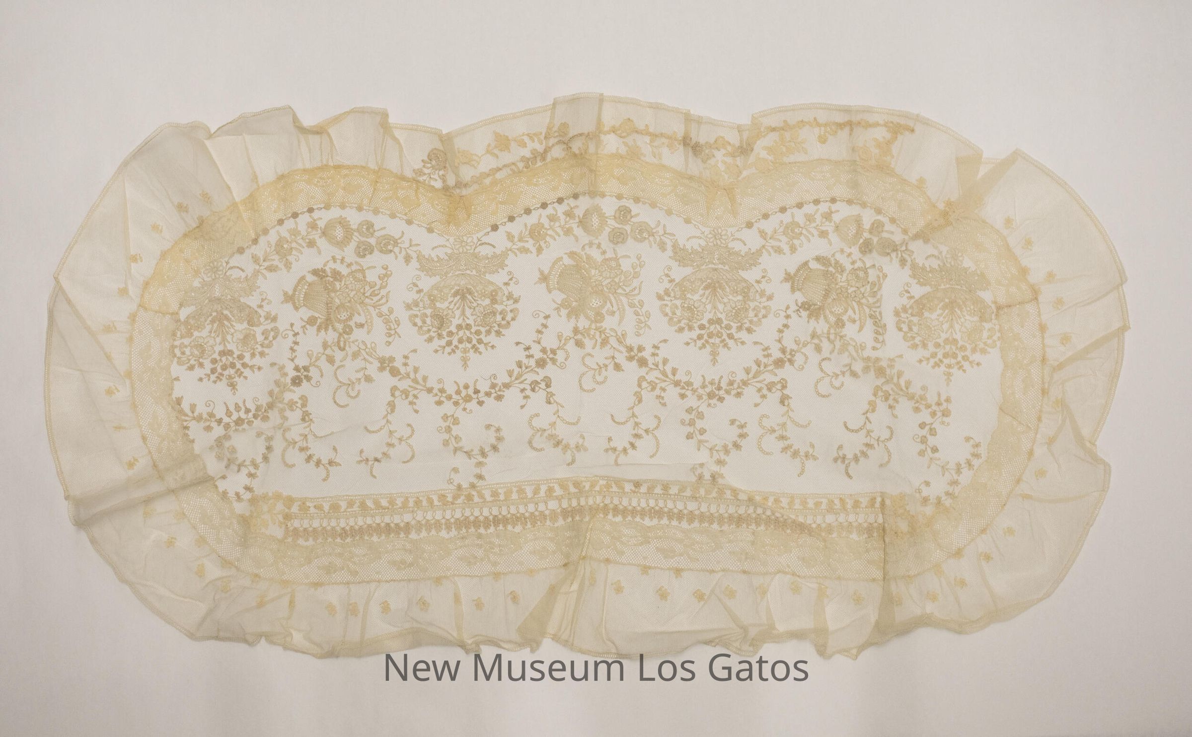 An elongated, oval lace table runner, with a floral pattern in the center.