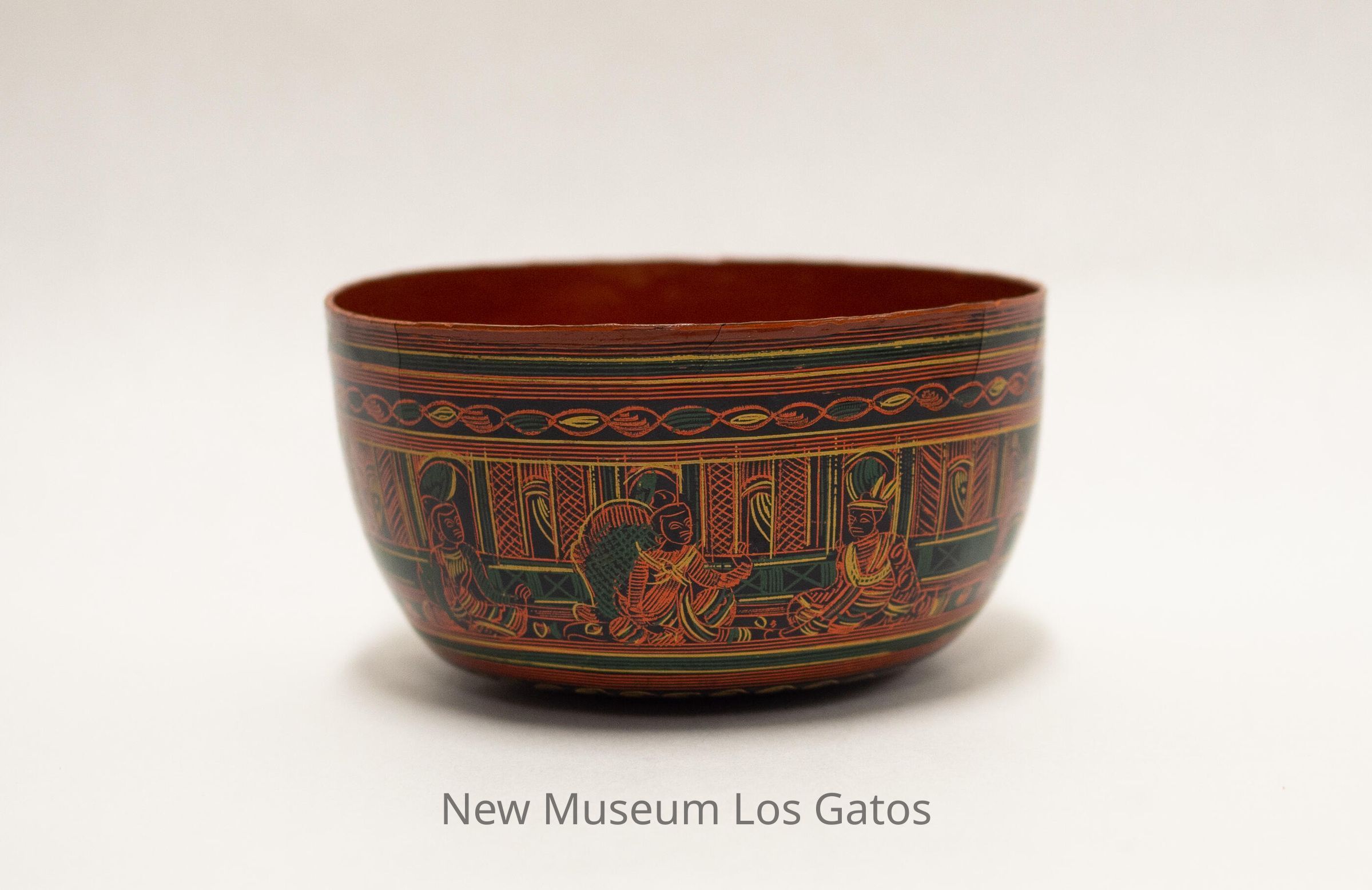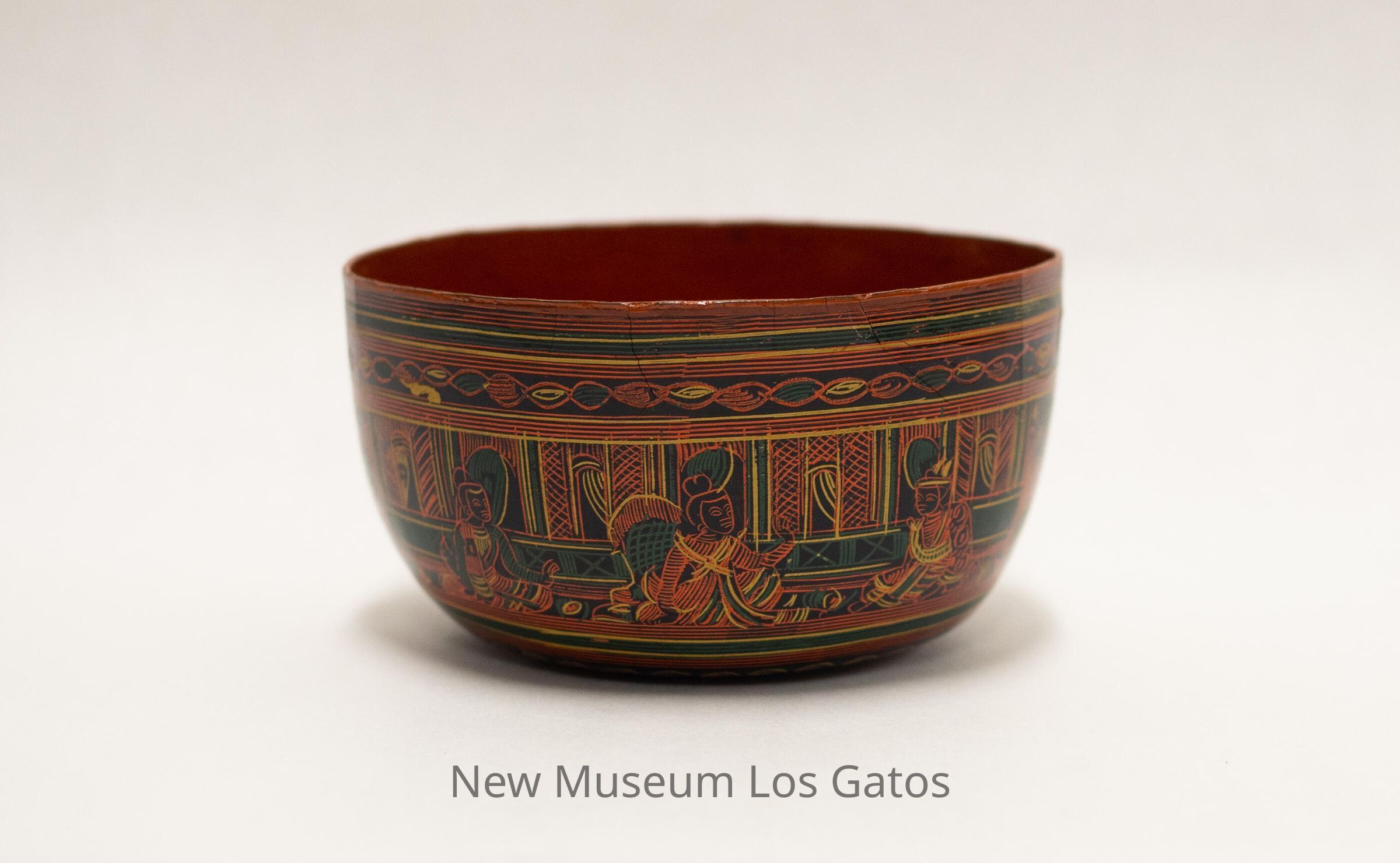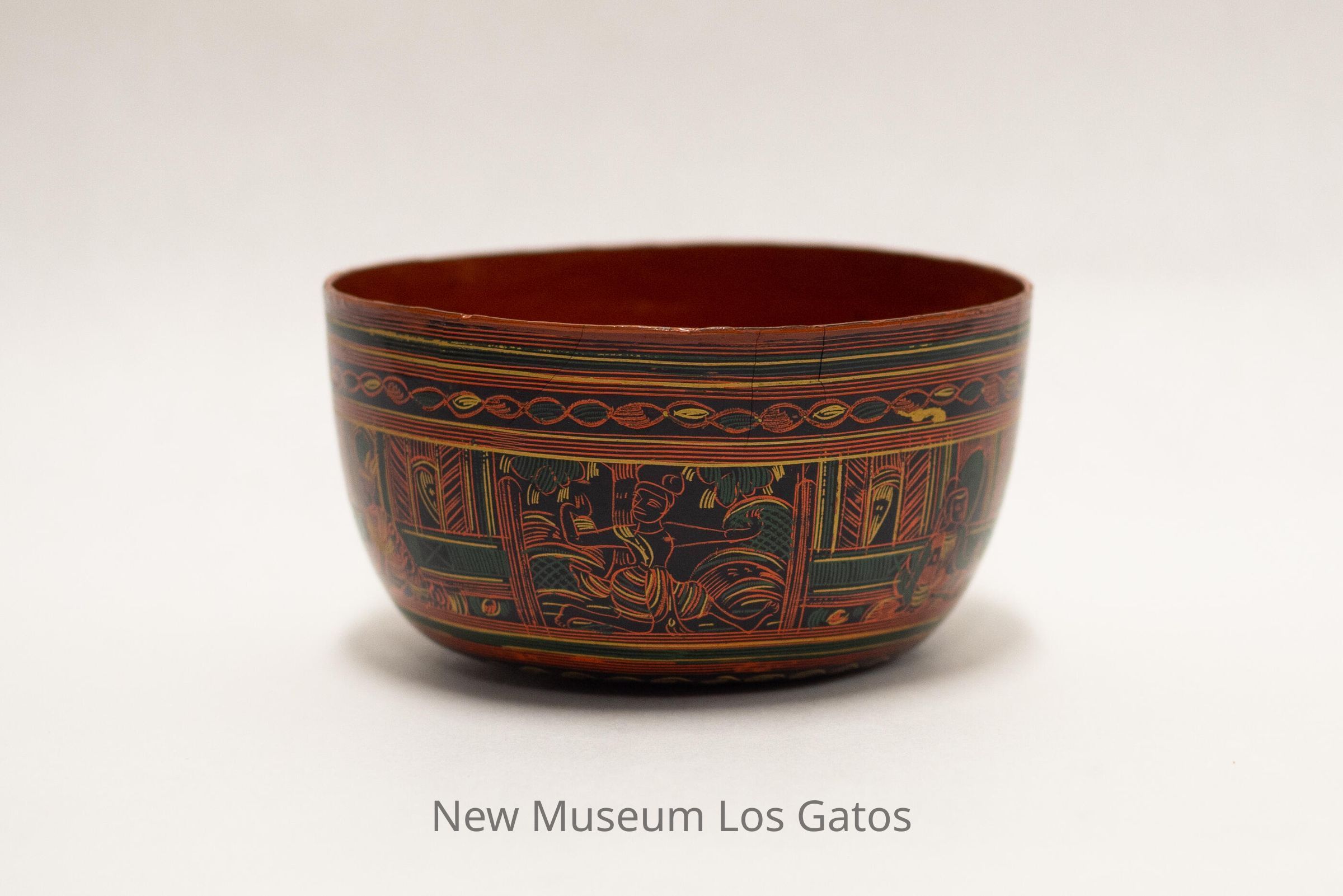 A set of three lacquer bowls. Two of the lacquer bowls are shallow and circular, and are black on the outside and red on the inside. The third bowl is larger and circular, and also red on the inside. On the outside of the larger bowl are intricate black, yellow, red, and green decorations featuring numerous seated figures as well as geometric designs.Collection