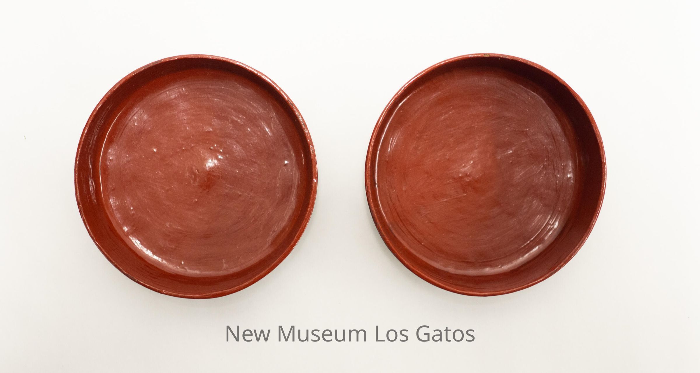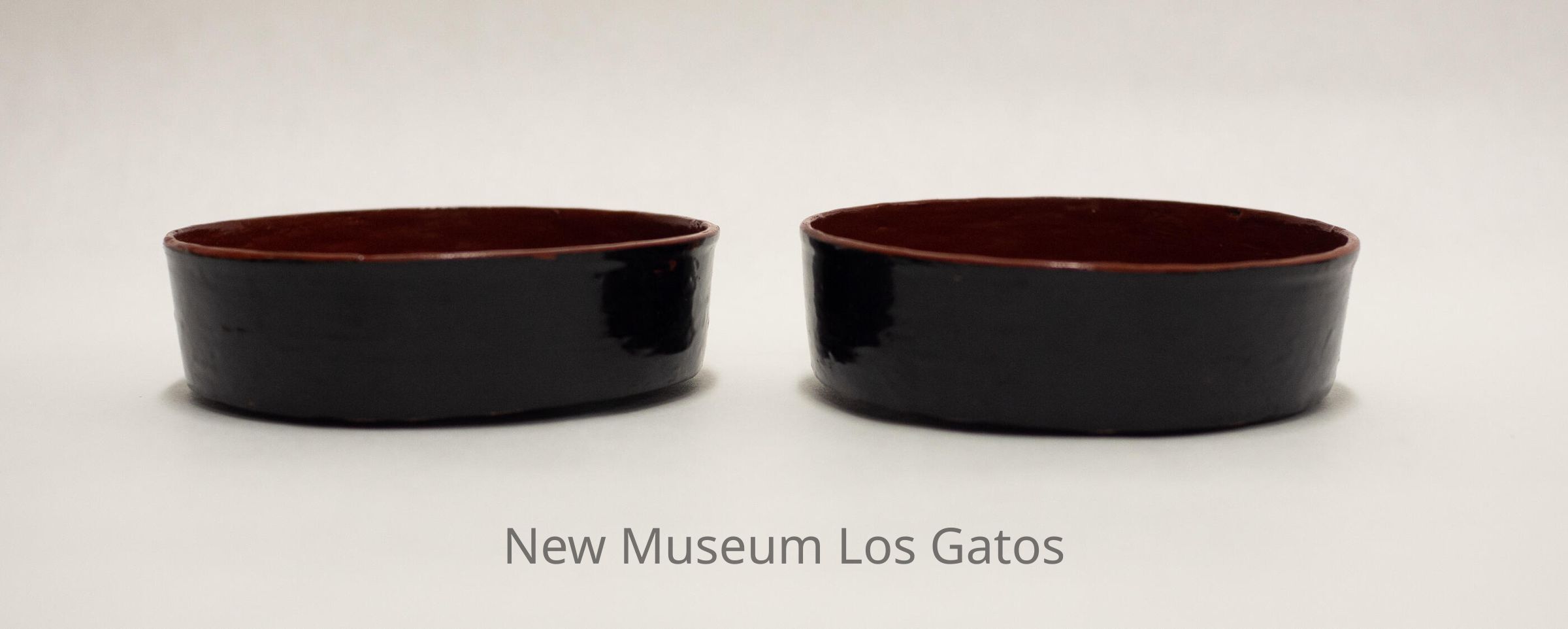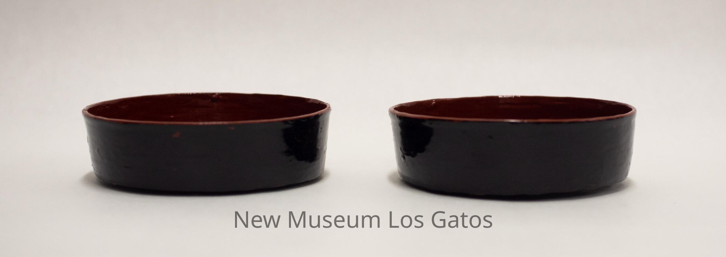 A set of three lacquer bowls. Two of the lacquer bowls are shallow and circular, and are black on the outside and red on the inside. The third bowl is larger and circular, and also red on the inside. On the outside of the larger bowl are intricate black, yellow, red, and green decorations featuring numerous seated figures as well as geometric designs.Collection