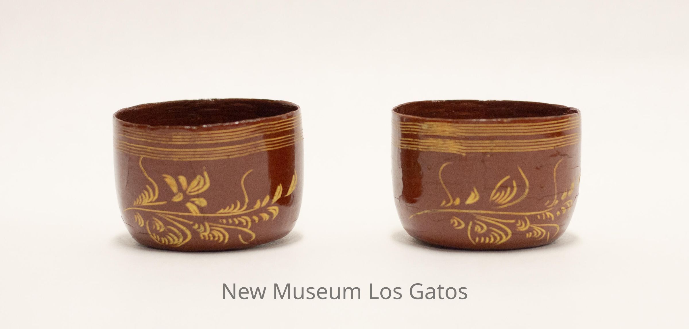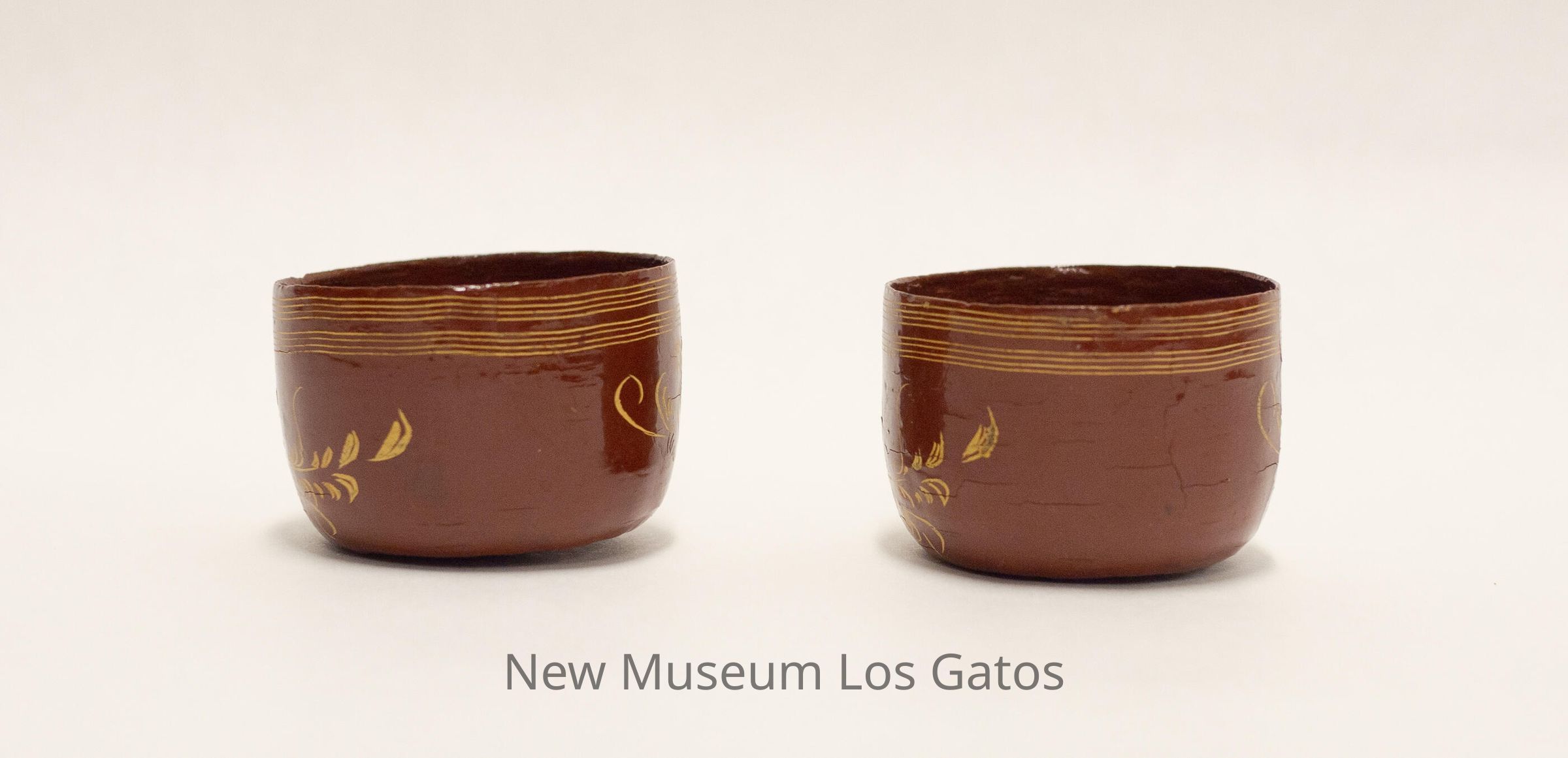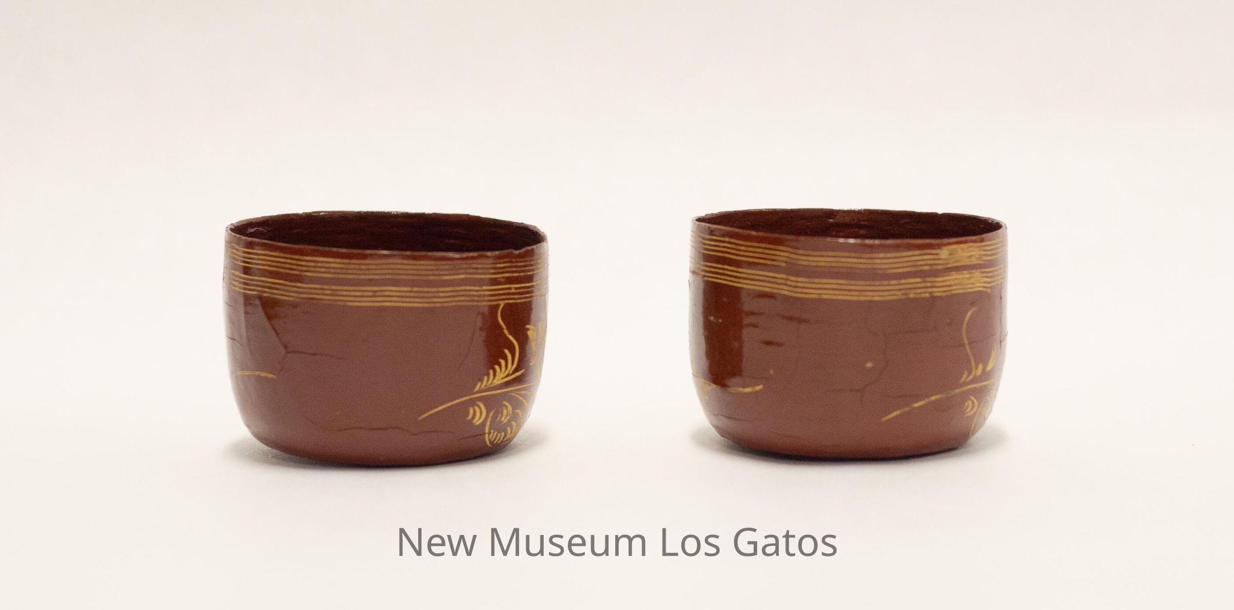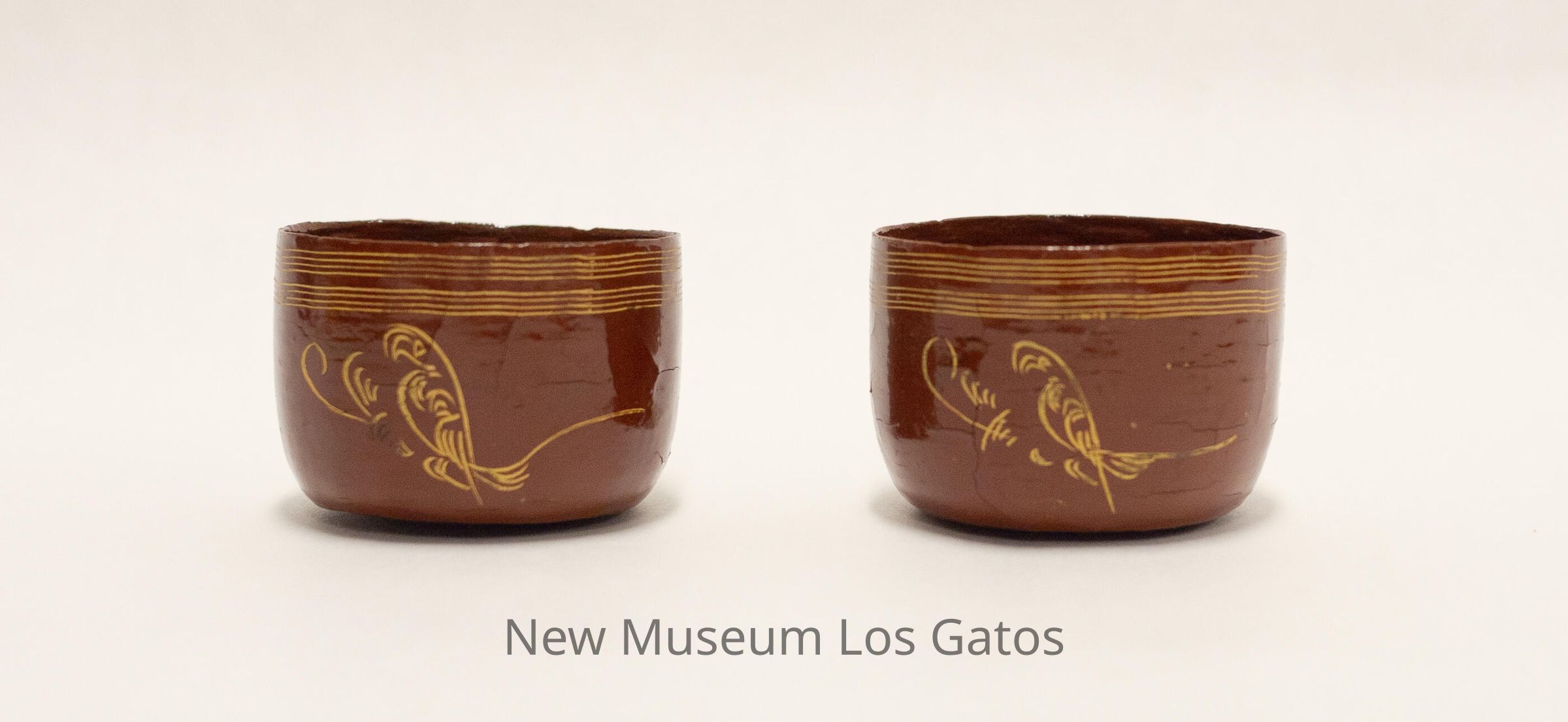 A pair of matching small, brown lacquer cups. The cups do not have handles, and feature gold decorative painting. There are gold stripes along the top of the cups, and a gold floral motif on one side with a gold bird on the other side.Collection