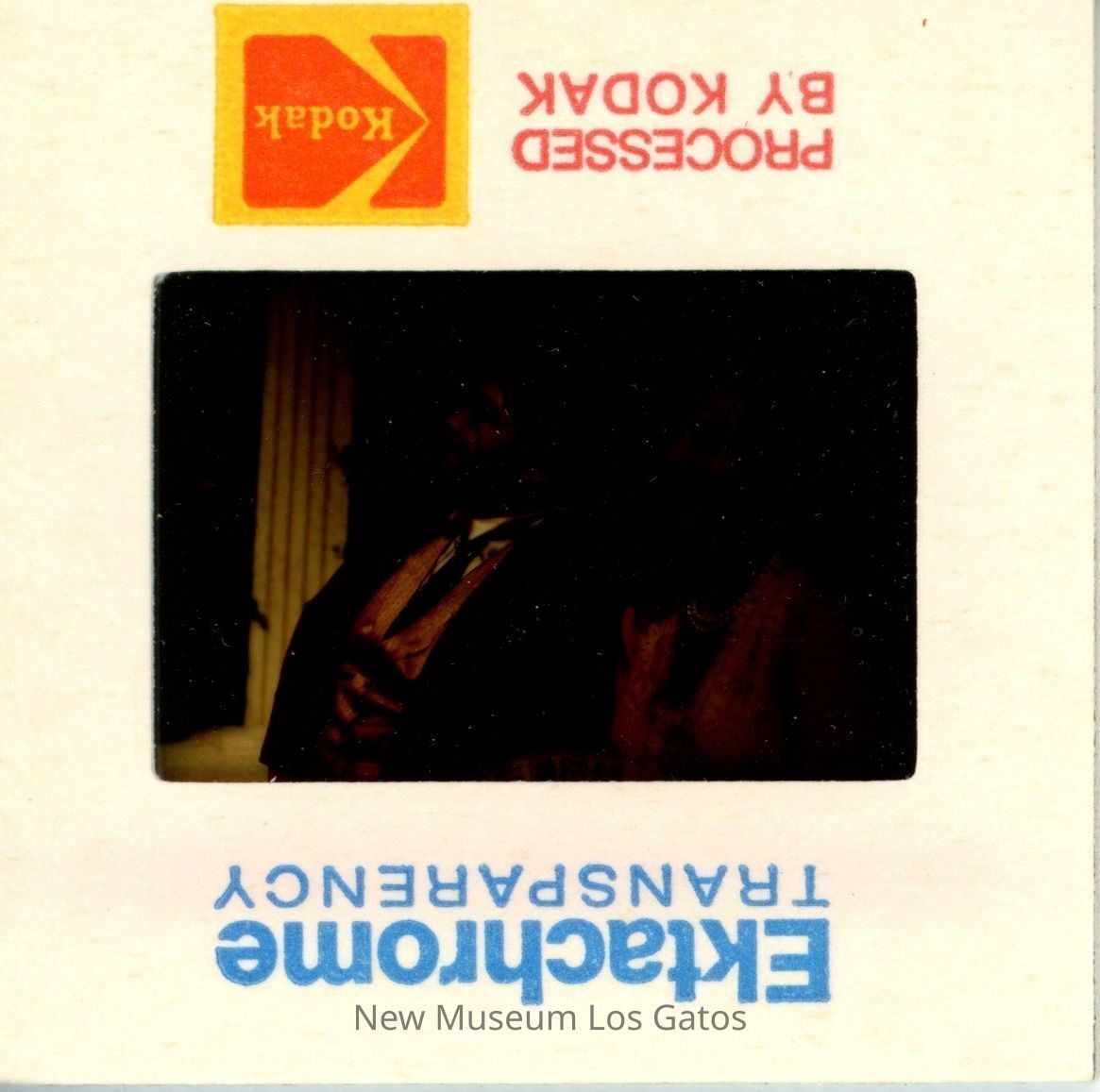 Two color slide photographs from the production of "Lady Audley's Secret." One image depicts a male and female actor seated, looking off into the distance, while the other image depicts two male actors, seated, with one holding a cane.Collection