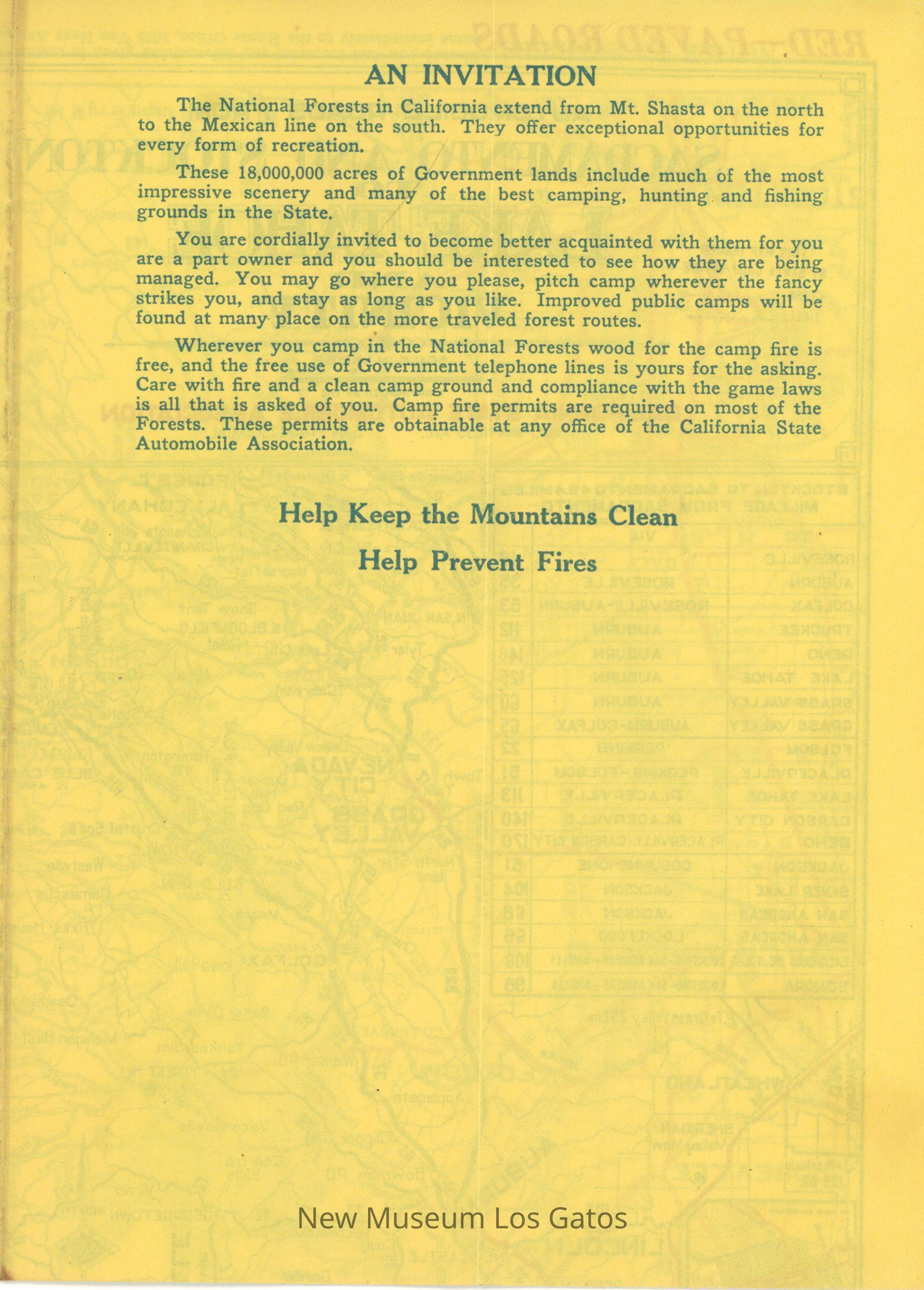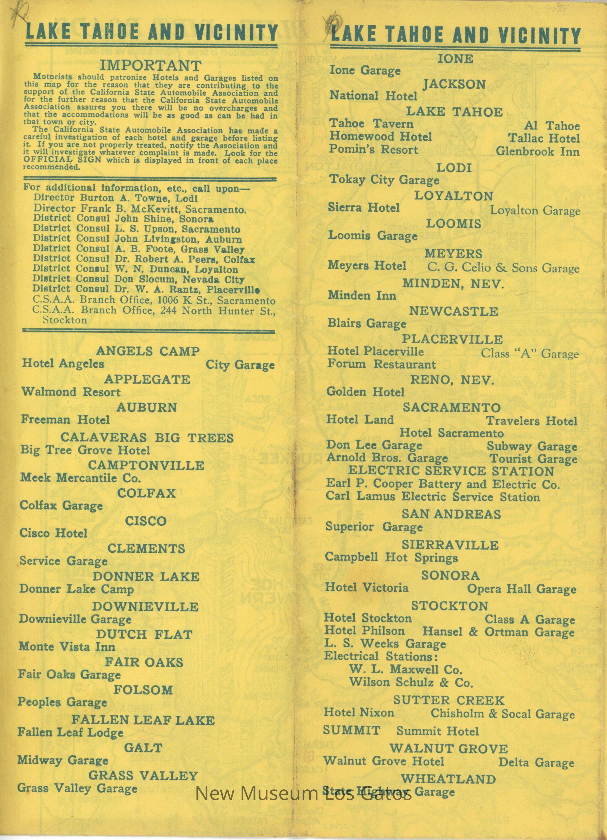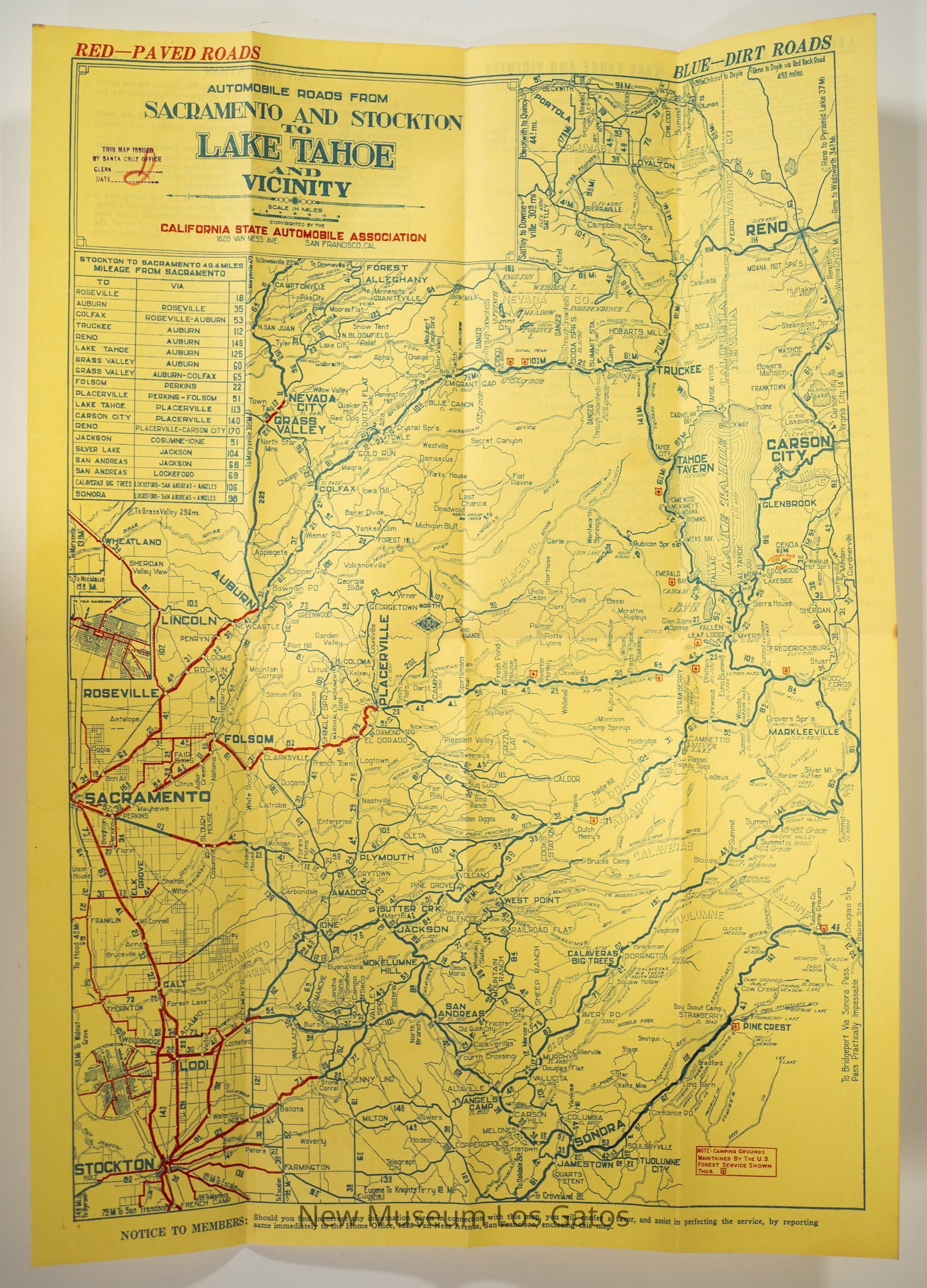 A foldable map, depicting the roads, both paved and unpaved, that go from Sacramento and Stockton to Lake Tahoe and the vicinity of Lake Tahoe. There is also information about where to stay in the Lake Tahoe area, garages in the area, and an invitation to visit national forests.Collection