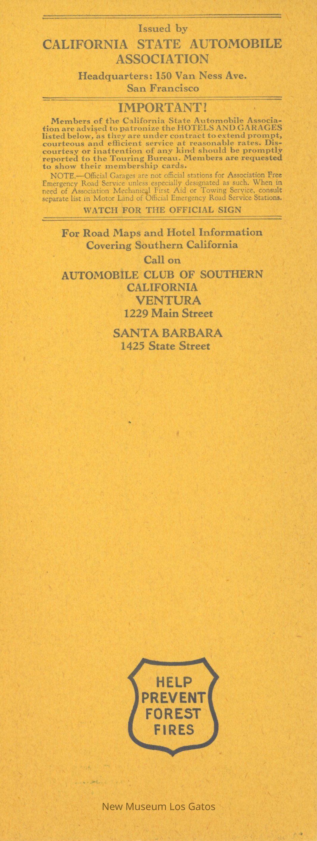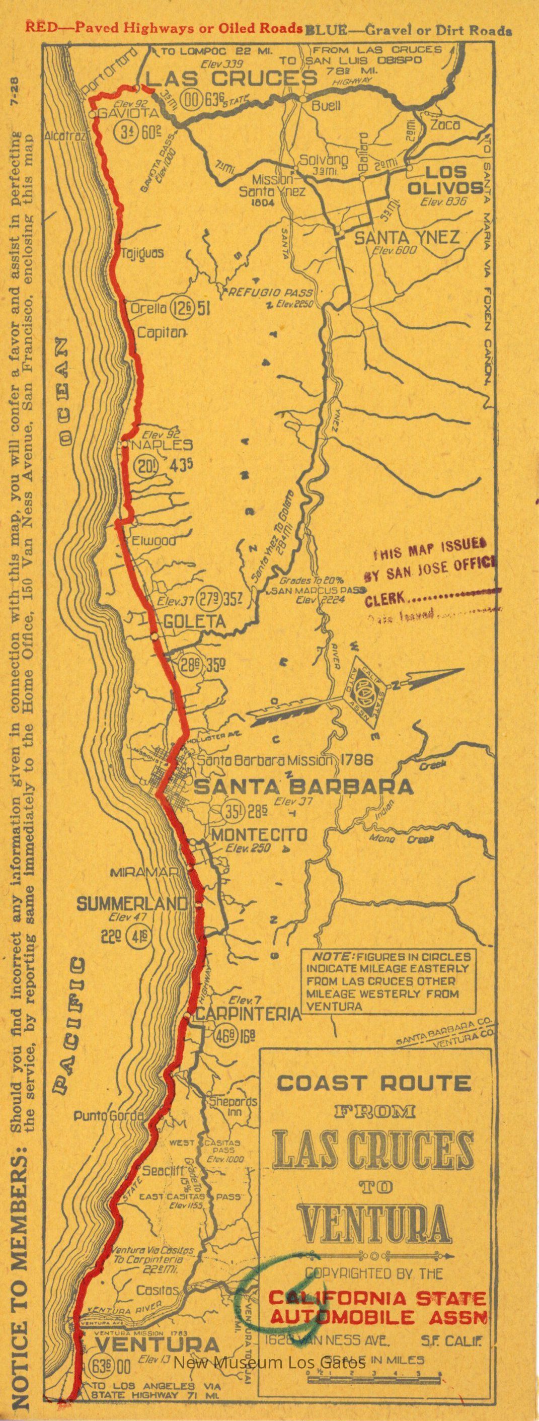A small, single-sheeted cardstock map, depicting the highways and roads, both paved and unpaved, that depict the coastal route from Las Cruces to Ventura. There is also information about contacting the Automobile Club of Southern California for hotels in the area on the back.Collection