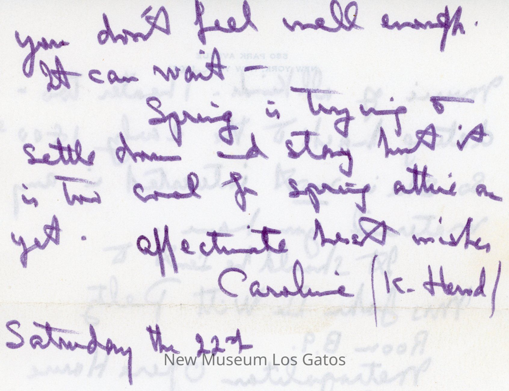 A handwritten letter, in purple ink, from a Caroline. The intended recipient is not clear.