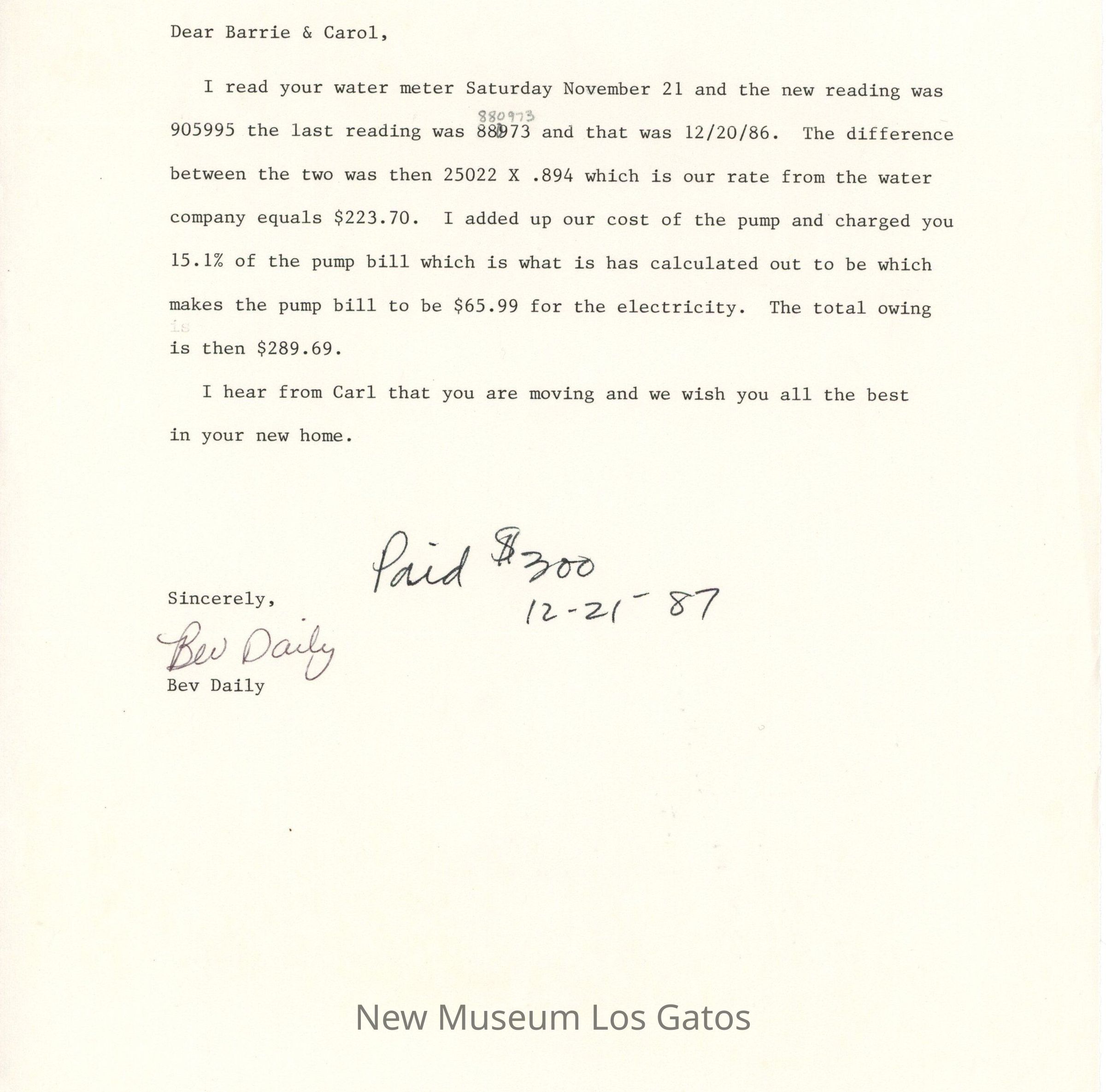 A photocopy of a typed letter to Barrie and Carol Coate, from Bev Daily, regarding the water bill. The letter is dated January 2, 1987. There is a note inscribed on the letter, that the bill was paid December 21st, 1987.