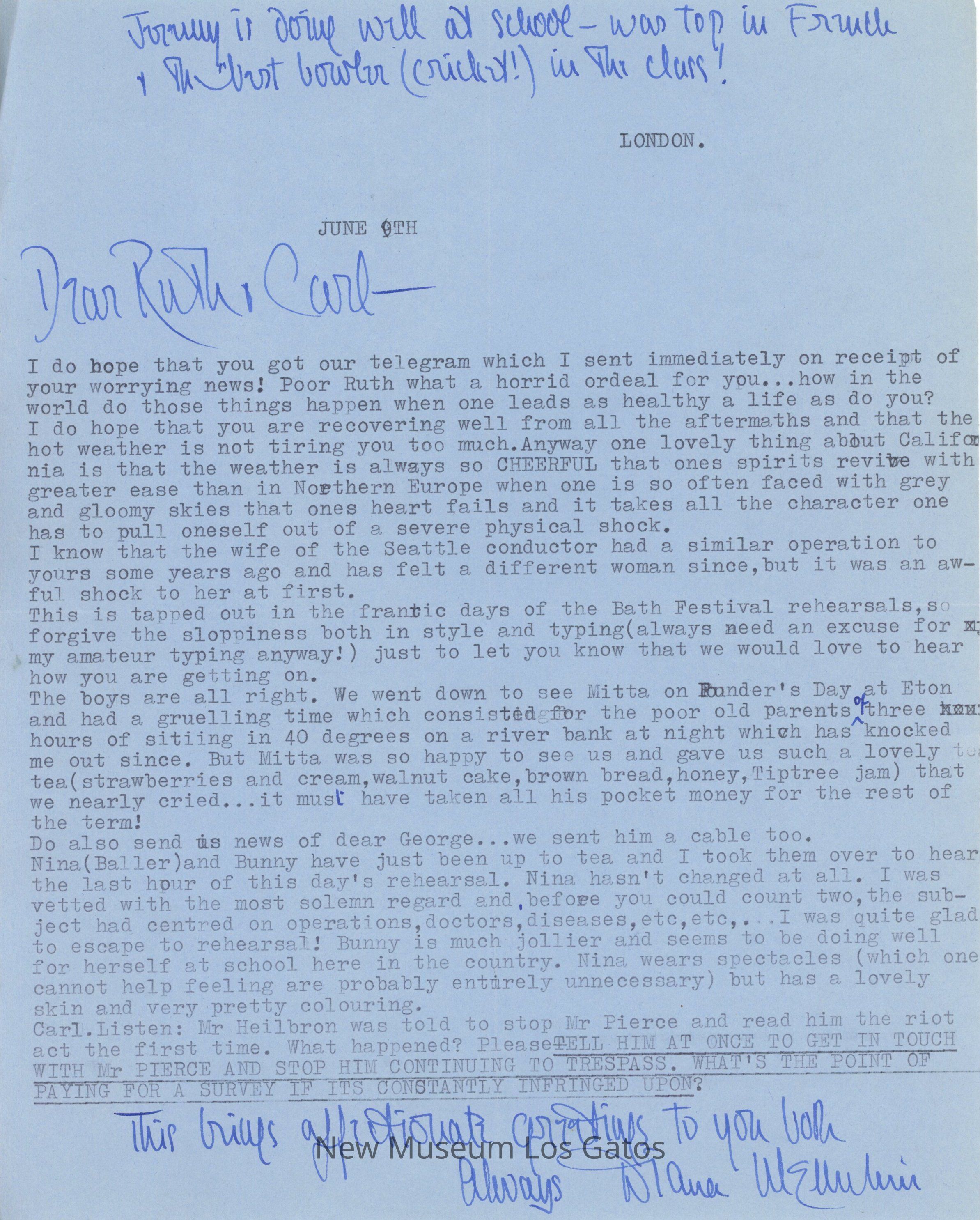 I do hope that you got our telegram which I sent immediately on receipt of your worrying news! Poor Ruth what a horrid ordeal for you.. how in the world do those things happen when one leads as healthy a life as do you? I do hope that you are recovering well from all the aftermaths and that the hot weather is not tiring you too much. Anyway one lovely thing about California is that the weather is always so CHEERFUL that ones spirits revive with greater ease that in Northern Europe when one is so often faced with grey and gloomy skies that ones heart fails and it takes all the character one has to pull oneself out of a severe physical shock.