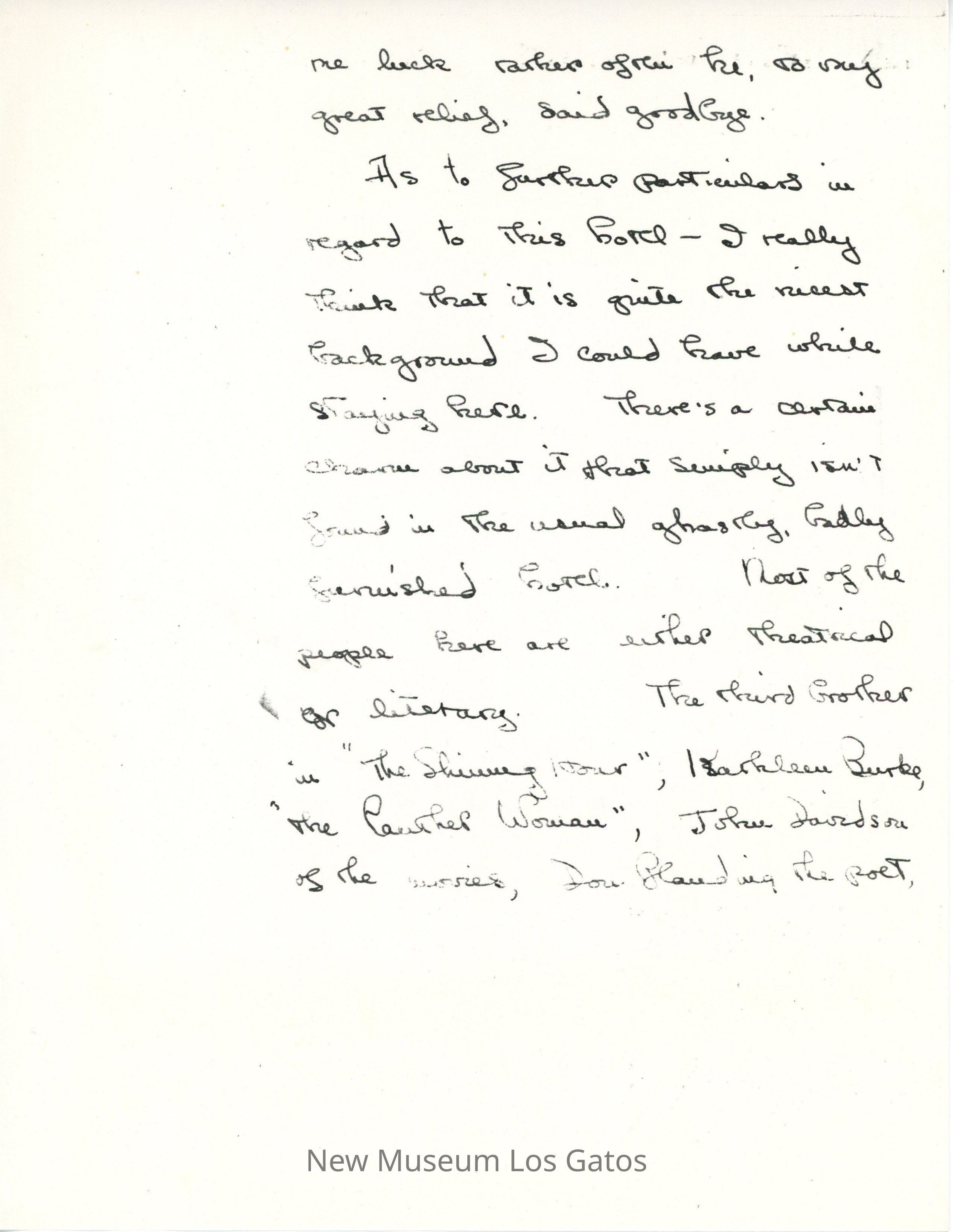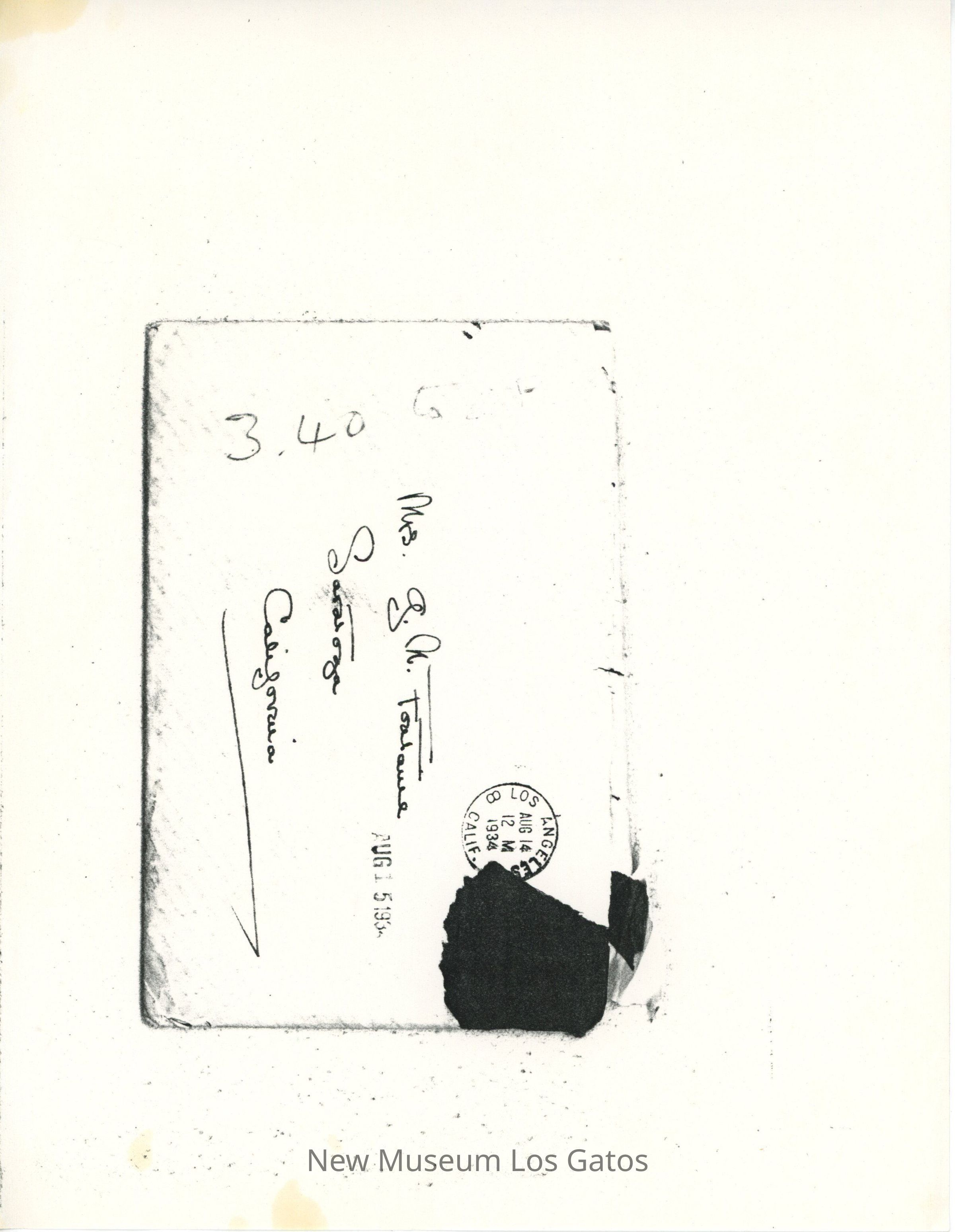 Three-page black and white incomplete photocopy of a letter and envelope from Olivia deHavilland to Joan Fontaine. The envelope is dated August 14th, 1934. The letter is missing at least one page, at the start.