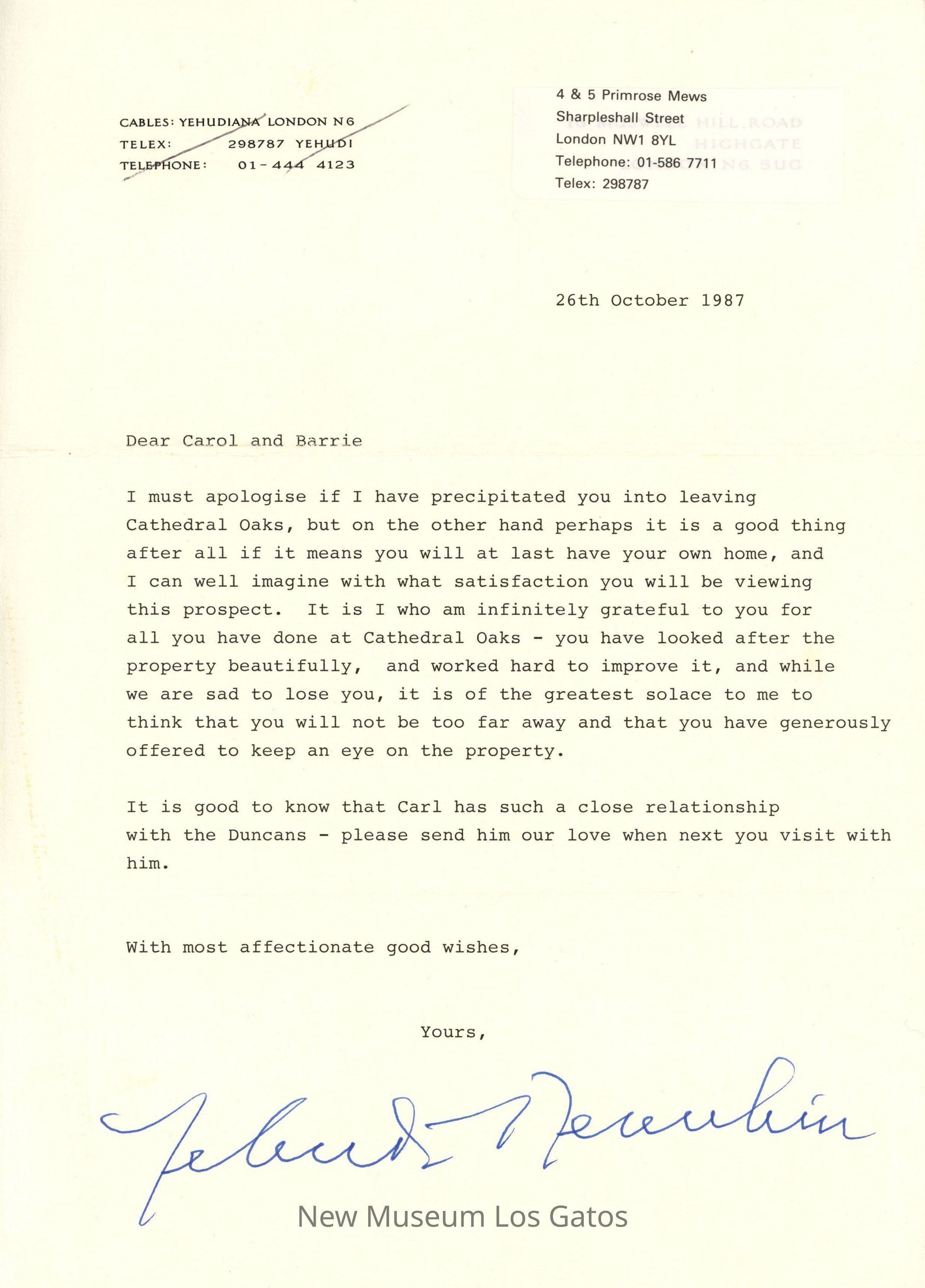 A single page, typed letter from Yehudi Menuhin to Barrie and Carol Coate. The letter is dated October 26th, 1987. The letter is typed onto custom stationery, with the Menuhin address at the letterhead, which has been pasted over with a different address. The letter is signed at the bottom.Collection