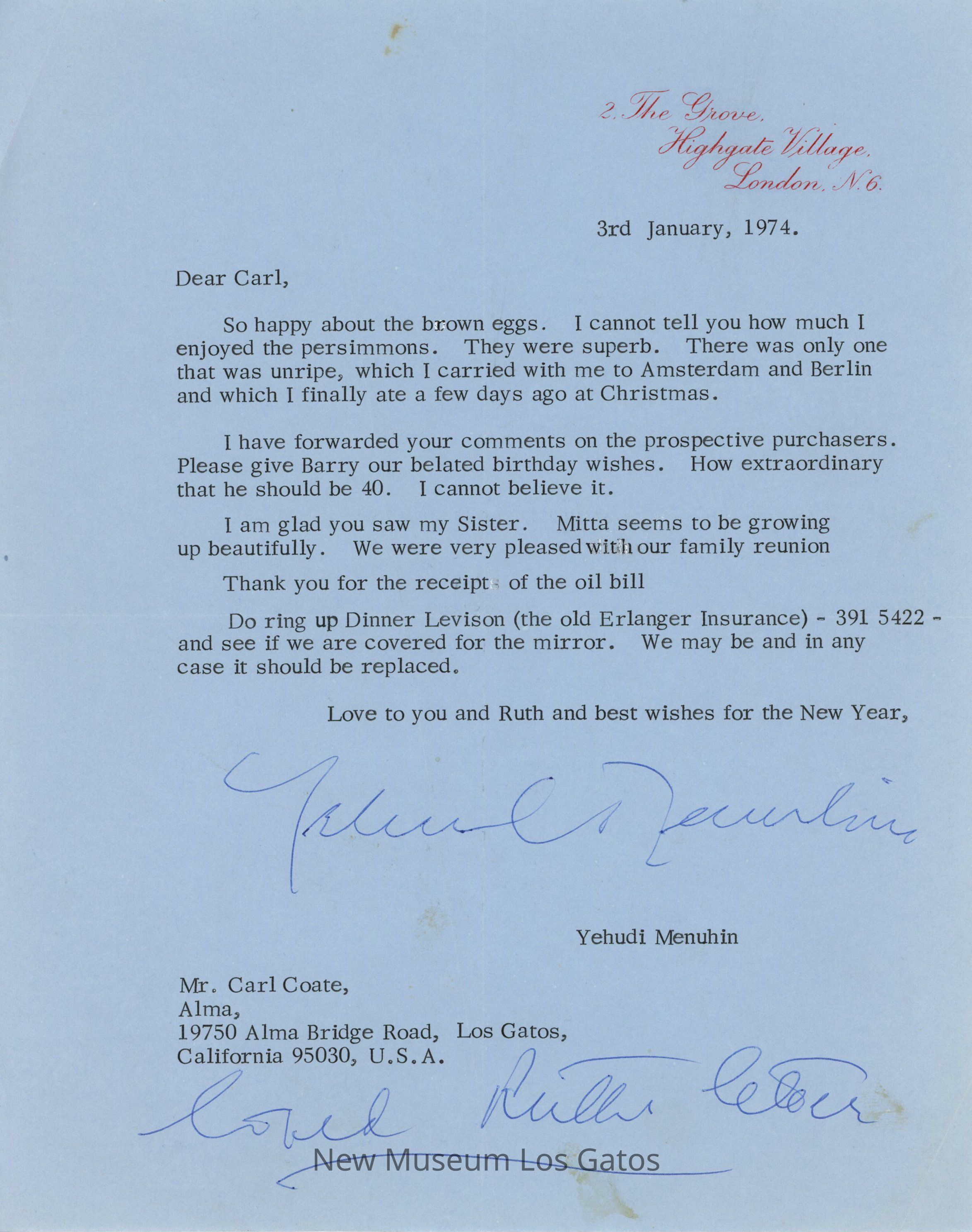 A single page, typed letter from Yehudi Menuhin to Carl Coate. The letter is dated January 3rd, 1974. The letter is typed onto custom stationery, with the Menuhin address at the letterhead. The letter is signed at the bottom. Carl Coate's address is also at the bottom.Collection