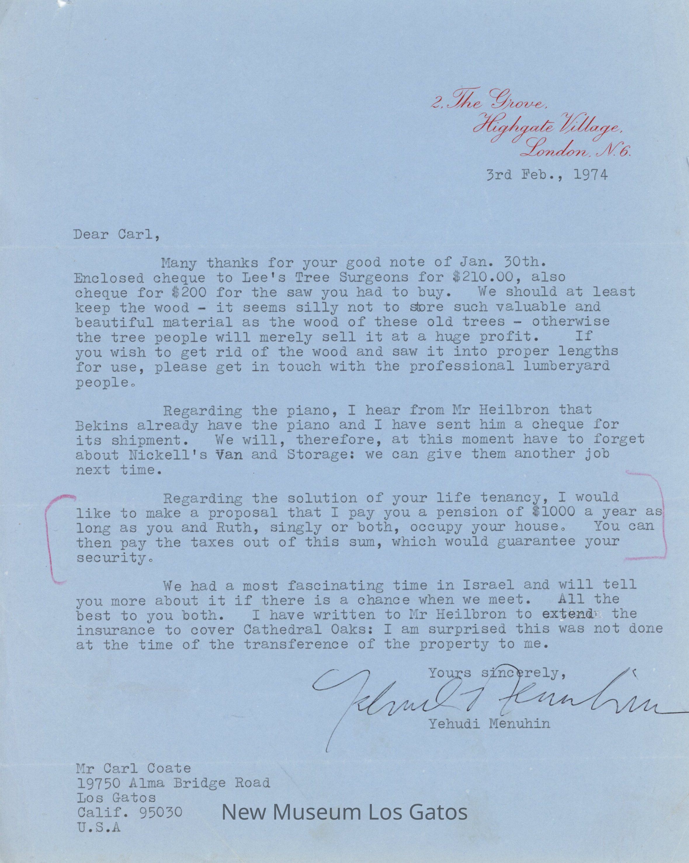 A single page, typed letter from Yehudi Menuhin to Carl Coate. The letter is dated February 3rd, 1974. The letter is typed onto custom stationery, with the Menuhin address at the letterhead. The letter is signed at the bottom. Carl Coate's address is also at the bottom.Collection