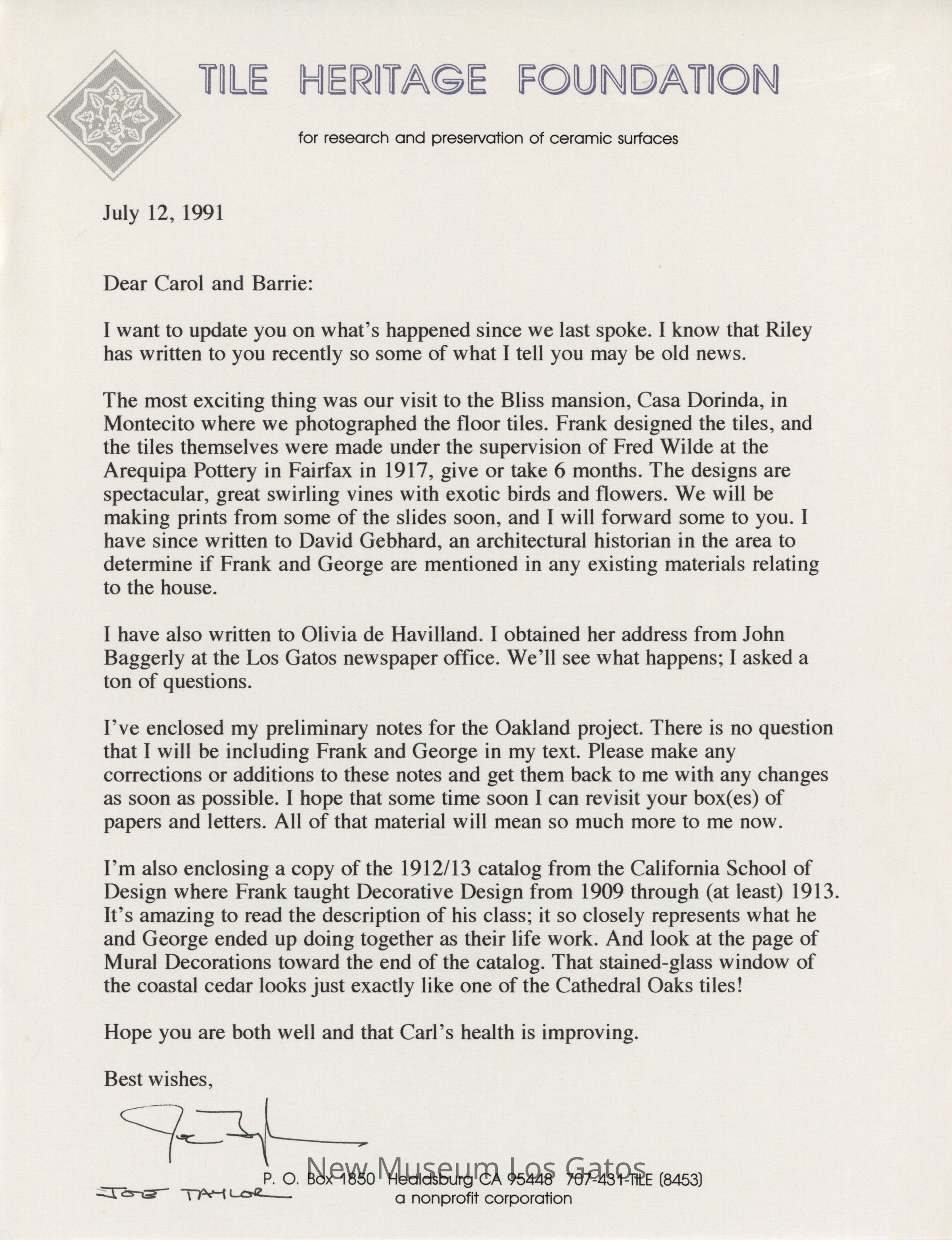 A typed letter from Joe Taylor to Carol and Barrie Coate, dated July 12, 1991. The letter is in regards to research Joe Taylor is doing on Frank Ingerson and George Dennison, for an upcoming project with the Oakland Museum. The letter is on Tile Heritage Foundation stationery.Collection