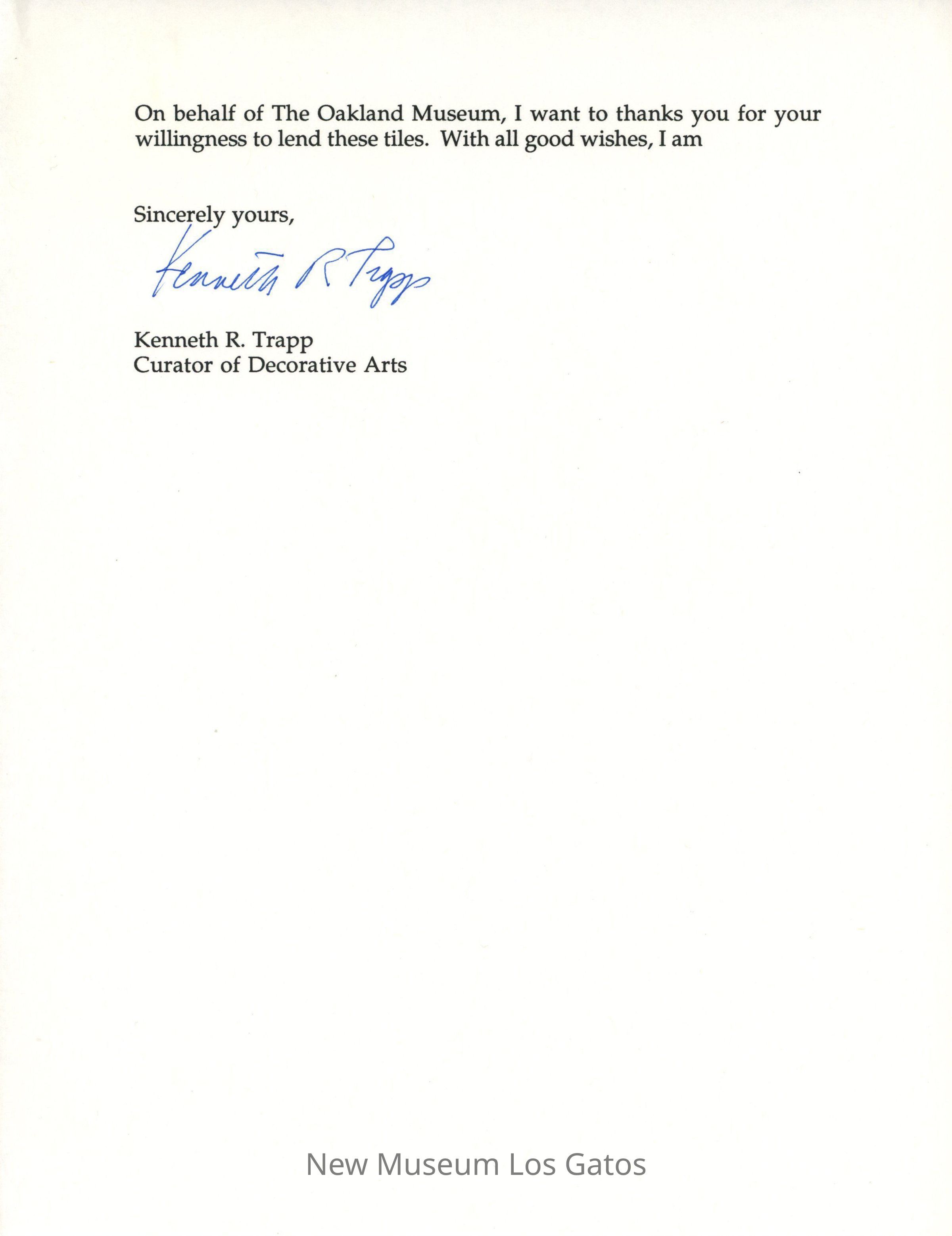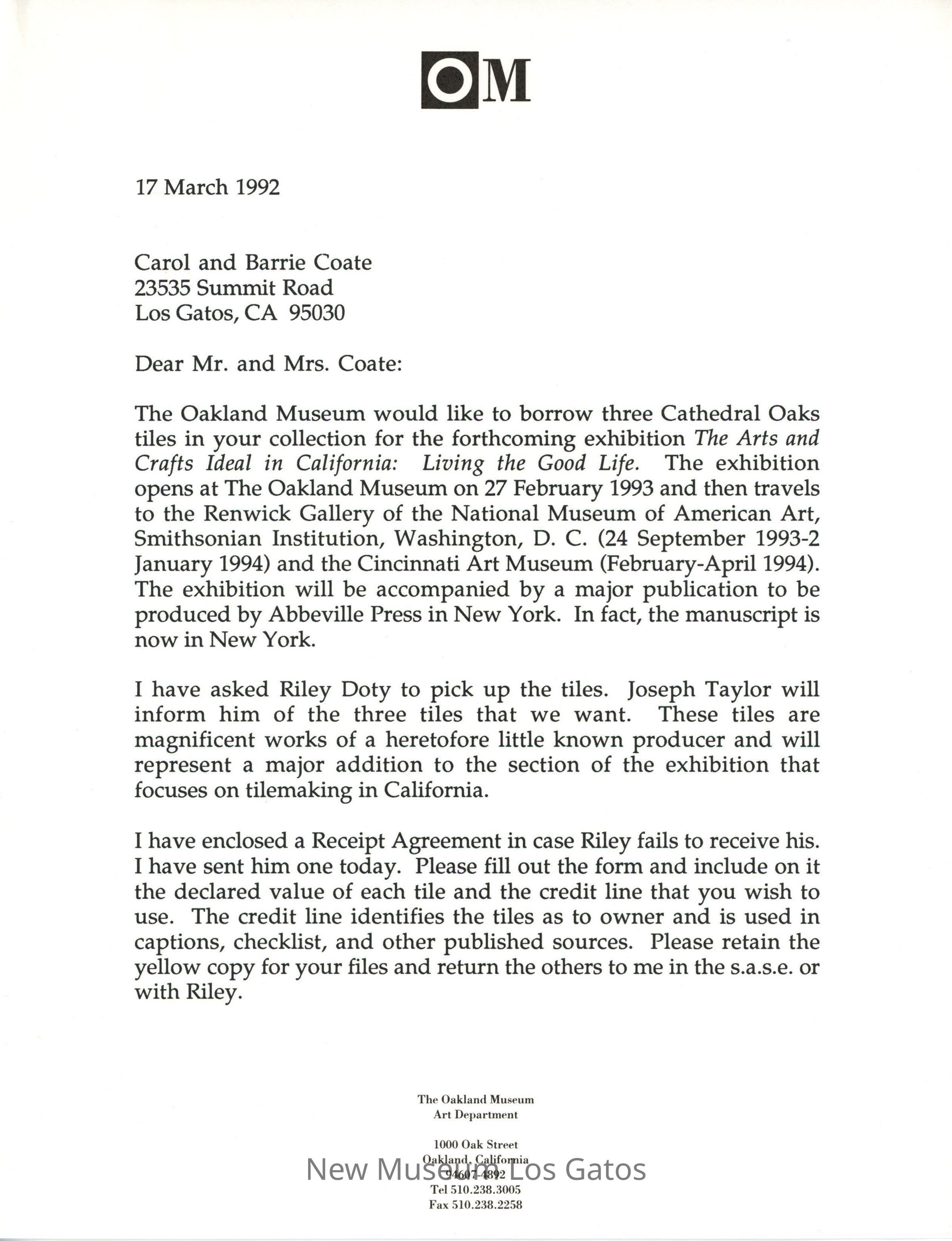 Two page, typed letter to Carol and Barrie Coate, from Kenneth Trapp for the Oakland Museum. The letter is a request to borrow three ceramic tiles, made by Frank Ingerson and George Dennison at Cathedral Oaks, for the "The Arts and Crafts Ideal in California: Living the Good Life" exhibition at the Oakland Museum. The letter is dated March 17, 1992. The letter is signed by Kenneth Trapp.Collection