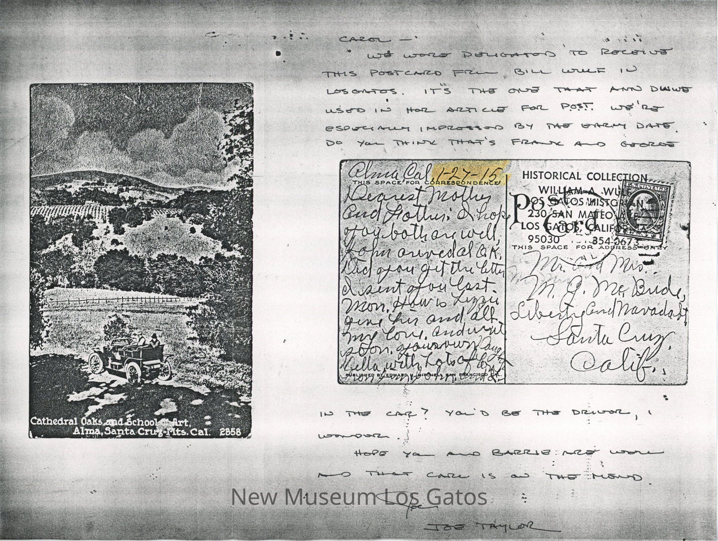 The letter has a scan of a postcard, with a photograph of two men in a car overlooking a vineyard; titled Cathedral Oaks and School of Art, Alma, Santa Cruz Mts. Cal.