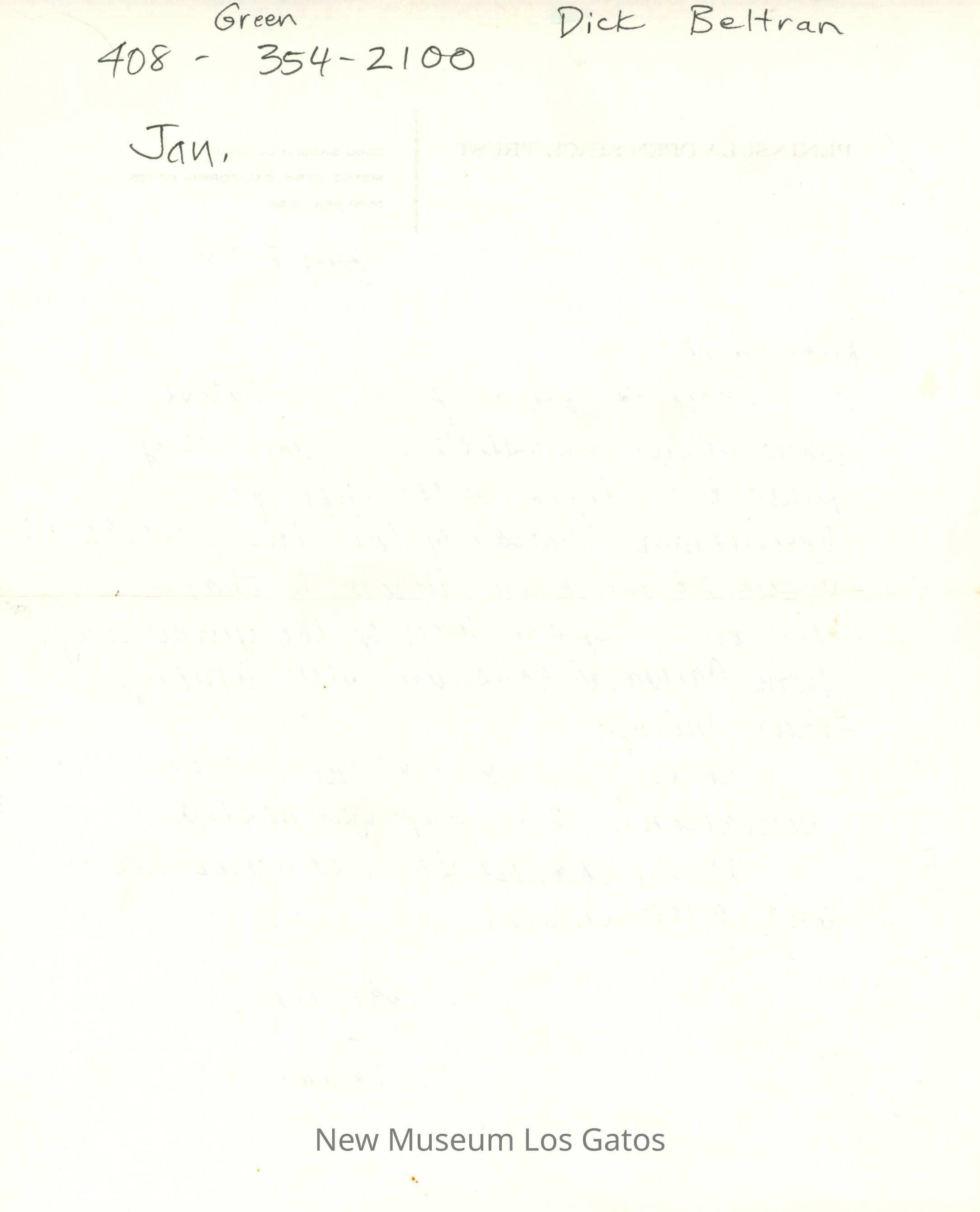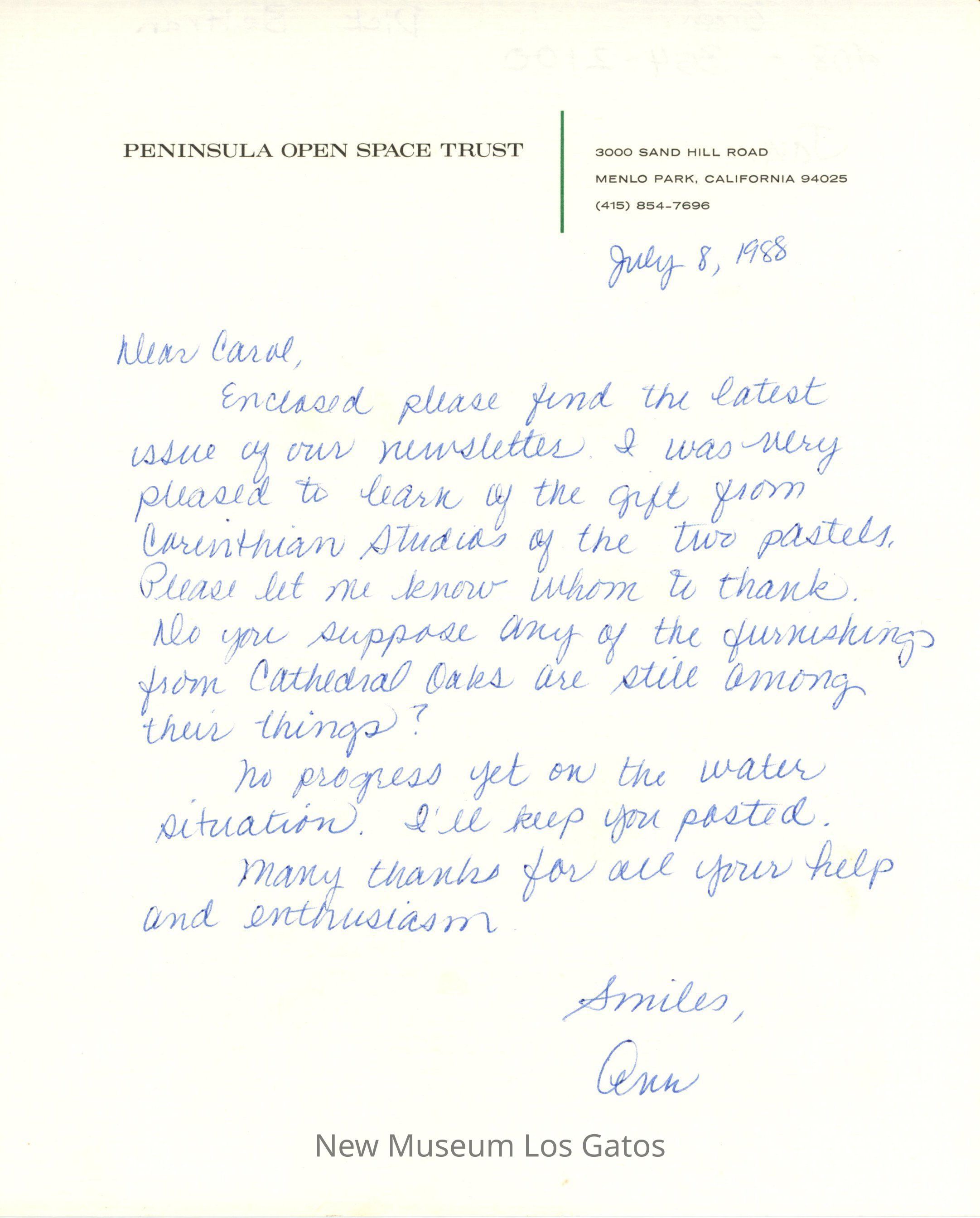 Handwritten letter from Ann Duwe to Carol Coate. The letter is written in blue ink, on Peninsula Open Space Trust stationery. The letter regards two pastel artworks donated from Corinthian Studios, and any other furniture items left at Cathedral Oaks.Collection