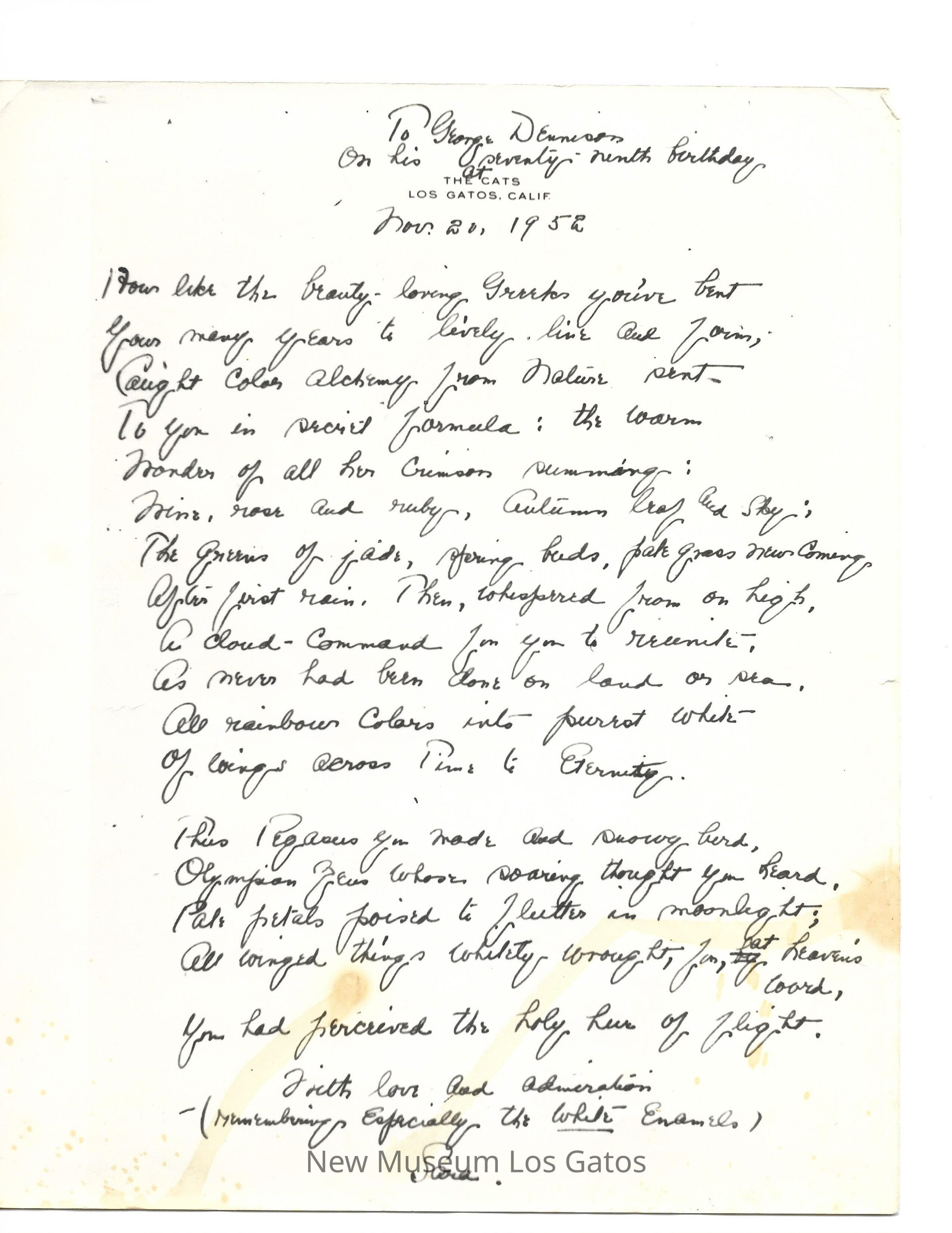 Letter to George Dennison, from Sara Bard Field Wood, on the occasion of his seventy-ninth birthday.