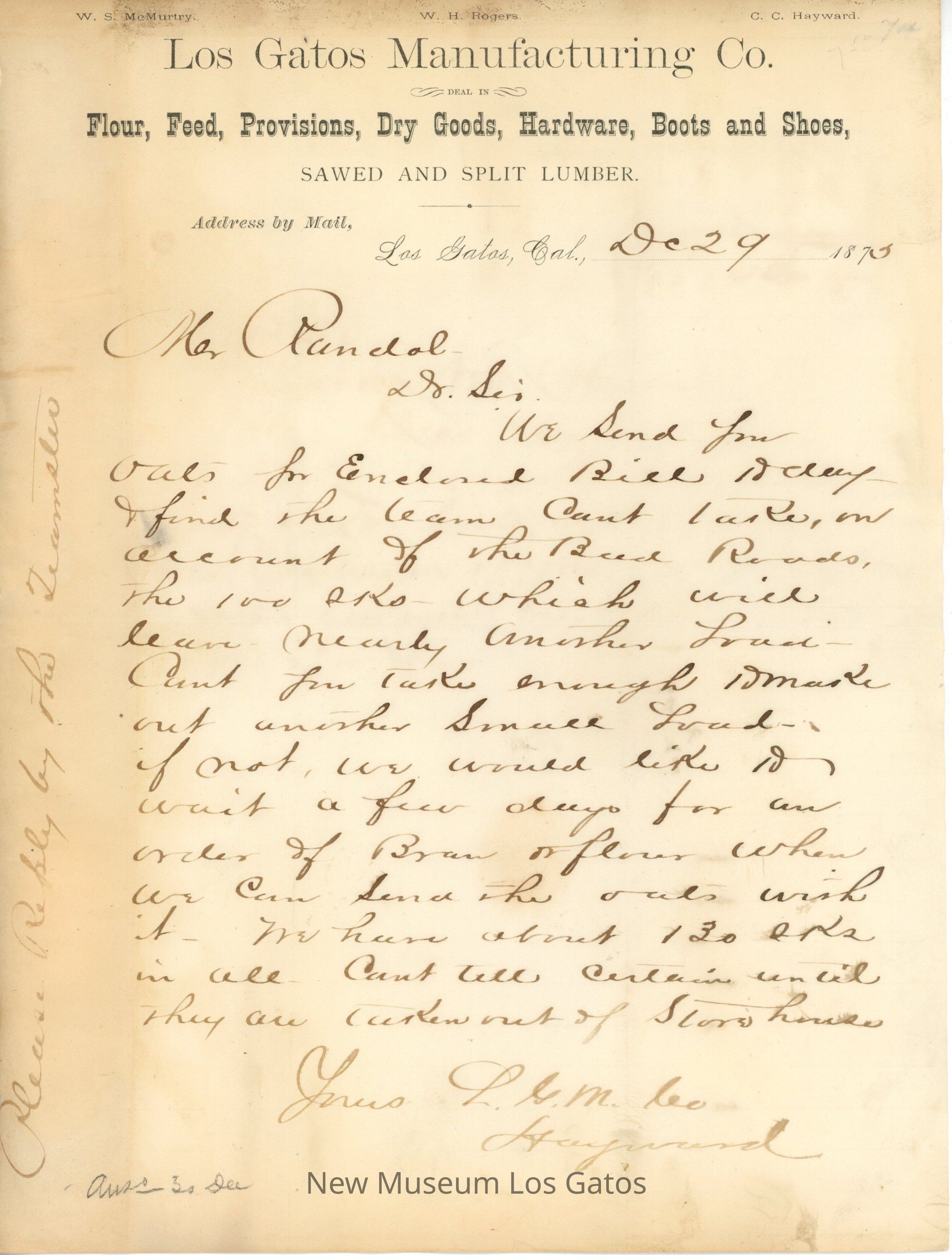 A handwritten letter on Los Gatos Manufacturing Company letterhead, to Mr. Randall from Mr. Hayward, regarding the delivery of Mr. Randal's order.Subject