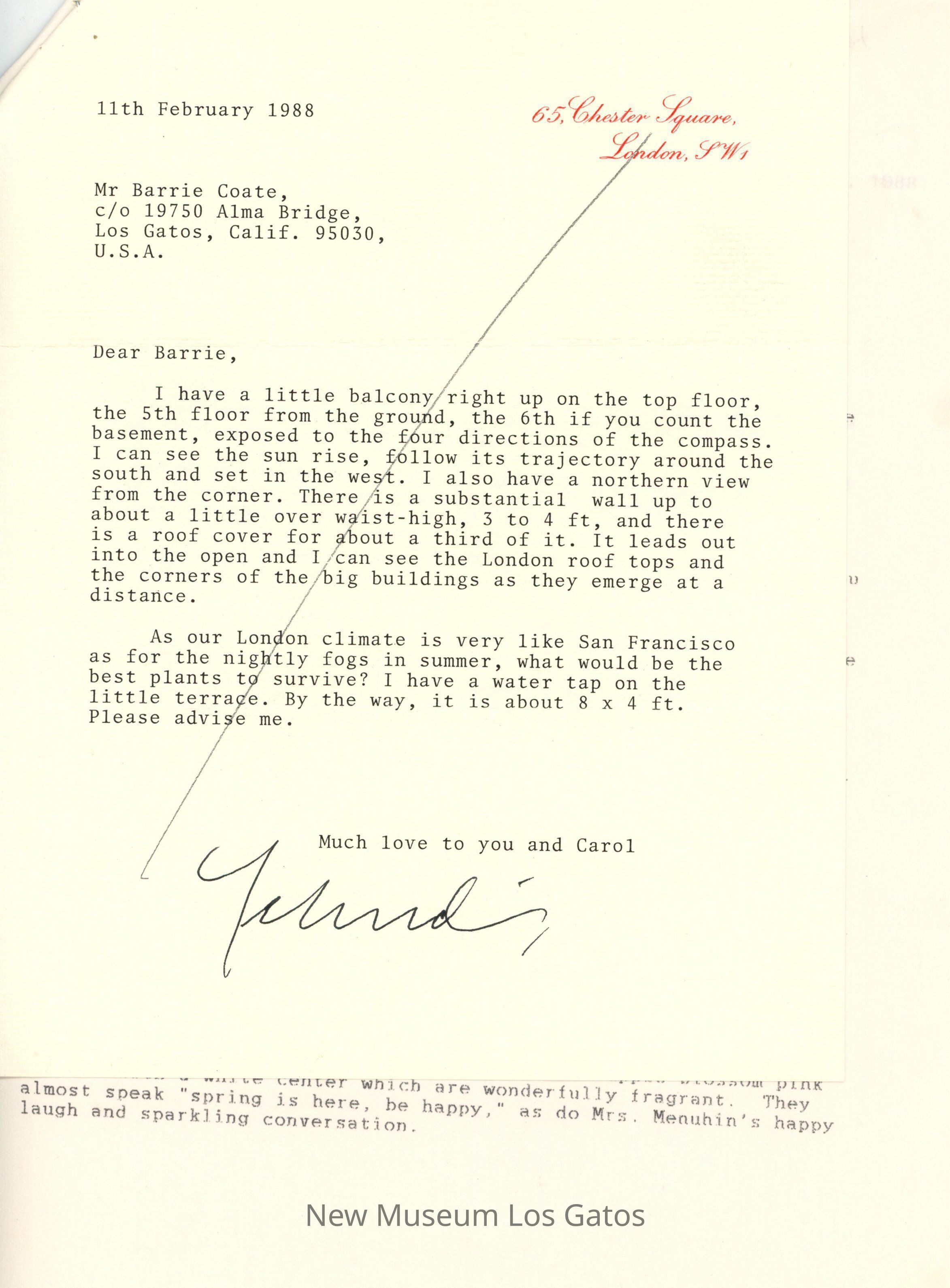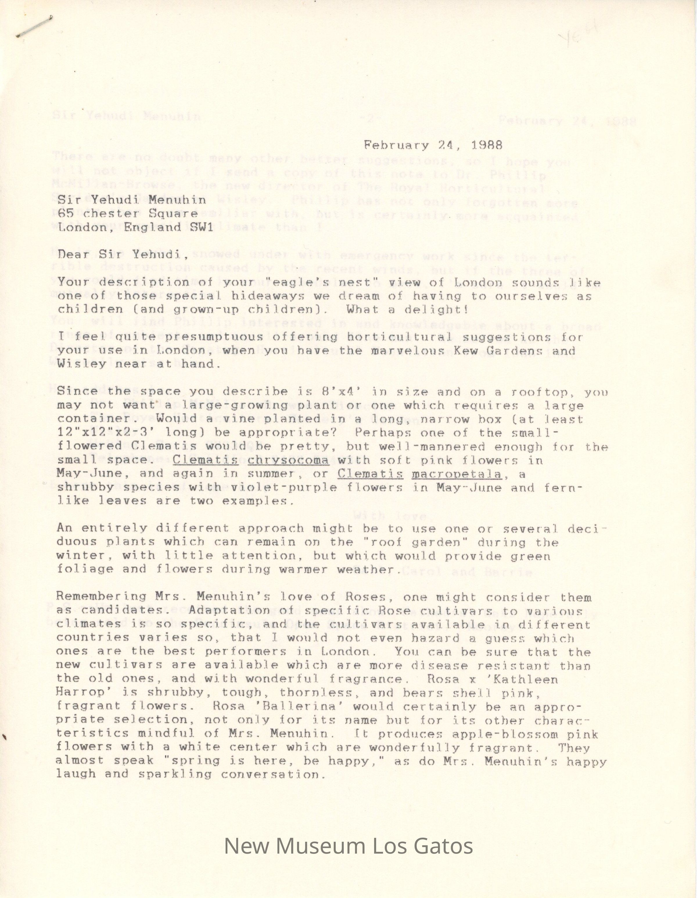 Remembering Mrs. Menuhin's love of Roses, one might consider them as candidates. Adaptation of specific Rose cultivars to various climates is so specific, and the cultivars available in different countries varies so, that I would not even hazard a guess which ones are the best performers in London. You can be sure that the new cultivars are available which are more disease resistant than the old ones, and with wonderful fragrance. Rosa x 'Kathleen Harrop' is shrubby, tough, thornless, and bears shell pink, fragrant flowers. Rosa 'Ballerina' would certainly be an appropriate selection, not only for its name but for its other characteristics mindful of Mrs. Menuhin. (It produces apple-blossom pink flowers with a white center which are wonderfully fragrant. They almost speak "spring is here, be happy" as do Mrs. Menuhin's happy laugh and sparkling conversation.