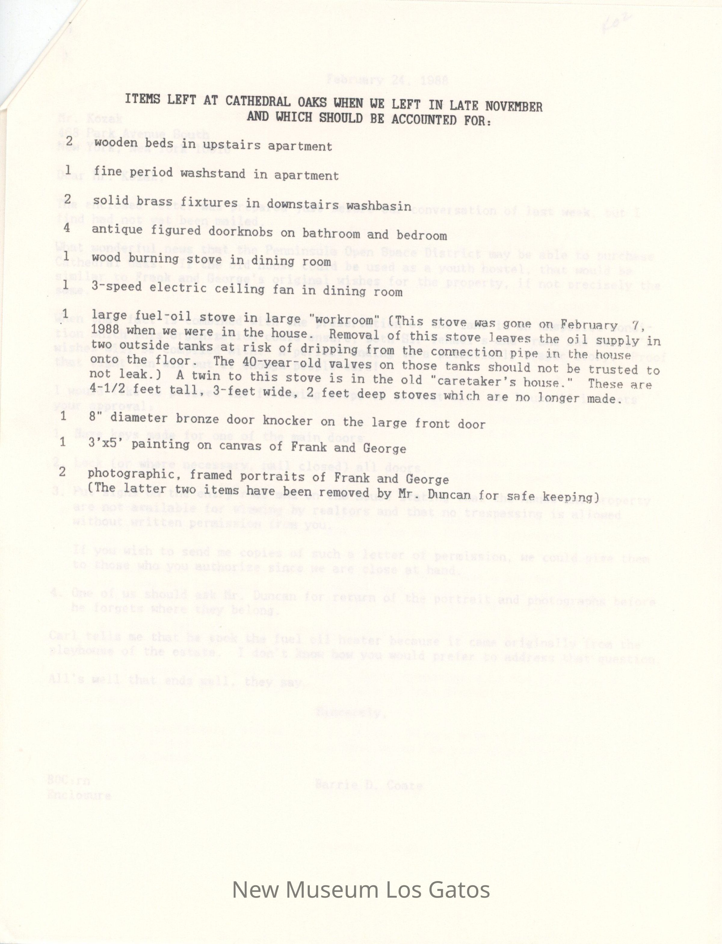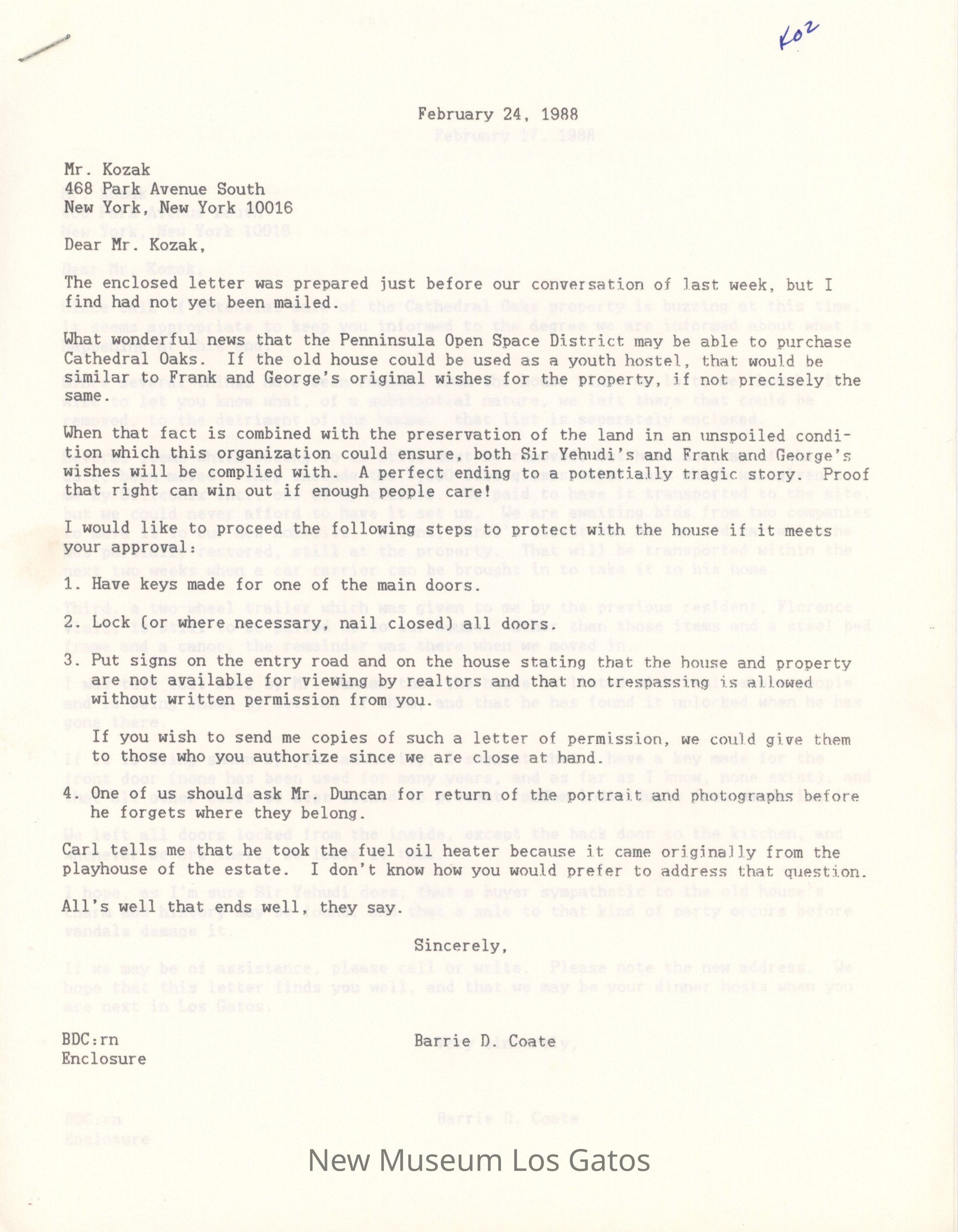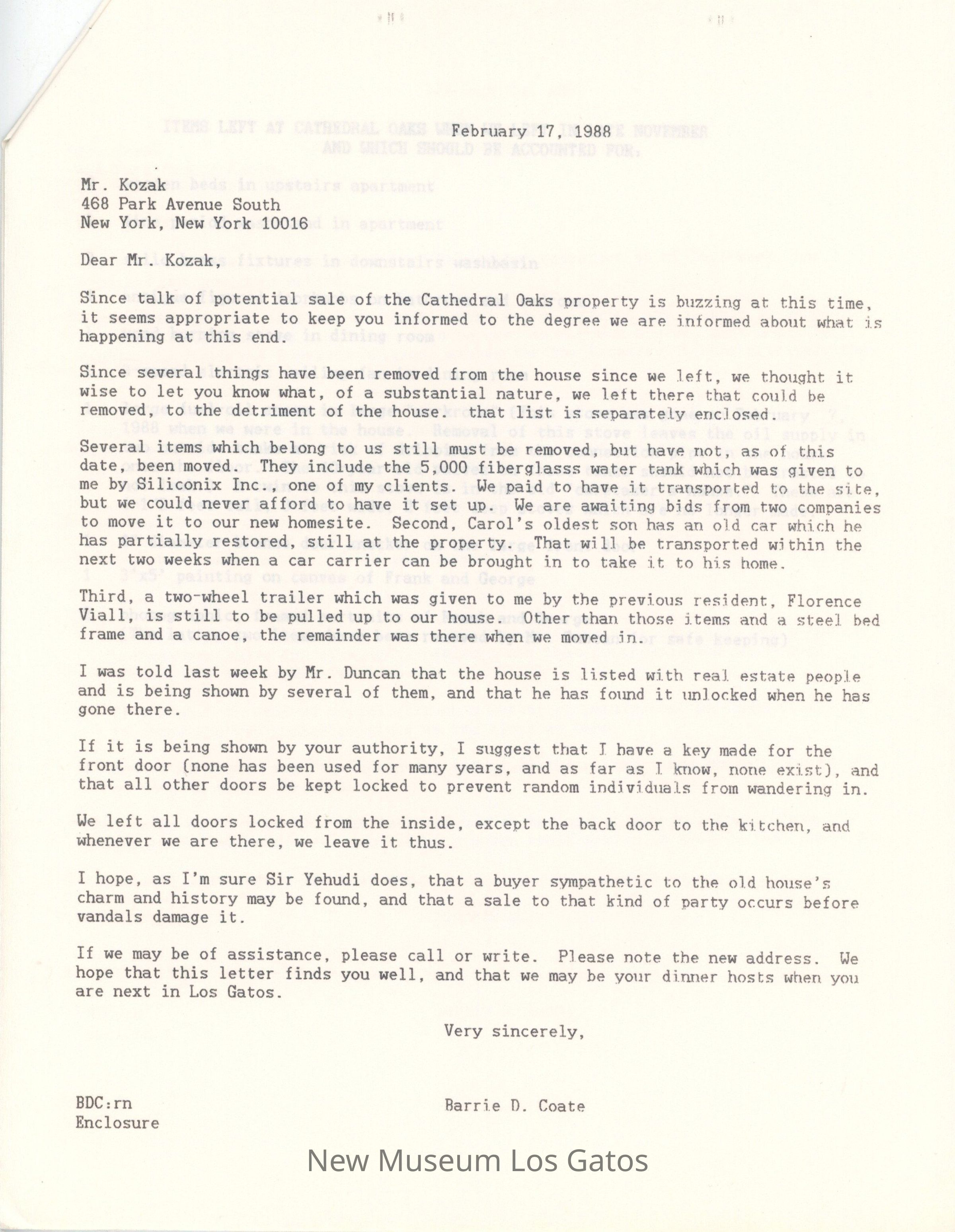 Multiple photocopies of letters from Barrie Coate to Aaron Kozak, accountant to Yehudi Menuhin. The letters are dated February 17 and 24th, 1988. There is an attached list of items left at Cathedral Oaks, for consideration upon selling of the estate.Collection