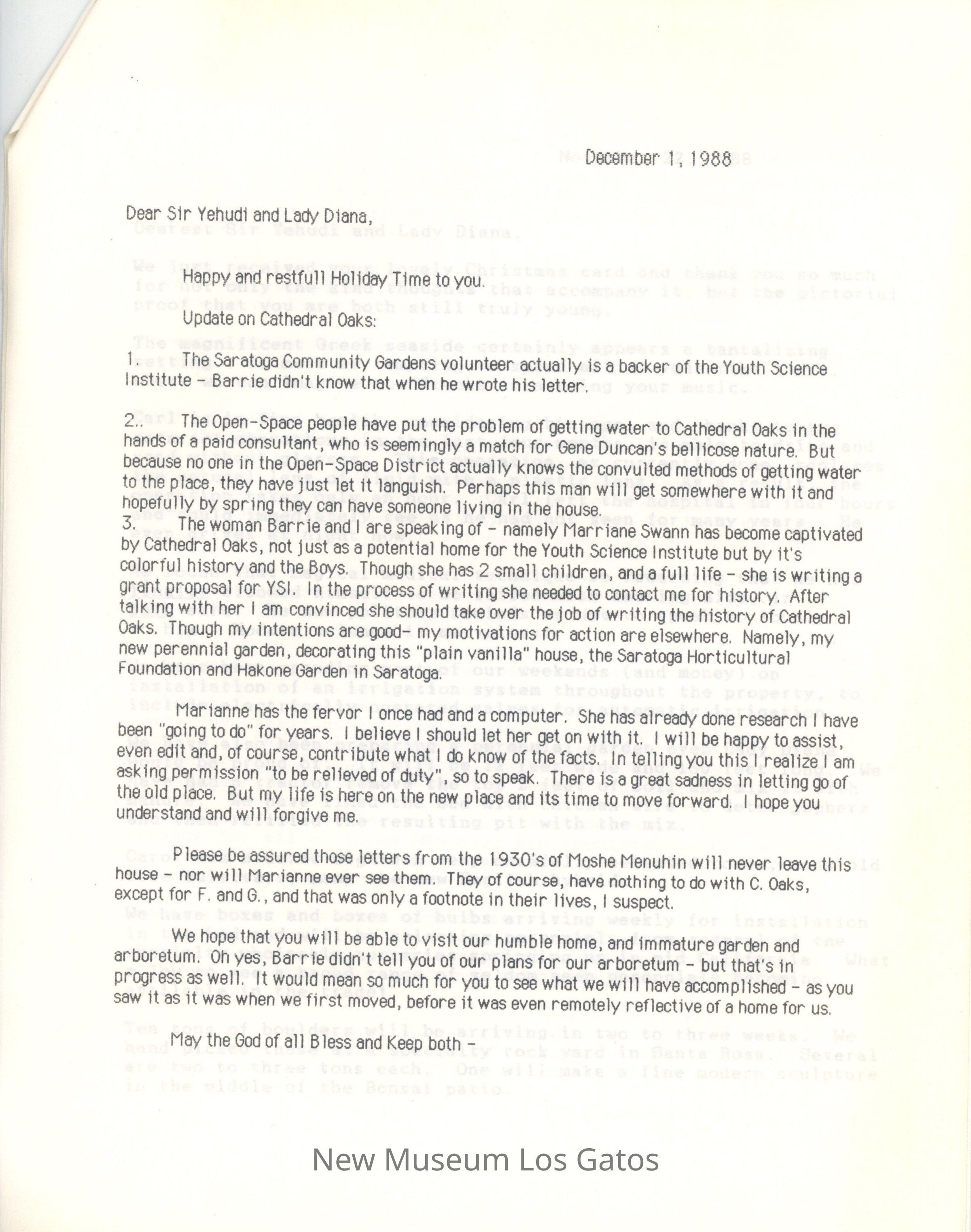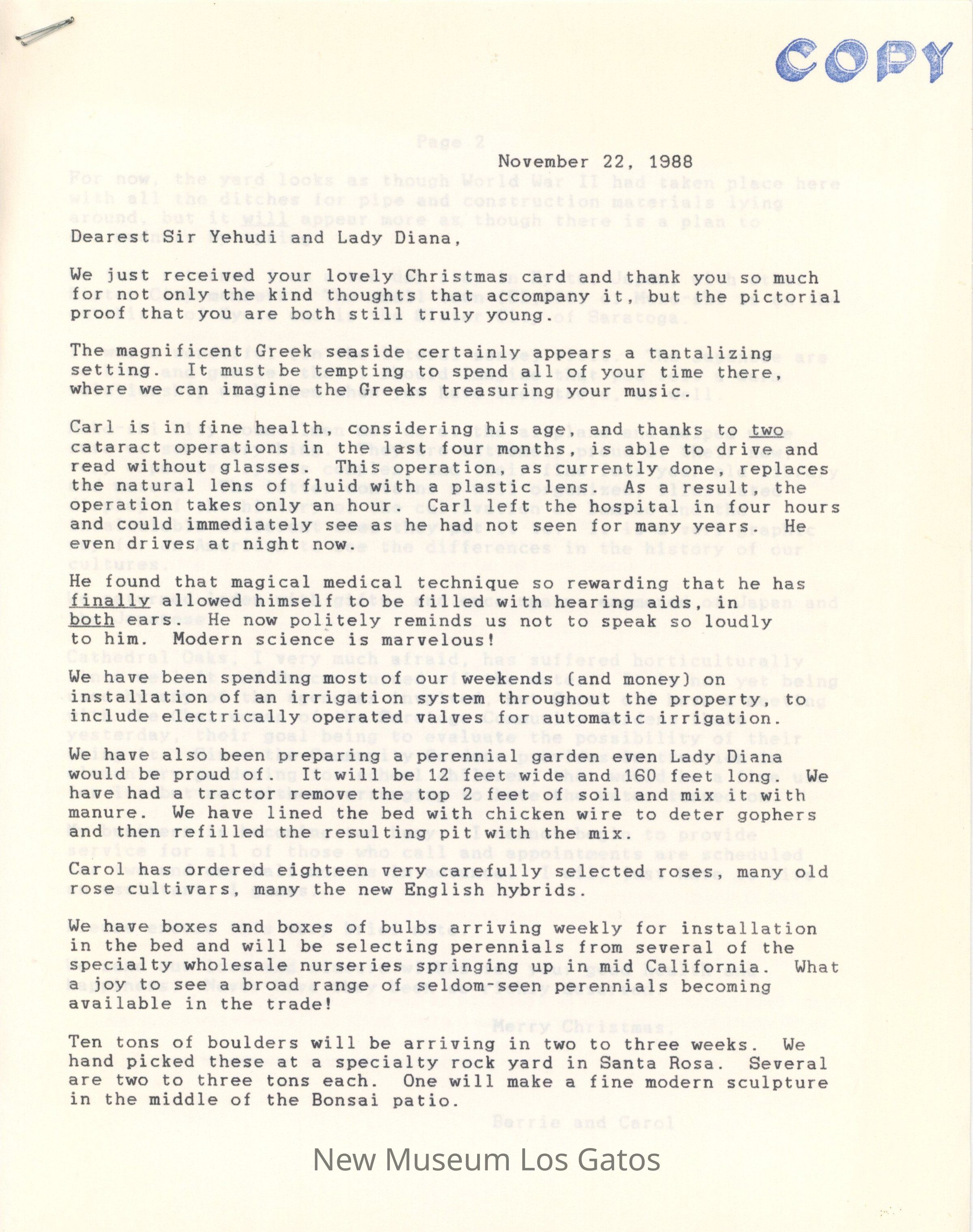 A two page letter, photocopies, from Carol and Barrie Coate to Yehudi Menuhin. There is an identical copy of the letter stapled and attached, as well as a copy of a different letter attached. The letters are dated November 22, 1988 and December 1st, 1988.Collection